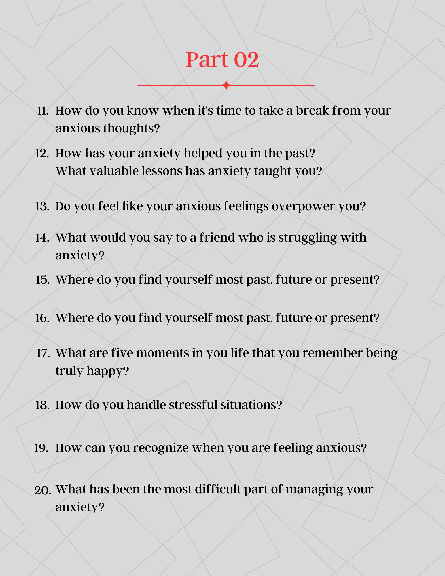 Discover pathways to understanding and managing anxiety with our 100 Deep Anxiety Prompts. This thoughtfully crafted collection encourages you to explore the roots of your anxious thoughts, identify triggers, and develop greater self-awareness. Designed to be used for journaling, therapy, or personal reflection, these prompts help you confront fears, challenge negative patterns, and cultivate resilience. By facing your anxieties head-on, you can gain insight, reduce stress, and foster a sense of calm and empowerment. Take the first step toward emotional well-being with these supportive and insightful prompts.