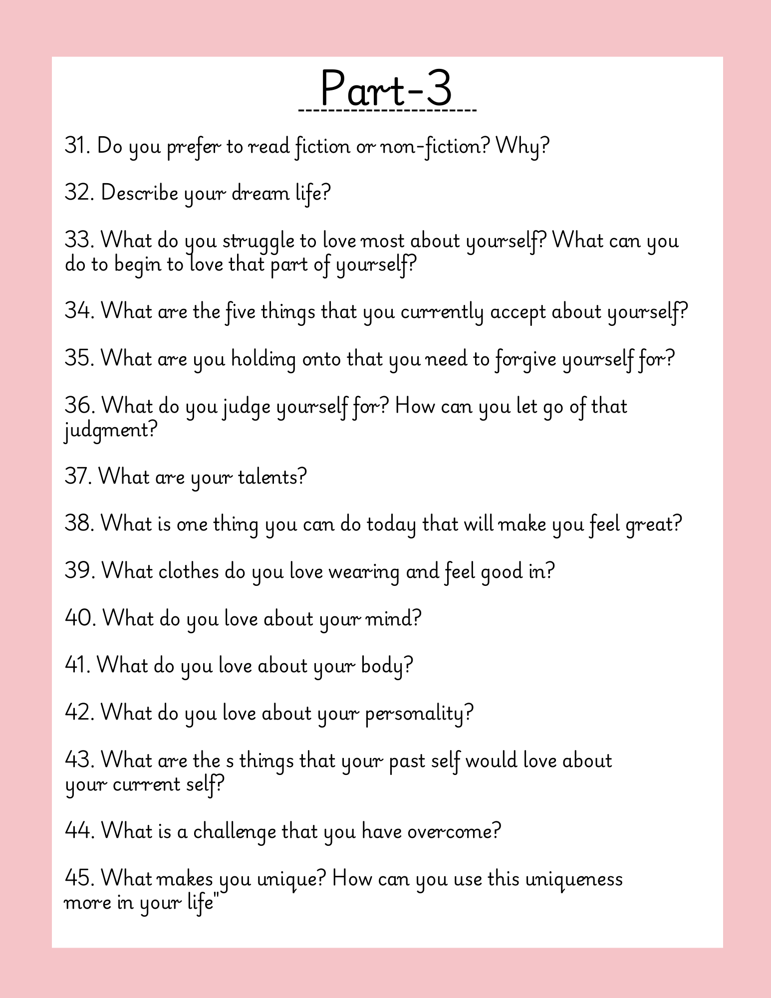 Unlock the power of introspection with our 115 Deep Mental Prompts. Designed to challenge your thoughts and encourage meaningful self-reflection, these prompts delve into your beliefs, motivations, fears, and aspirations. Perfect for journaling, therapy, or personal growth, this collection helps you explore the depths of your mind, uncover hidden truths, and gain greater clarity about yourself and your life's direction. Whether you're seeking to overcome mental barriers or simply want to deepen your understanding of your inner world, these prompts are a valuable tool for fostering mental clarity and emotional resilience. Start your journey inward today with these thought-provoking prompts.