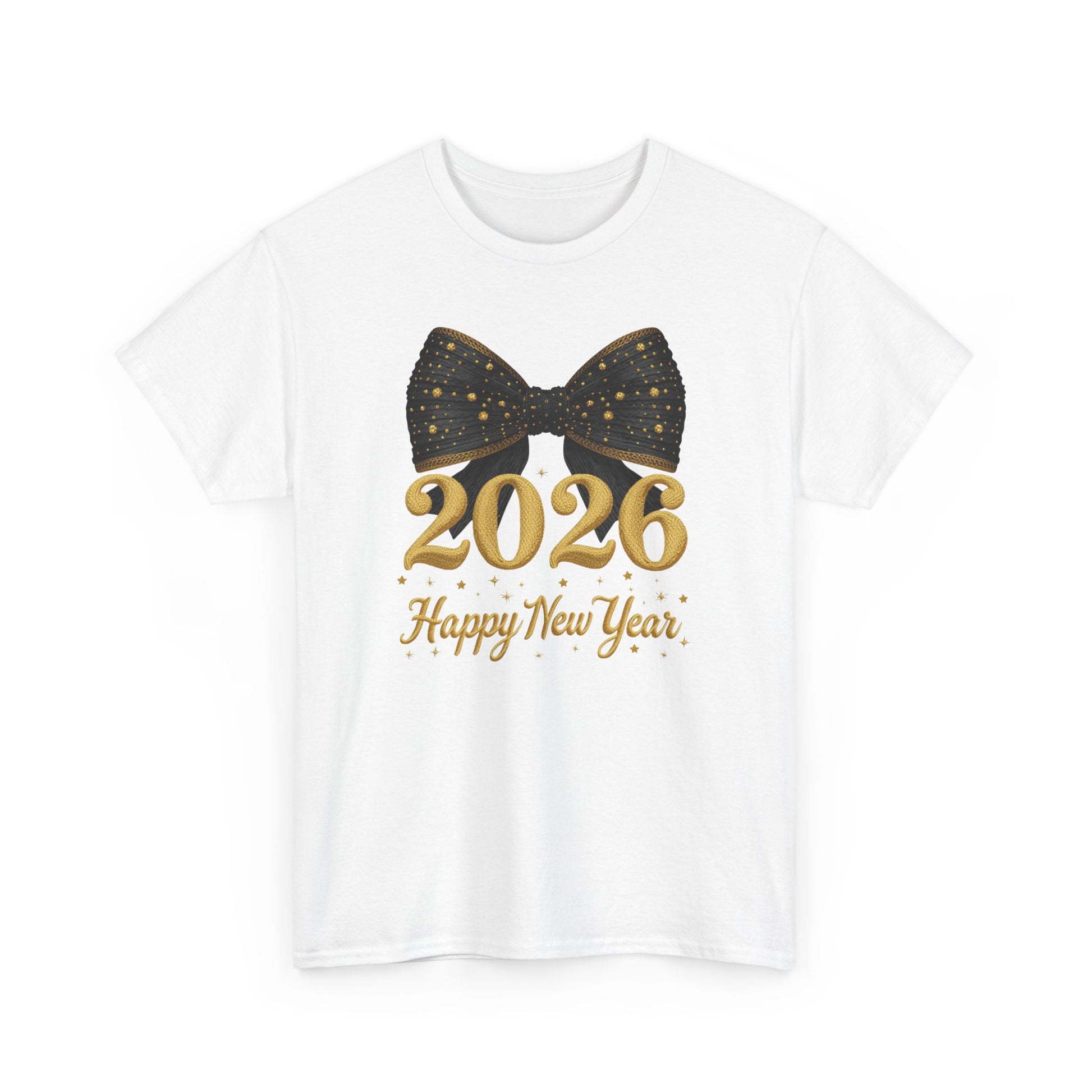 Celebrate the turn of the year with a relaxed, festive tee that feels like midnight confetti and slow laughter. This classic crew neck shirt carries a chic black bow and bold golden “2026” with a cursive “Happy New Year” beneath — low-key glamour that slips easily into a countdown party, casual gathering, or cozy night in with friends. The unstructured fit lets you move, dance, and toast without fuss; the soft, durable cotton keeps the print crisp and the shirt comfortable through the season and beyond. Wear it with jeans and a blazer for a modern, understated look, or layer under a cardigan for a quieter celebration at home. It’s a simple way to mark a new chapter with style and comfort.