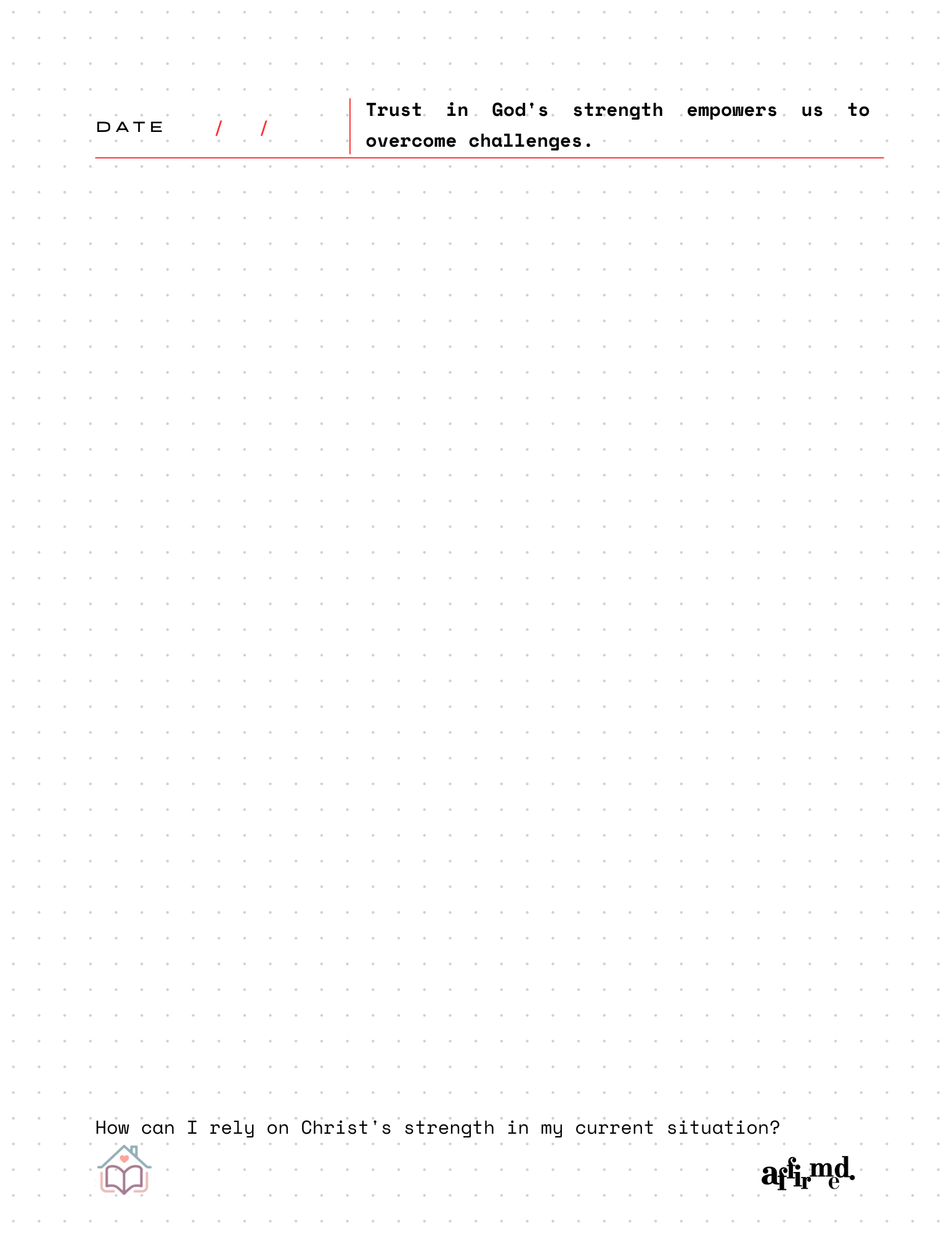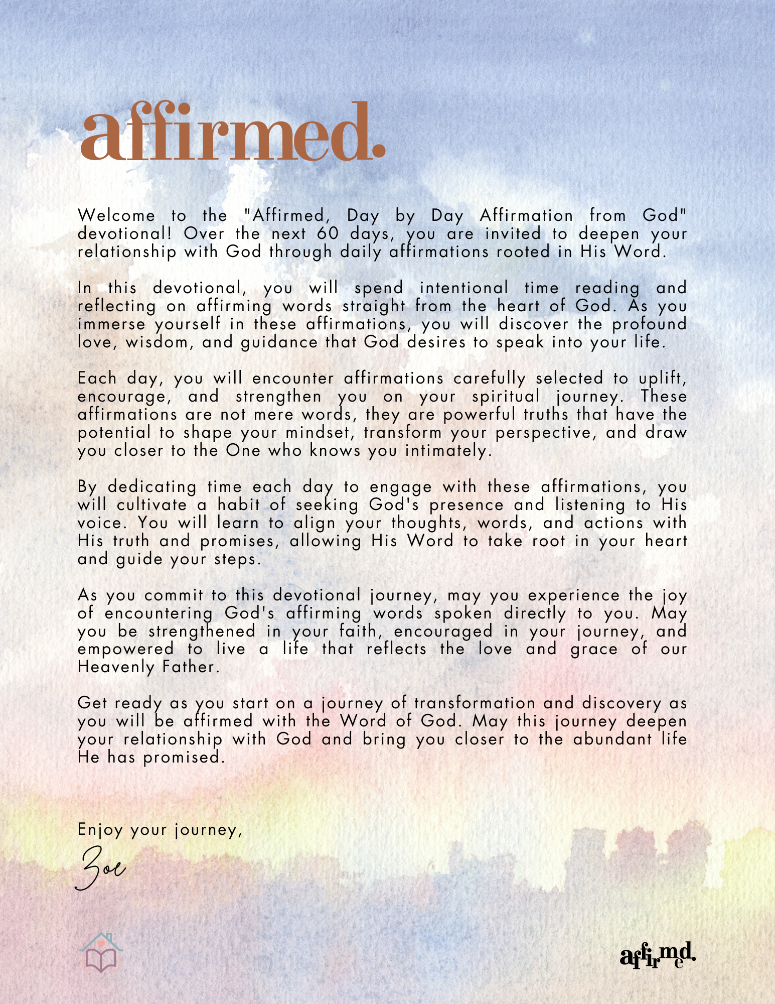 Deepen your faith and connection with God through "Affirmed: 60 Days of Daily God-Inspired Affirmations." This devotional guides you to reflect on powerful, Scripture-based affirmations each day, uplifting your spirit, transforming your mindset, and drawing you closer to His love and wisdom. Perfect for daily spiritual growth, this journey encourages intentional reflection, prayer, and a renewed sense of God's presence in your life.