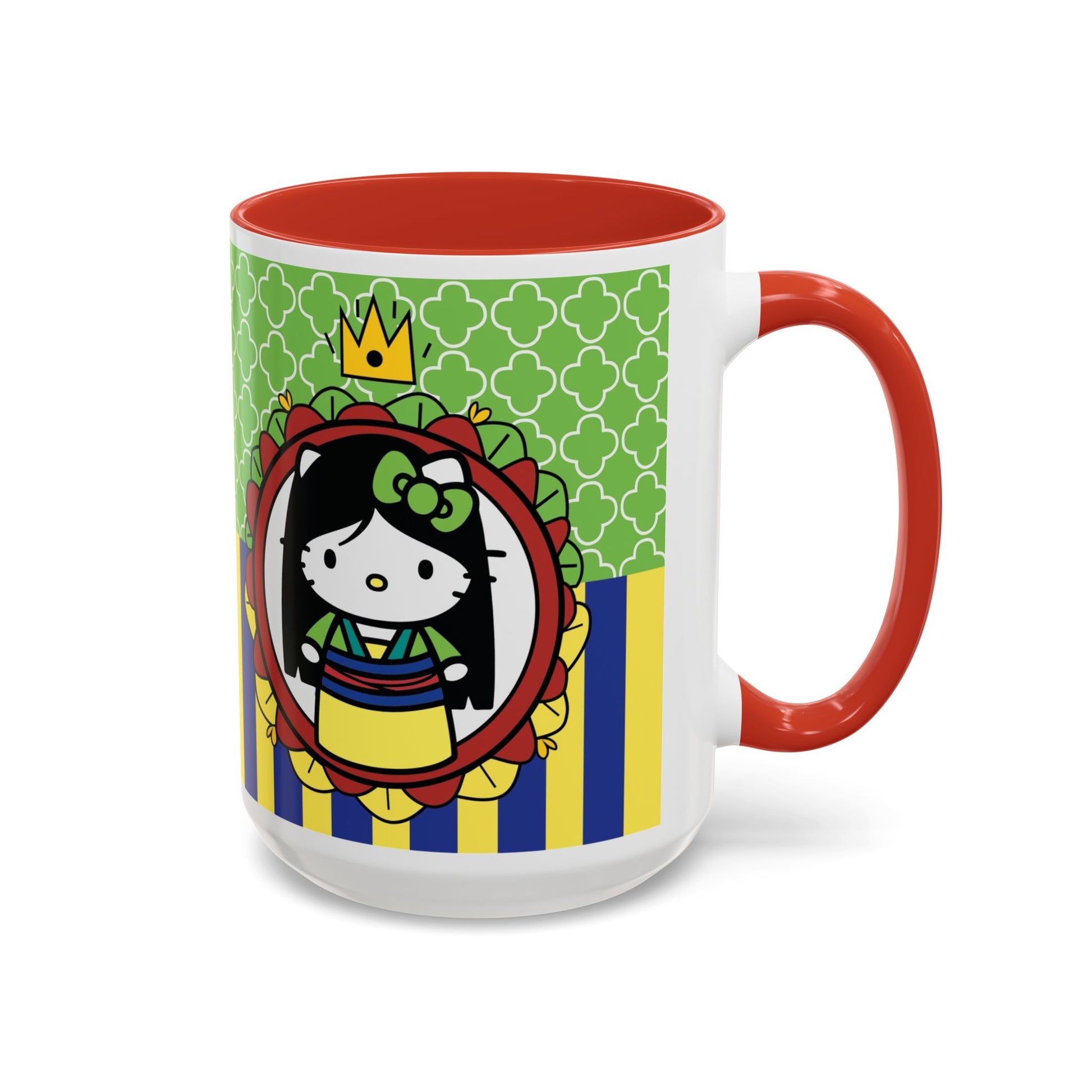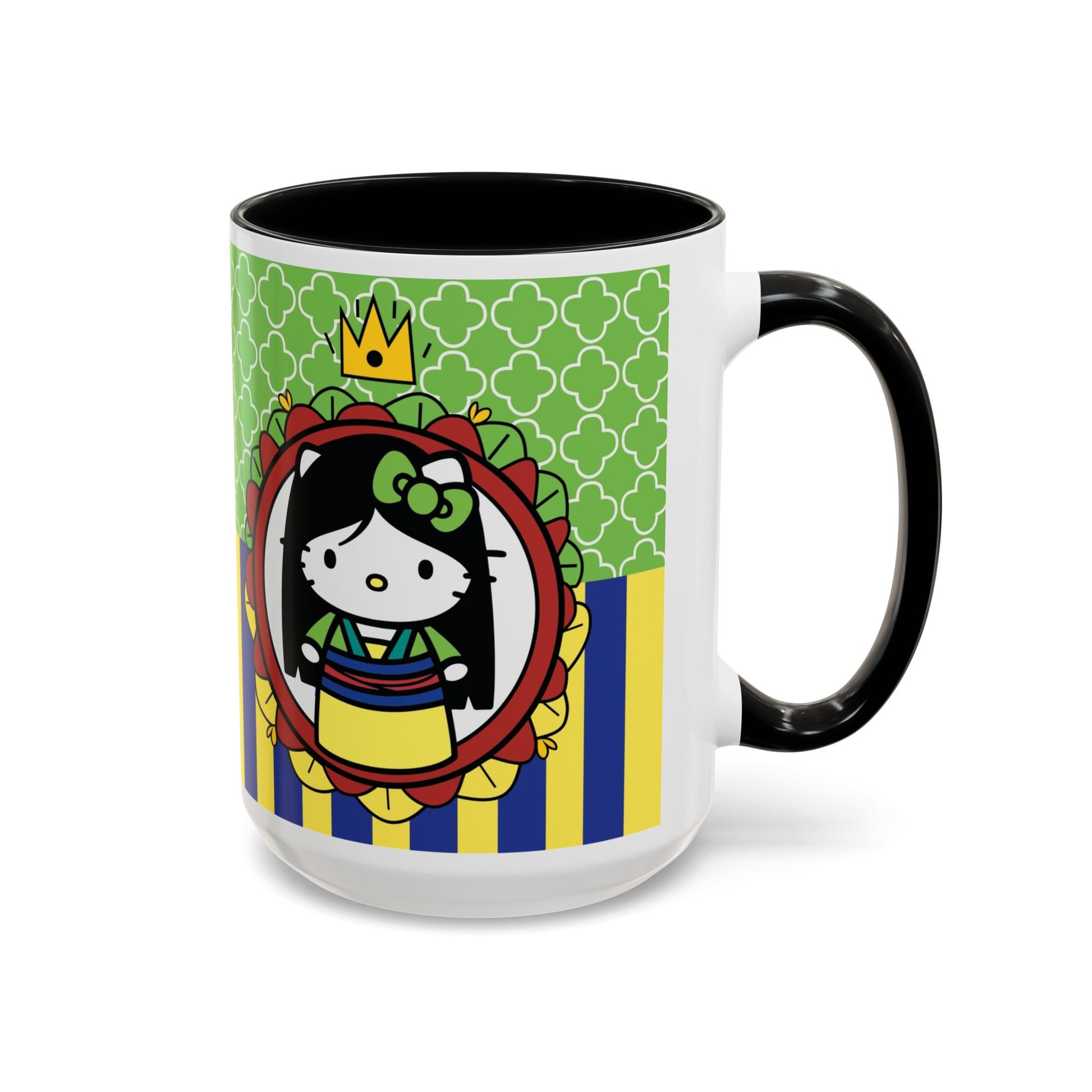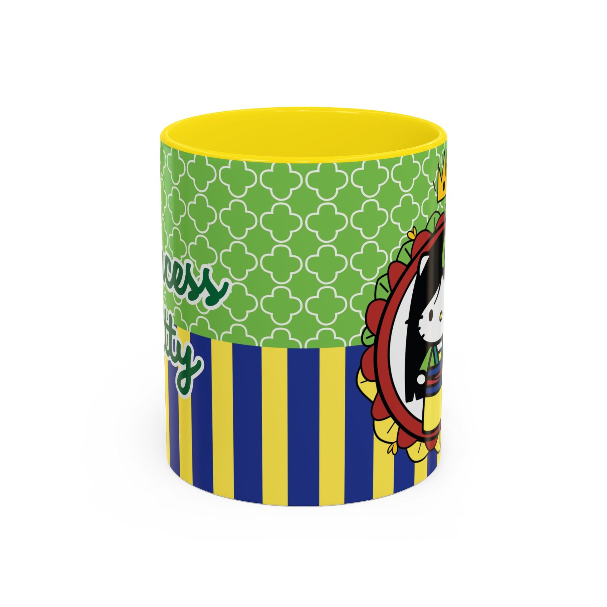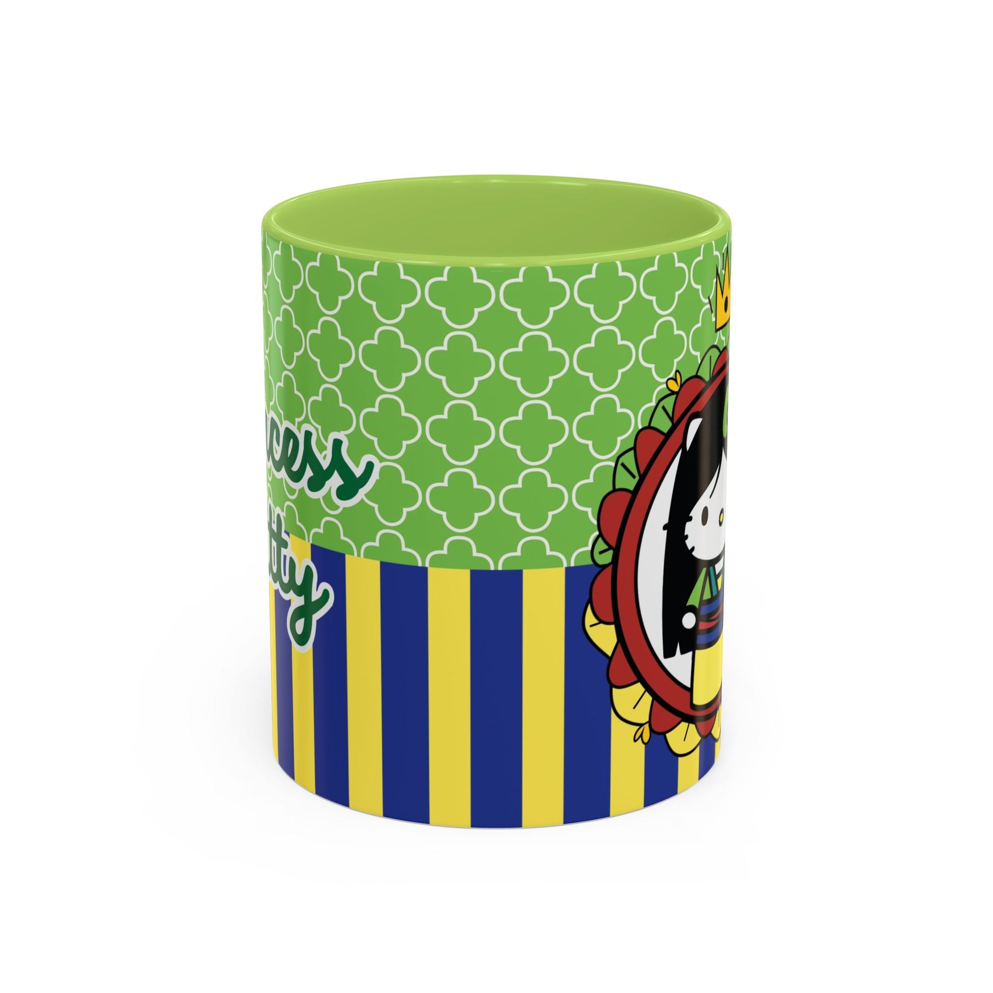 This glossy ceramic mug brings a playful, colorful vibe to everyday coffee, tea, or cocoa. Bright contrasting panels of green quatrefoil and navy-and-yellow stripes frame a whimsical character portrait crowned with a tiny golden crown — lively, childlike, and full of personality. The colored interior and handle add another pop of contrast, making each sip feel a little more joyful. Durable and practical, it slips into a morning routine at home, on a desk between meetings, or as a cheerful companion during study sessions. The design reads like a tiny keepsake: fun for collectors who love quirky characters and for anyone who enjoys bold, graphic color in their kitchenware.