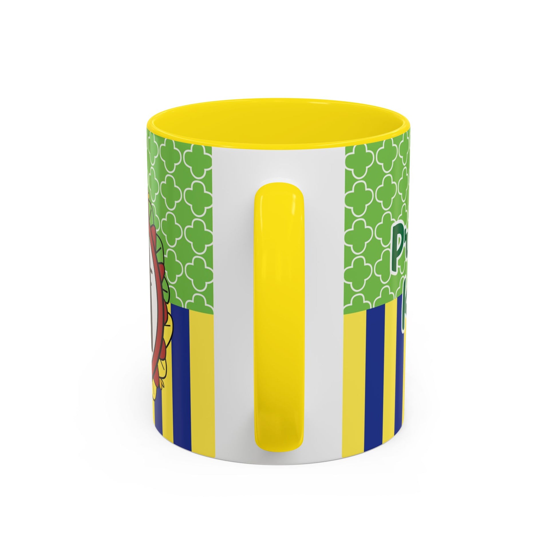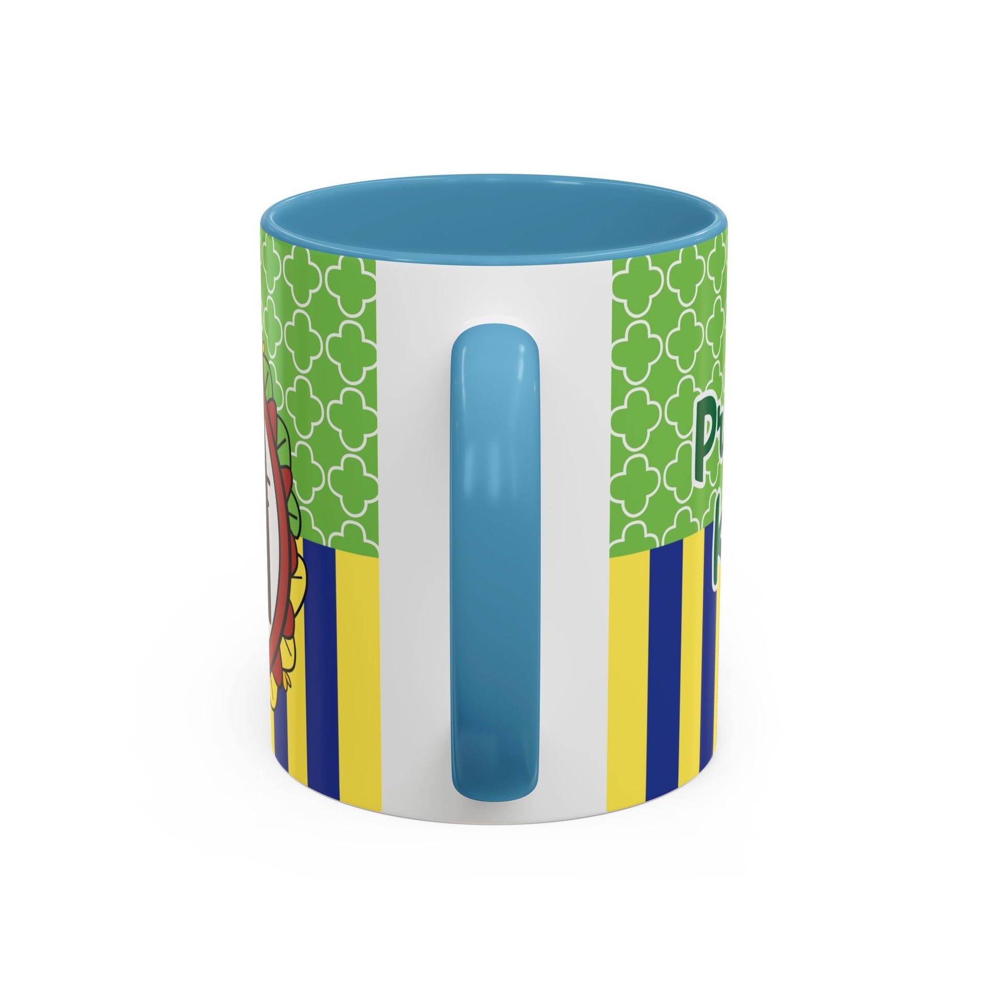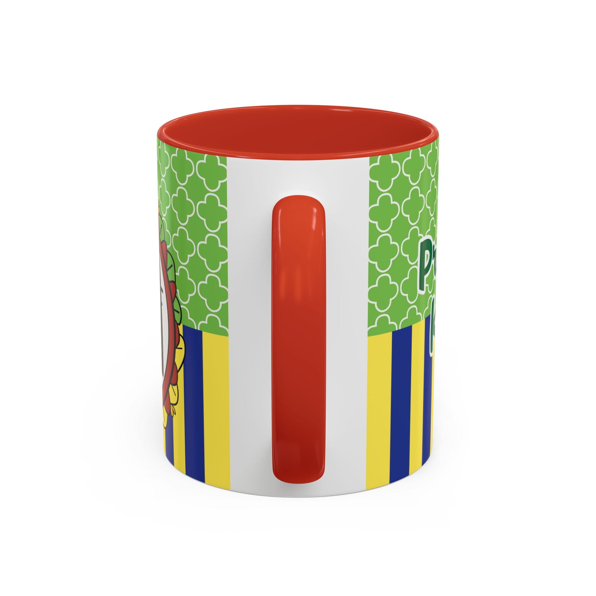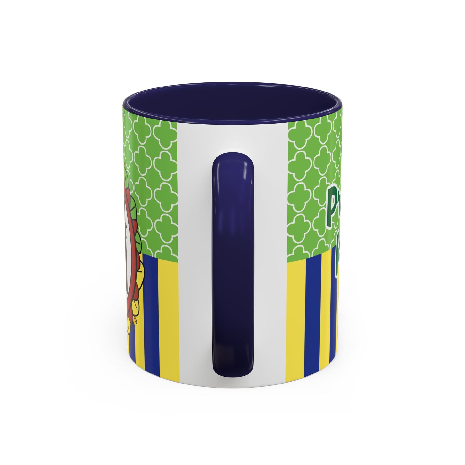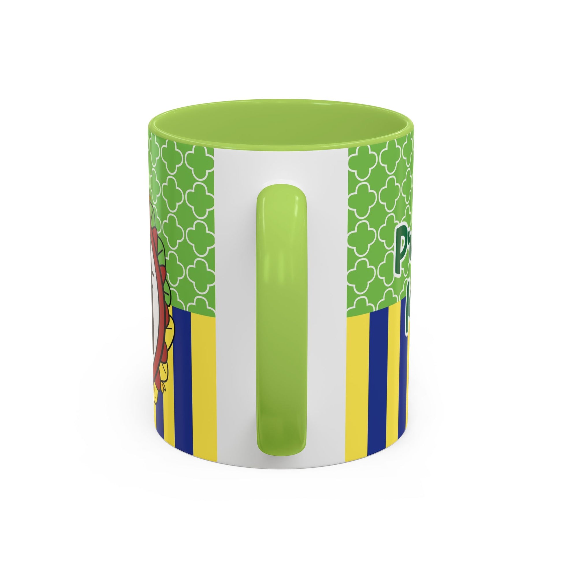 This glossy ceramic mug brings a playful, colorful vibe to everyday coffee, tea, or cocoa. Bright contrasting panels of green quatrefoil and navy-and-yellow stripes frame a whimsical character portrait crowned with a tiny golden crown — lively, childlike, and full of personality. The colored interior and handle add another pop of contrast, making each sip feel a little more joyful. Durable and practical, it slips into a morning routine at home, on a desk between meetings, or as a cheerful companion during study sessions. The design reads like a tiny keepsake: fun for collectors who love quirky characters and for anyone who enjoys bold, graphic color in their kitchenware.
