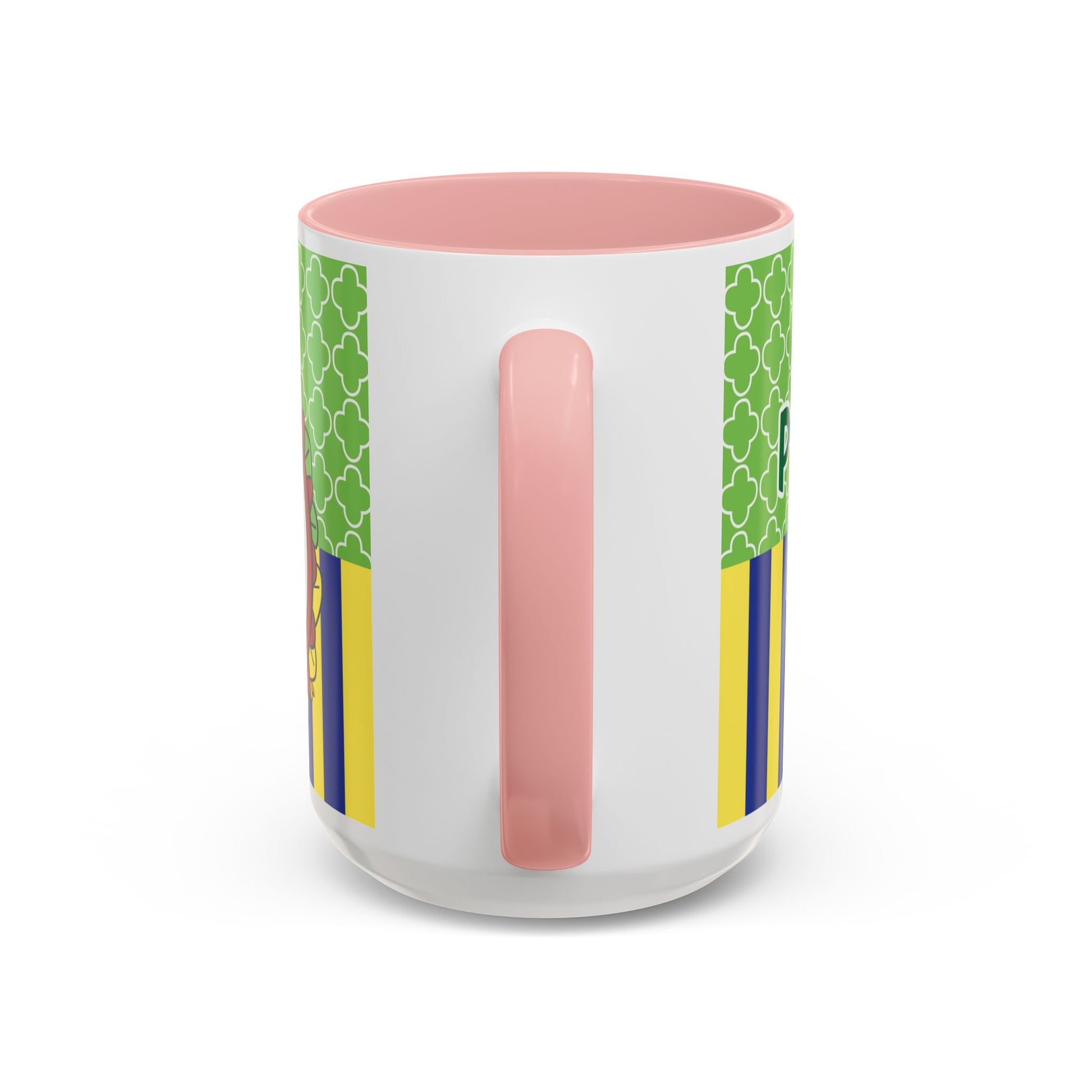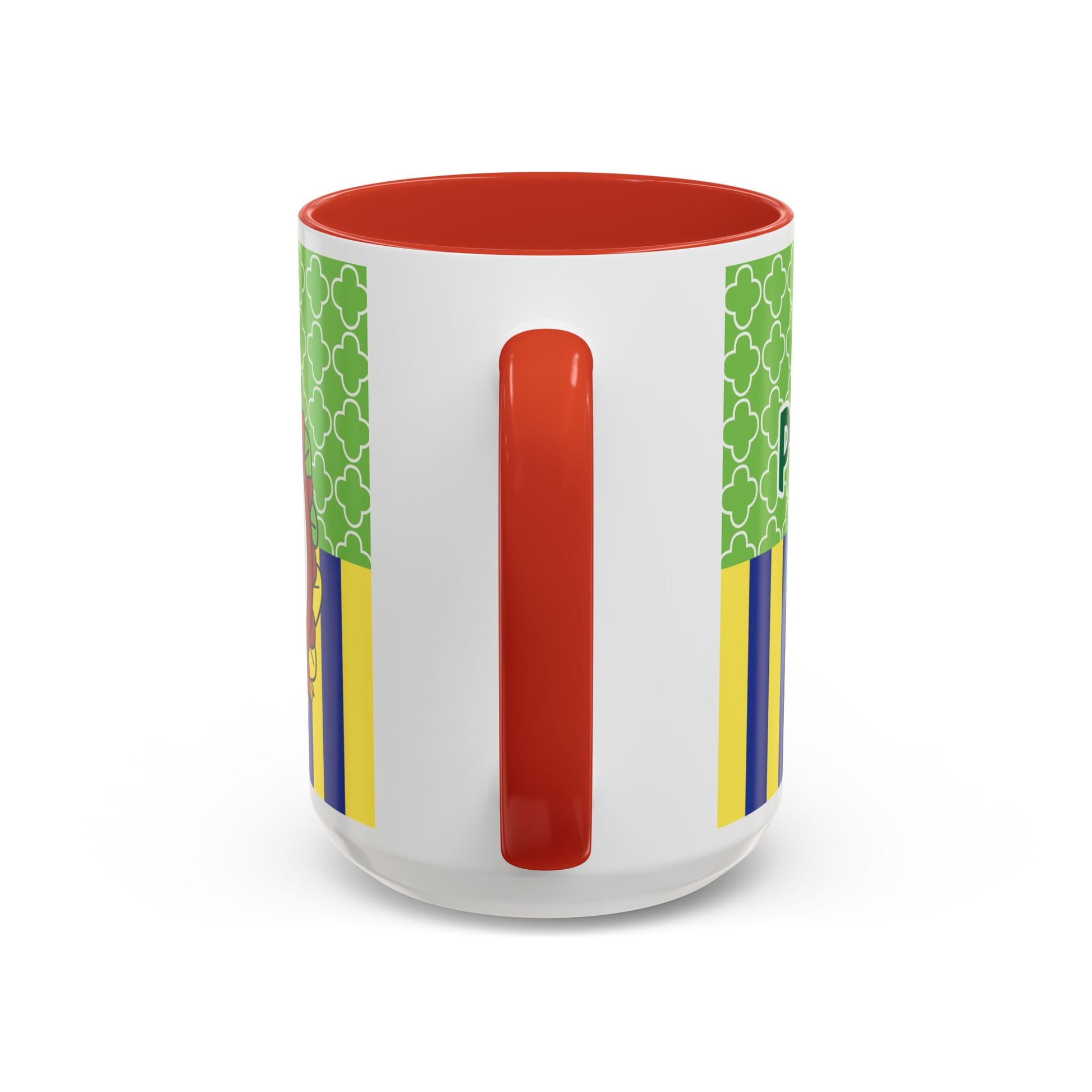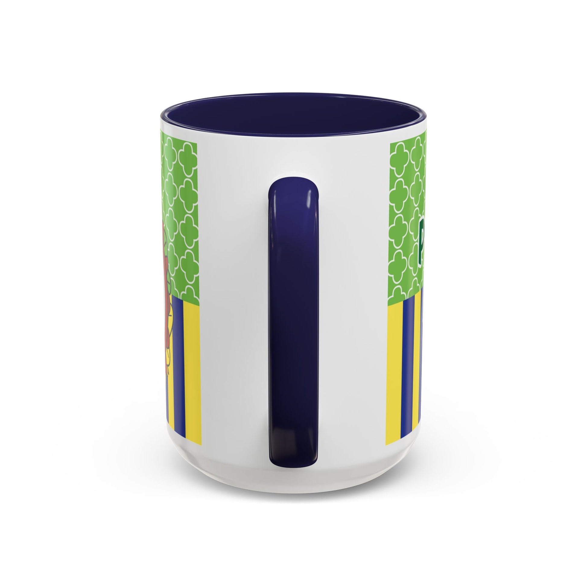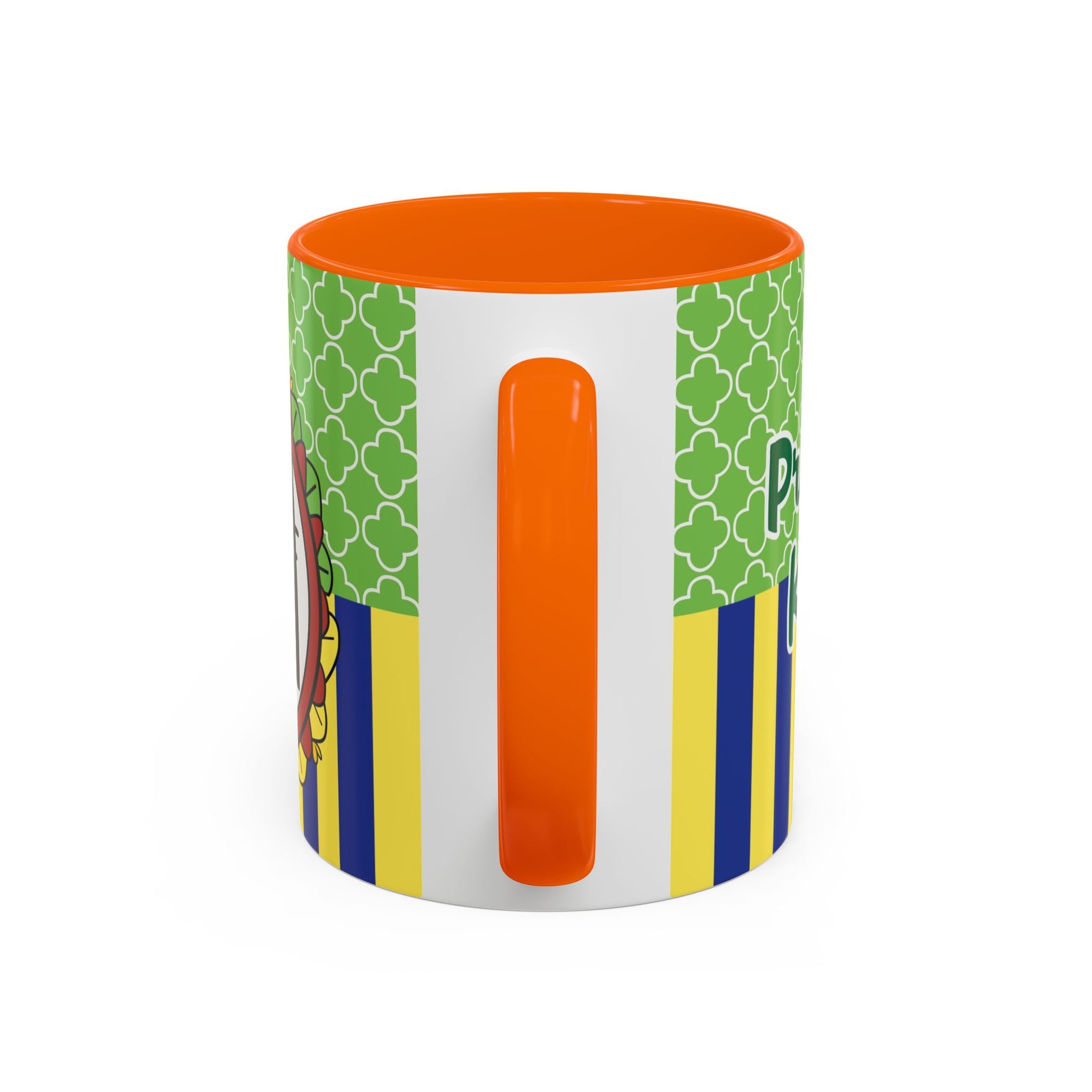 This glossy ceramic mug brings a playful, colorful vibe to everyday coffee, tea, or cocoa. Bright contrasting panels of green quatrefoil and navy-and-yellow stripes frame a whimsical character portrait crowned with a tiny golden crown — lively, childlike, and full of personality. The colored interior and handle add another pop of contrast, making each sip feel a little more joyful. Durable and practical, it slips into a morning routine at home, on a desk between meetings, or as a cheerful companion during study sessions. The design reads like a tiny keepsake: fun for collectors who love quirky characters and for anyone who enjoys bold, graphic color in their kitchenware.