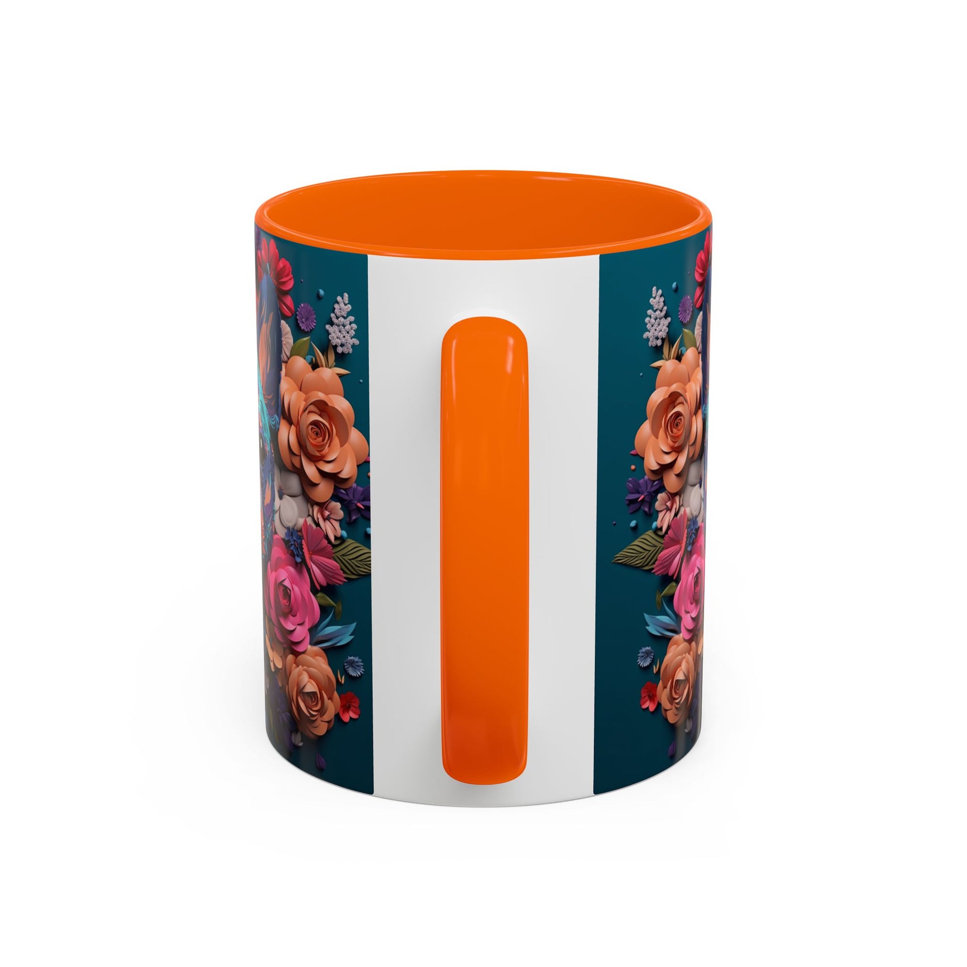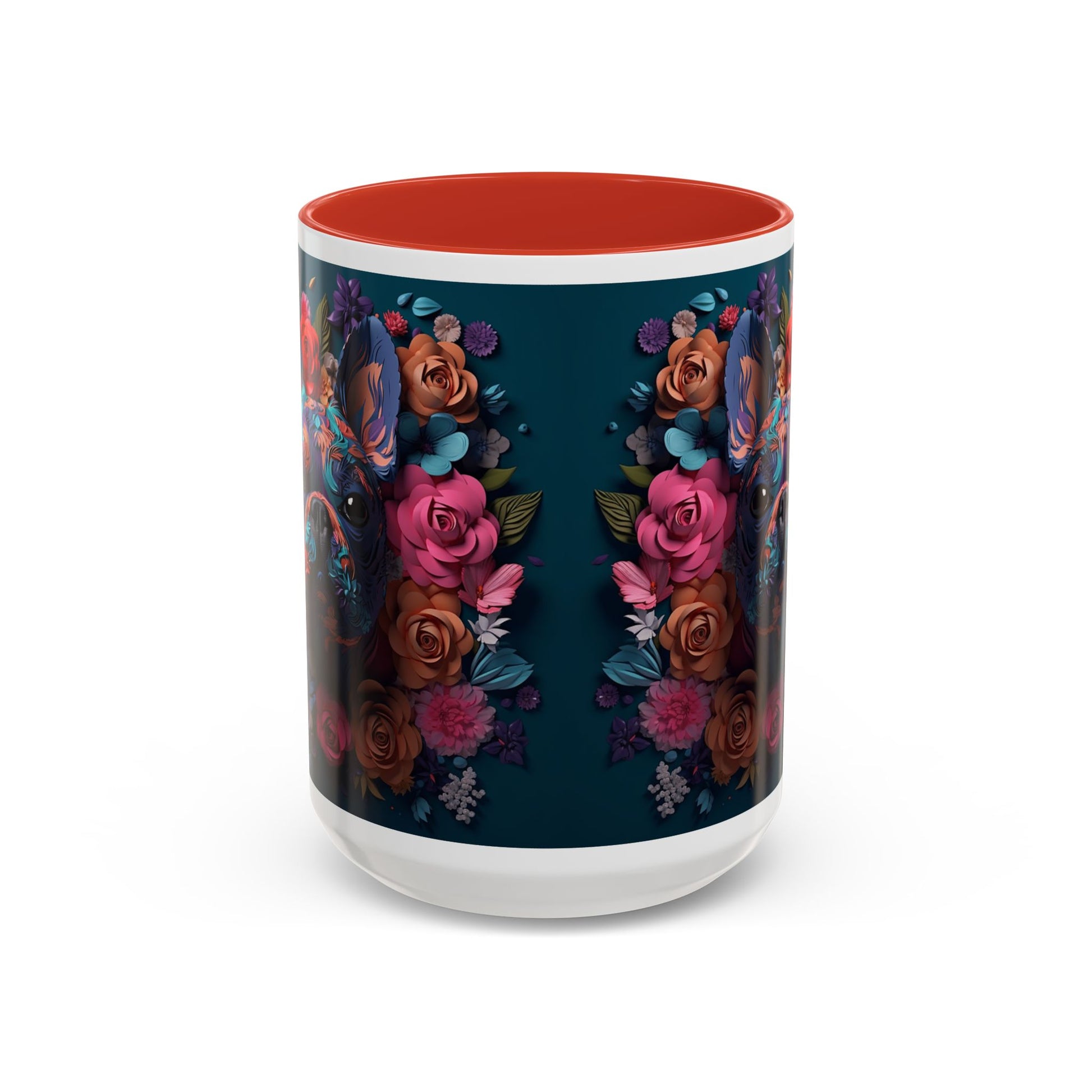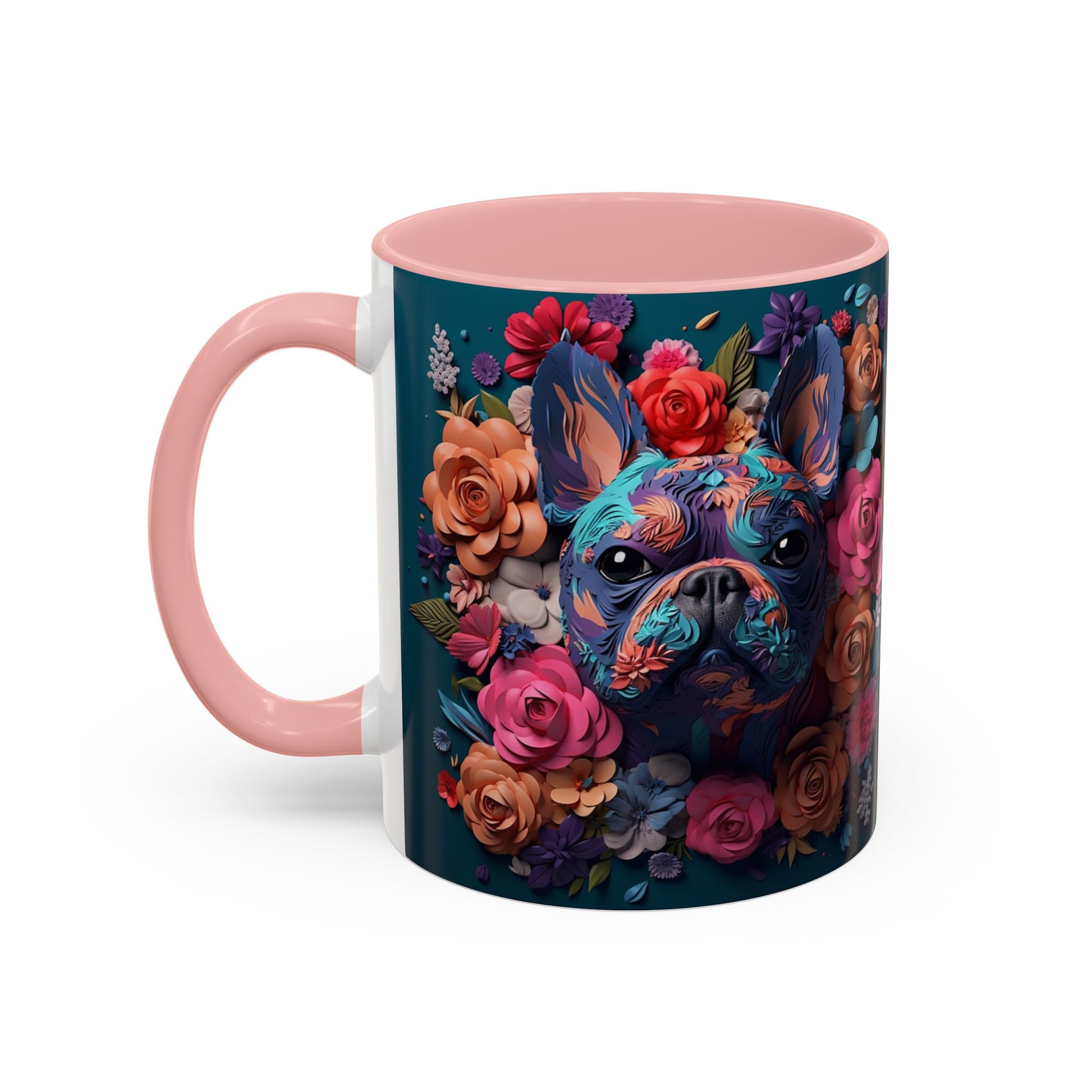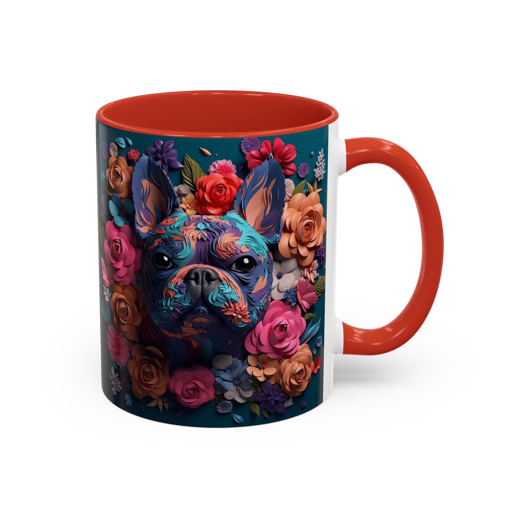This glossy ceramic mug brings a burst of color to slow mornings and late-night creative sessions. Deep teal wraps the outside while a black interior and handle frame a vibrant floral portrait of a French Bulldog—painted in jewel tones and surrounded by roses. The artwork reads like a keepsake: bright, detailed, and meant to be handled every day. It sits comfortably in hand with a C-shaped handle and holds either a cozy 11oz pour or a large 15oz serving. Dishwasher- and microwave-safe finishes keep the colors lively wash after wash, making this piece part of a routine rather than just a display.