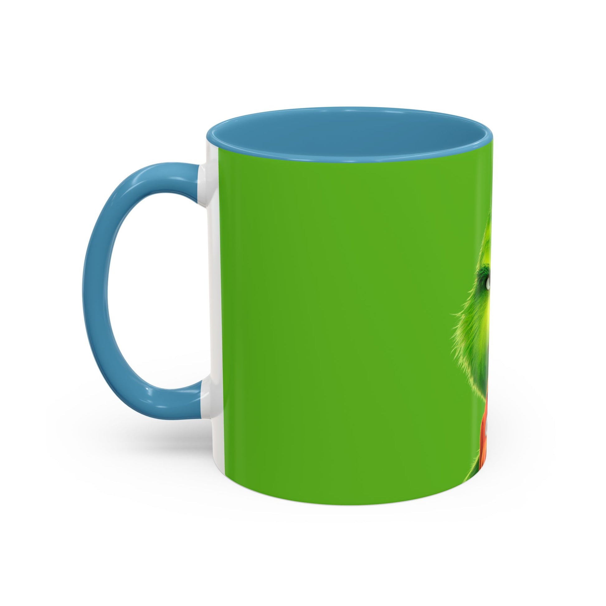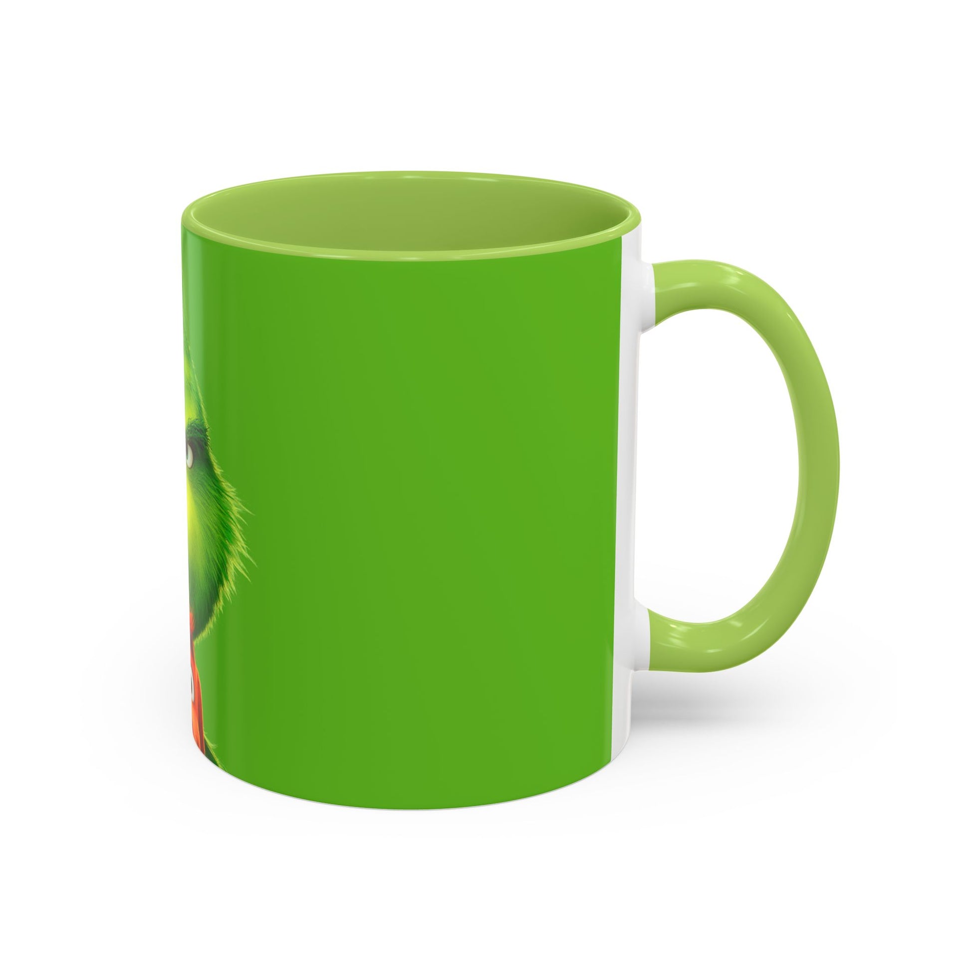 A bright, playful coffee mug that brings a touch of cheeky holiday mischief to morning routines. The vivid green wraparound print features a grumpy, fluffy character peeking over a small, bewildered companion — an image that makes people smile (or smirk) while sipping. The black interior and handle add dramatic contrast against the glossy green exterior, so this mug reads like a little scene on your countertop. Sturdy ceramic construction, vibrant all-over print, and a comfortable C-shaped handle mean this piece is built for daily use and a steady dose of personality.