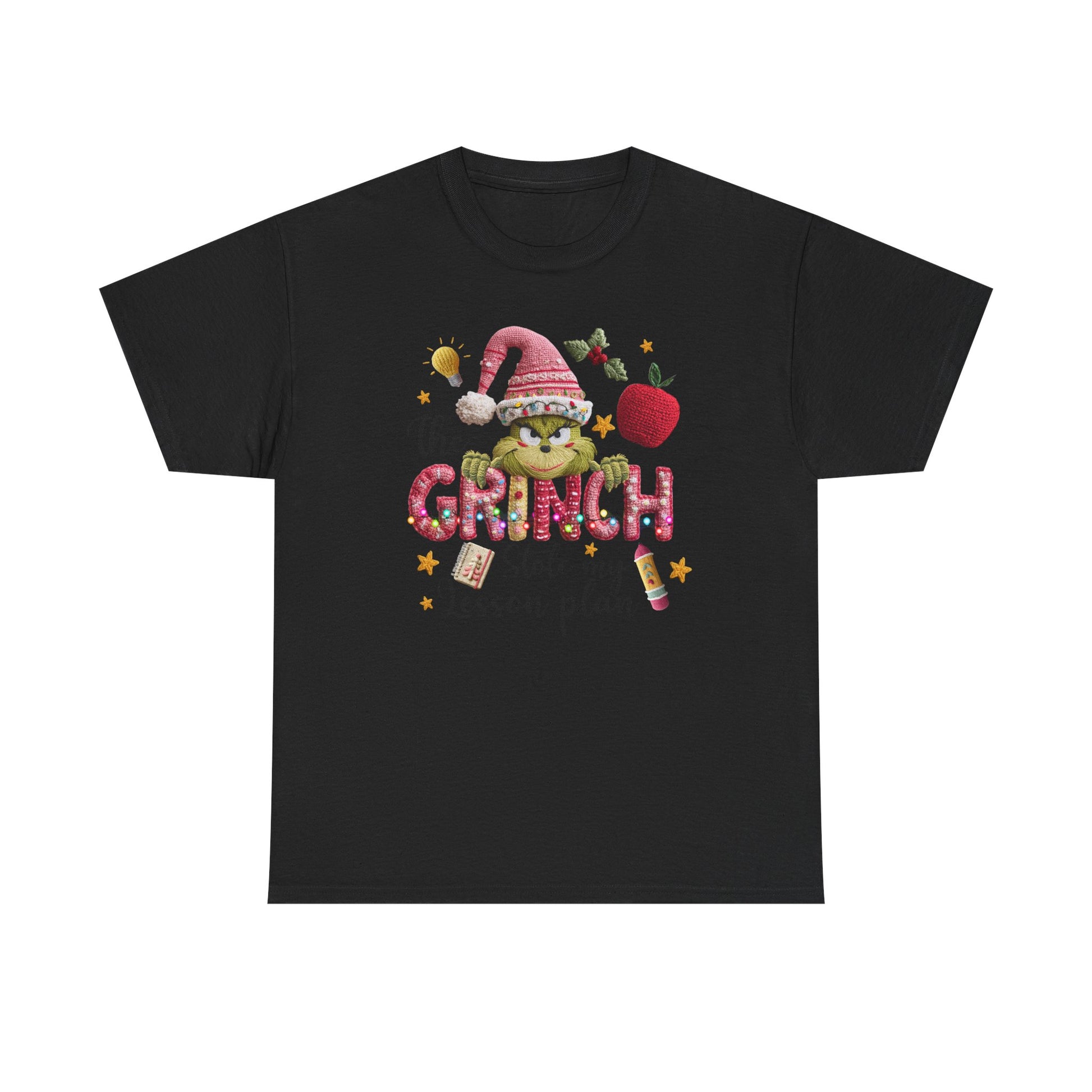 This tee carries a playful, slightly mischievous holiday vibe — a cute, grinning Grinch wearing a knit hat, surrounded by festive accents and the cheeky line “the Grinch stole my lesson plan.” Short, soft strokes of color and gold flecks give the print a warm, hand-painted feel. It sits on a medium-weight white tee with a classic crew neck and relaxed cut, so it layers easily under sweaters or wears solo in the classroom or at casual holiday gatherings. Wear it on early-morning carols, school craft days, or low-key staff parties to spark smiles and nods from fellow teachers who get the joke.