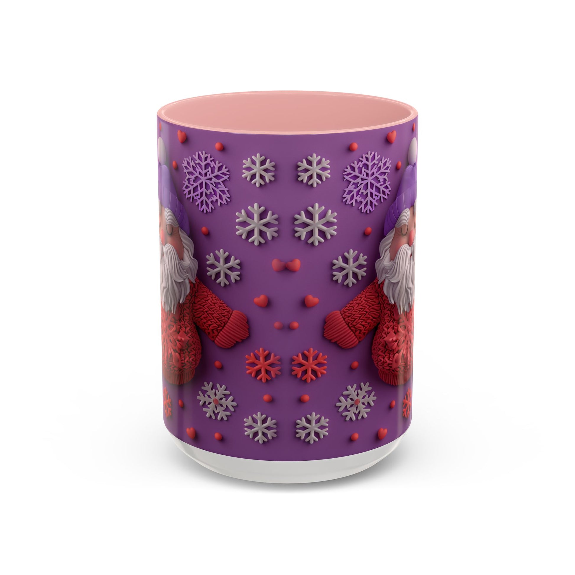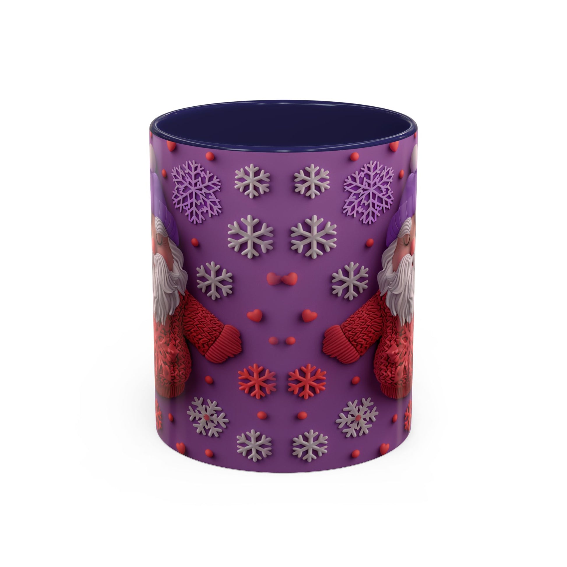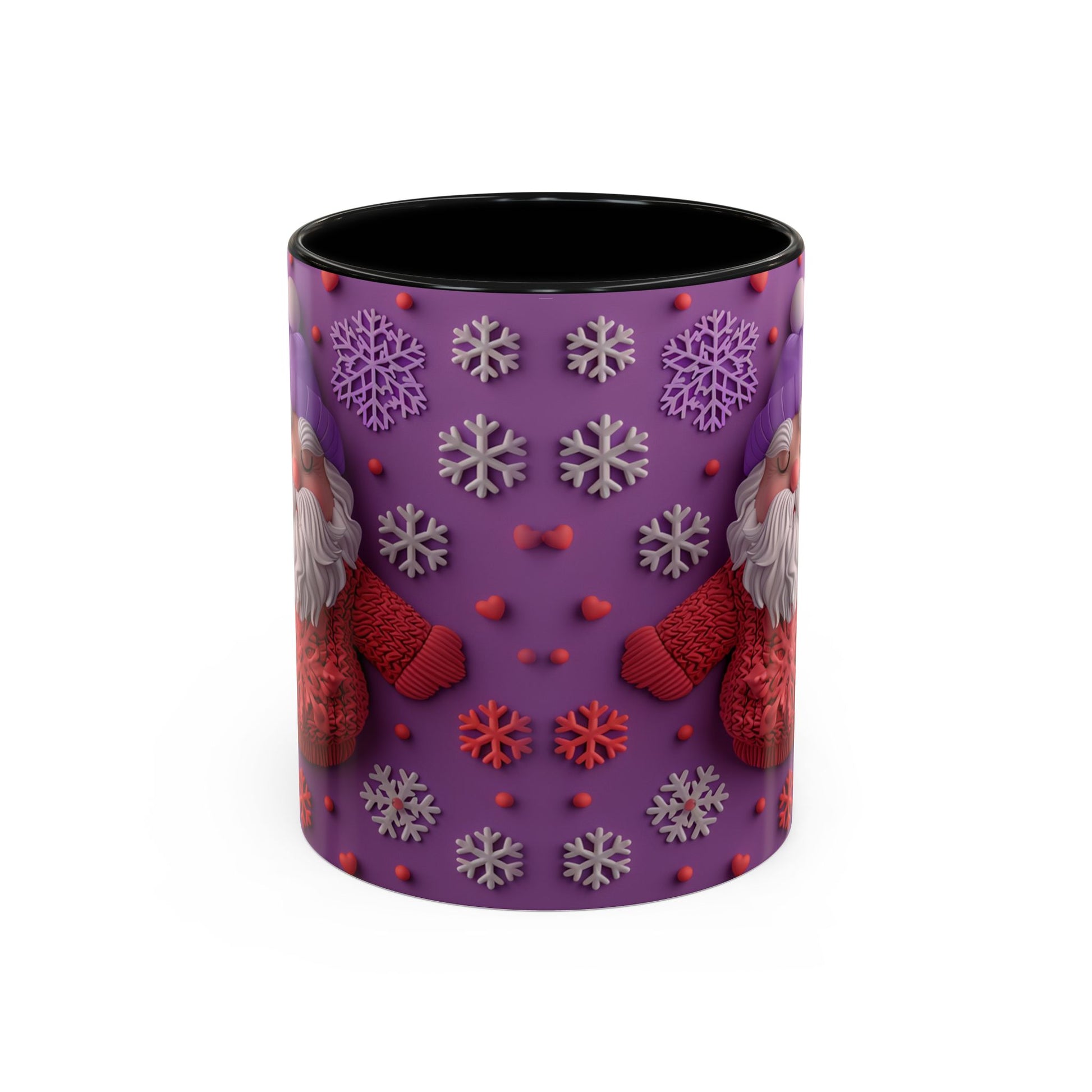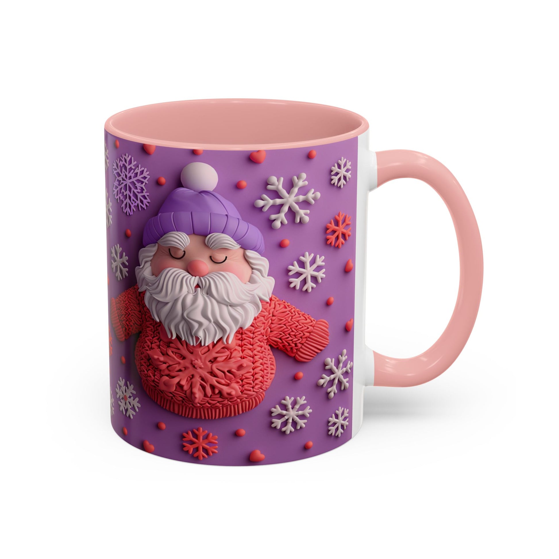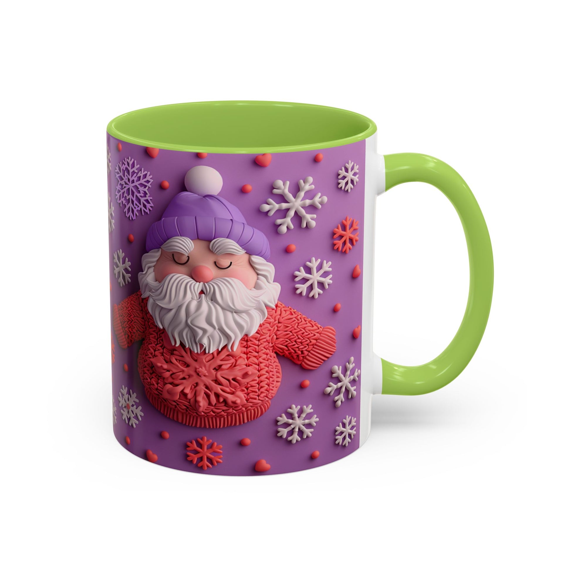 This cheerful ceramic mug brings a little winter wonder to every morning. A rotund, hand-knitted-sweater Santa sits against a purple field dotted with sculpted snowflakes and tiny berries — the design feels cozy, playful, and made for slow sips. The colored interior and handle add a bold contrast that makes the artwork pop, while the glossy finish gives each detail a crisp, tactile look. It’s the kind of mug you reach for on chilly mornings, while wrapping cold hands around warm ceramic and watching steam curl from your coffee or cocoa. For people who love whimsical holiday decor and comforting rituals, this mug becomes part of the routine: morning brew, late-night tea, or a mid-day pick-me-up during the season.