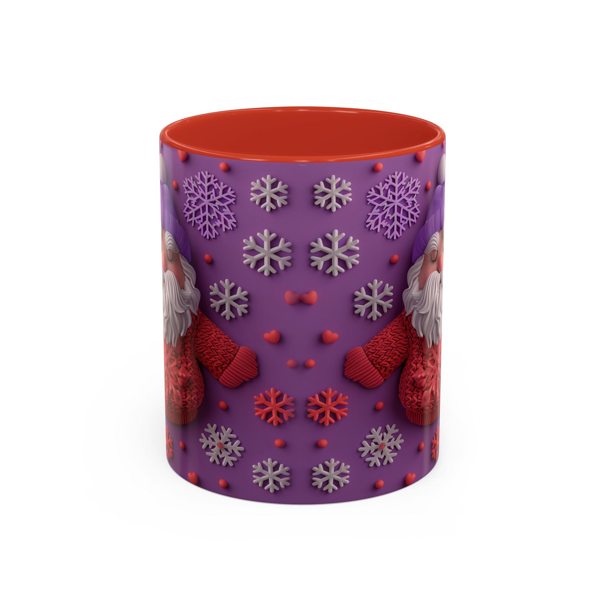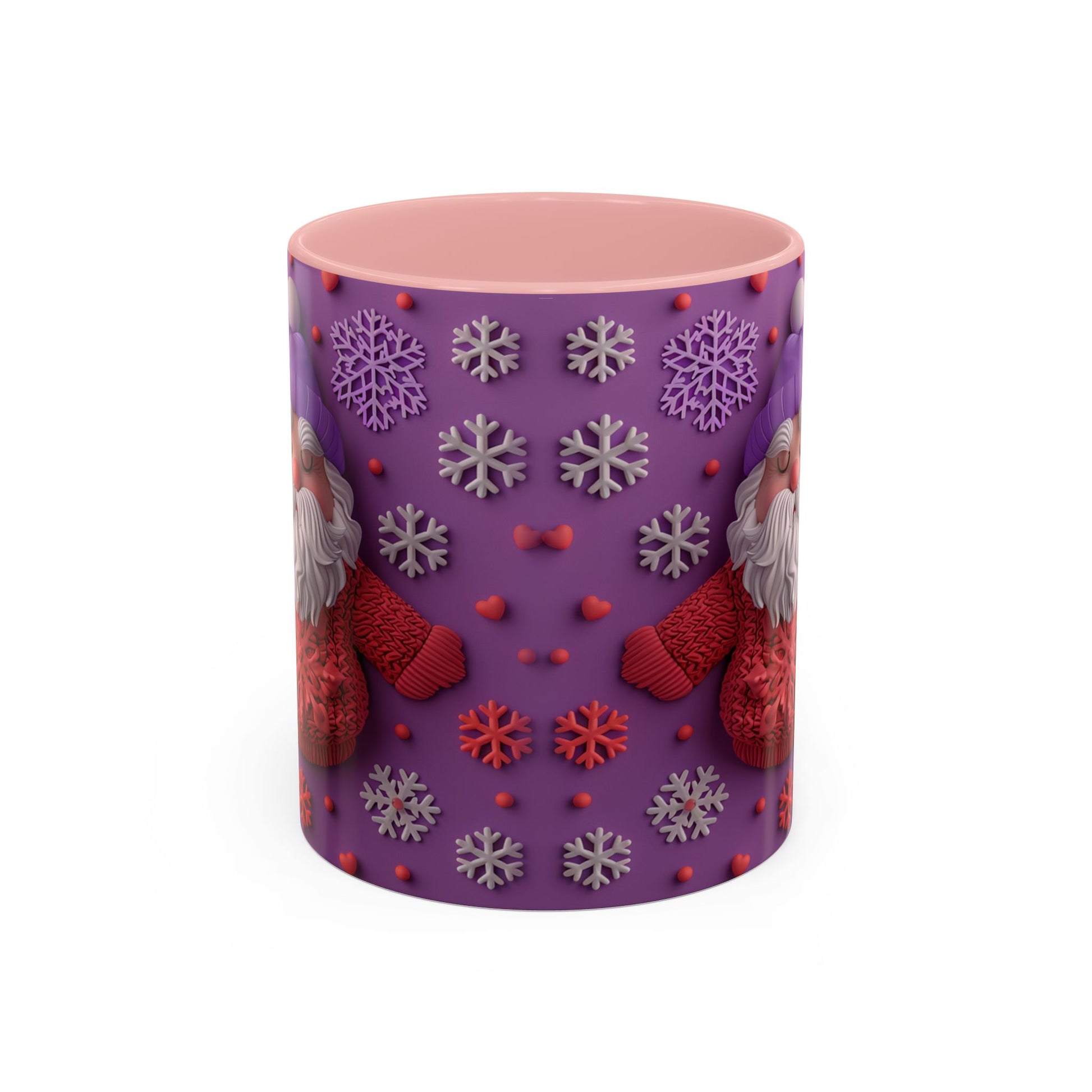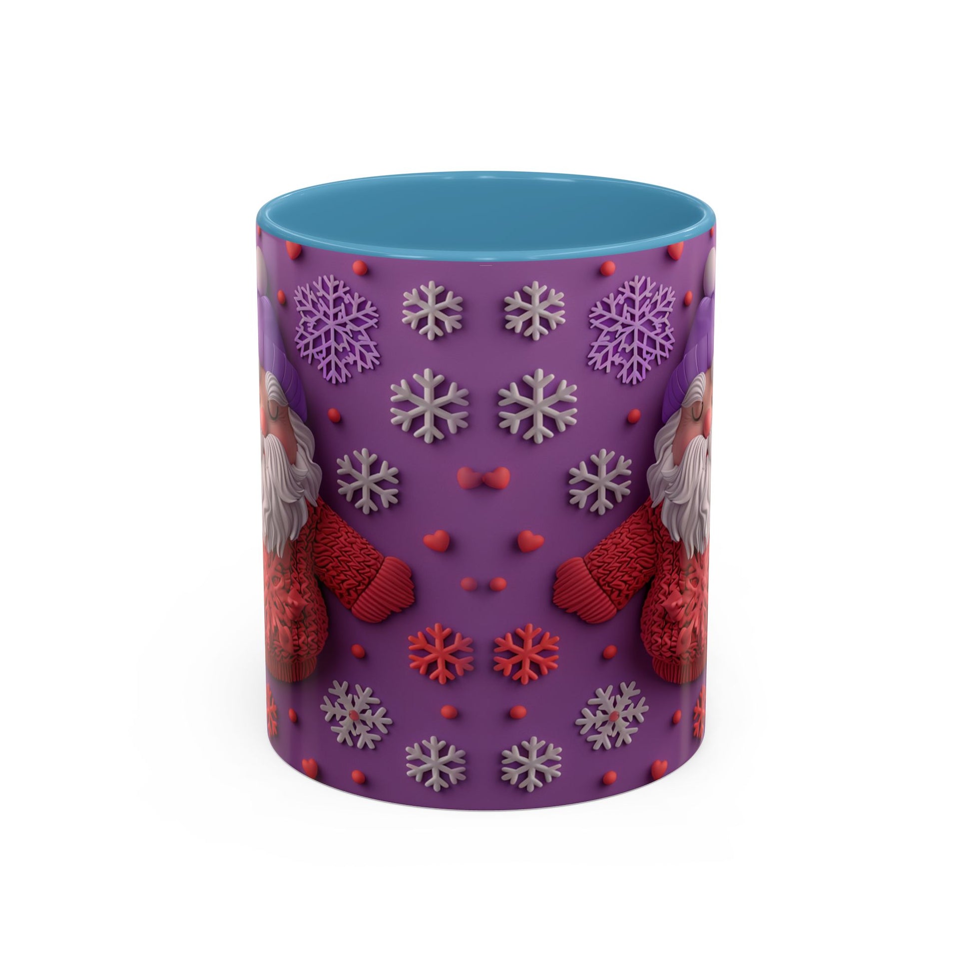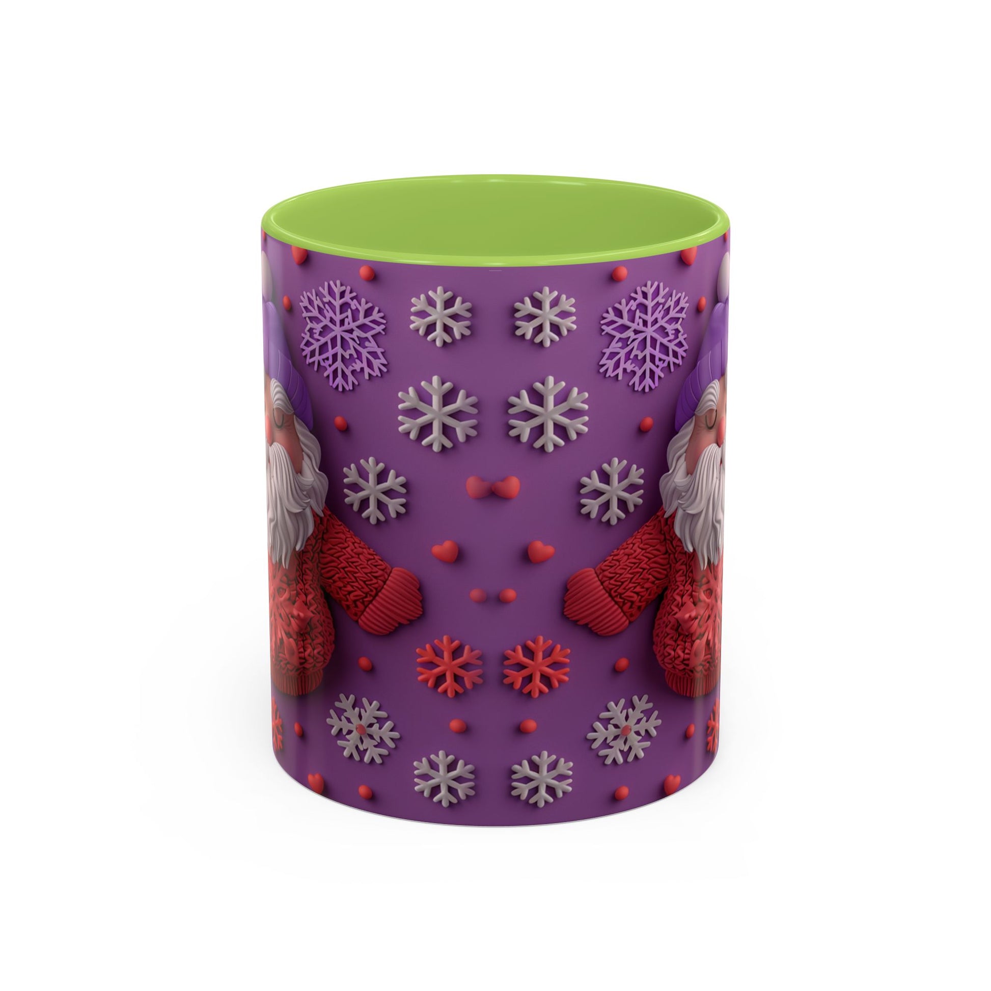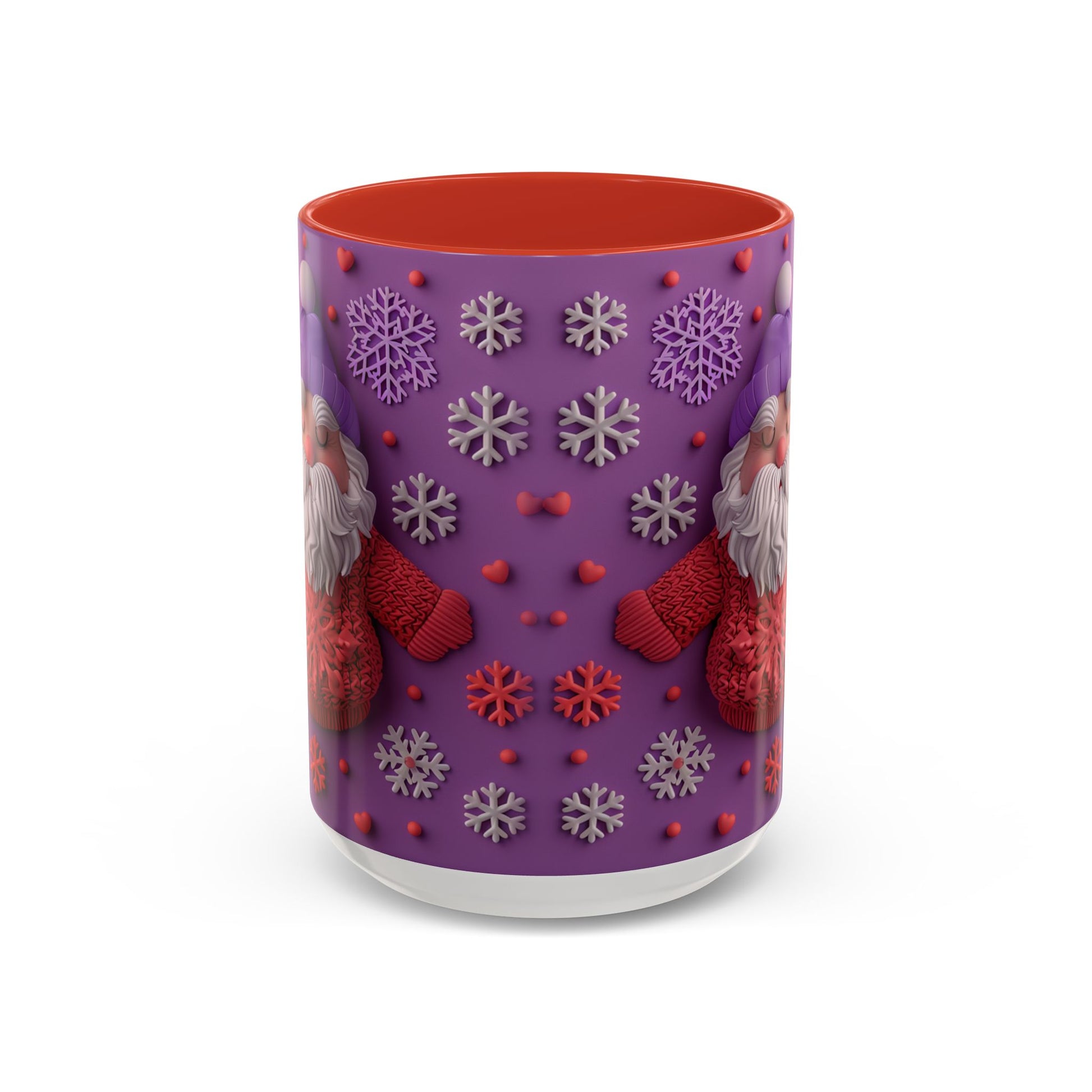 This cheerful ceramic mug brings a little winter wonder to every morning. A rotund, hand-knitted-sweater Santa sits against a purple field dotted with sculpted snowflakes and tiny berries — the design feels cozy, playful, and made for slow sips. The colored interior and handle add a bold contrast that makes the artwork pop, while the glossy finish gives each detail a crisp, tactile look. It’s the kind of mug you reach for on chilly mornings, while wrapping cold hands around warm ceramic and watching steam curl from your coffee or cocoa. For people who love whimsical holiday decor and comforting rituals, this mug becomes part of the routine: morning brew, late-night tea, or a mid-day pick-me-up during the season.