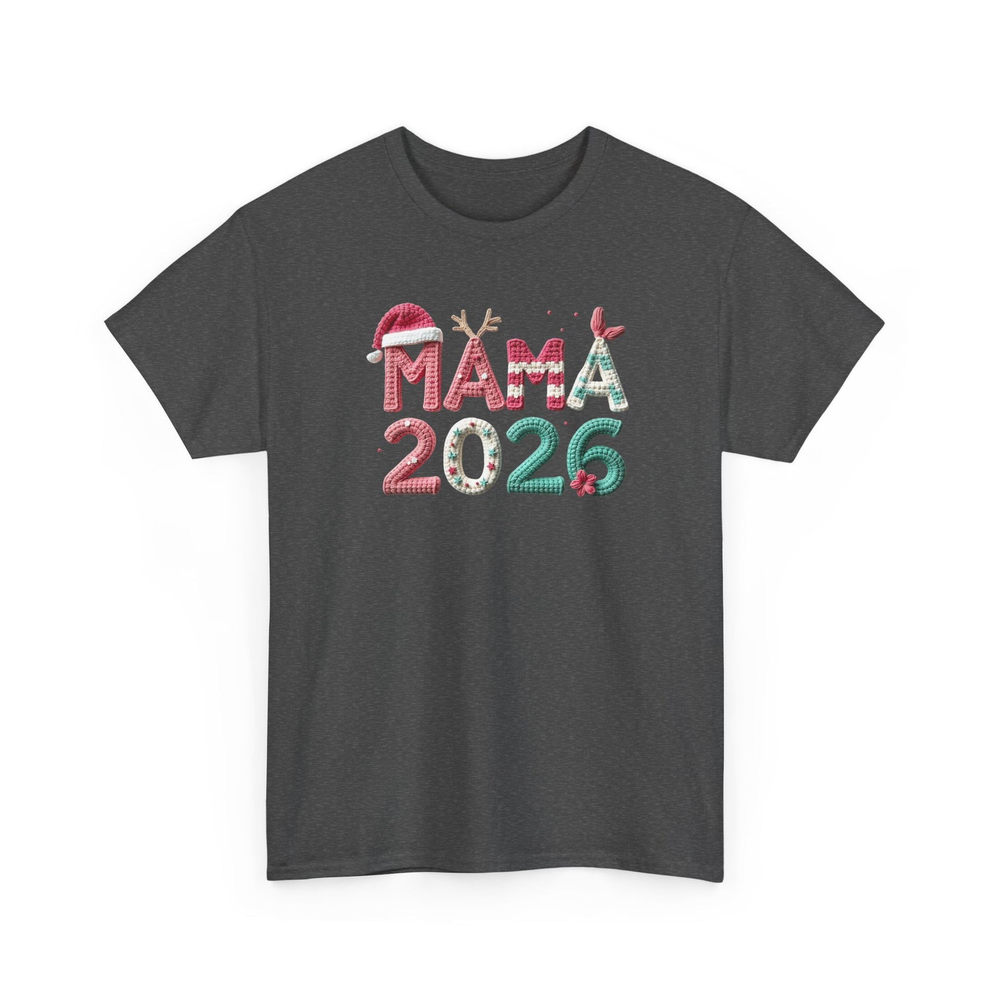 This soft, classic-fit tee carries a warm, celebratory vibe — playful holiday motifs shape the letters and numbers to spell “MAMA 2026,” blending festive reds and greens with subtle seasonal accents. It sits comfortably in everyday life: worn at cozy family gatherings, baby-announcement moments, or during casual holiday errands. The shirt’s relaxed crew neck and midweight cotton feel familiar against skin, while clean, detailed prints hold up wash after wash. It’s for moms who want a cheerful, understated way to mark a year and a memory, whether they’re sharing the news or simply joining in seasonal fun.