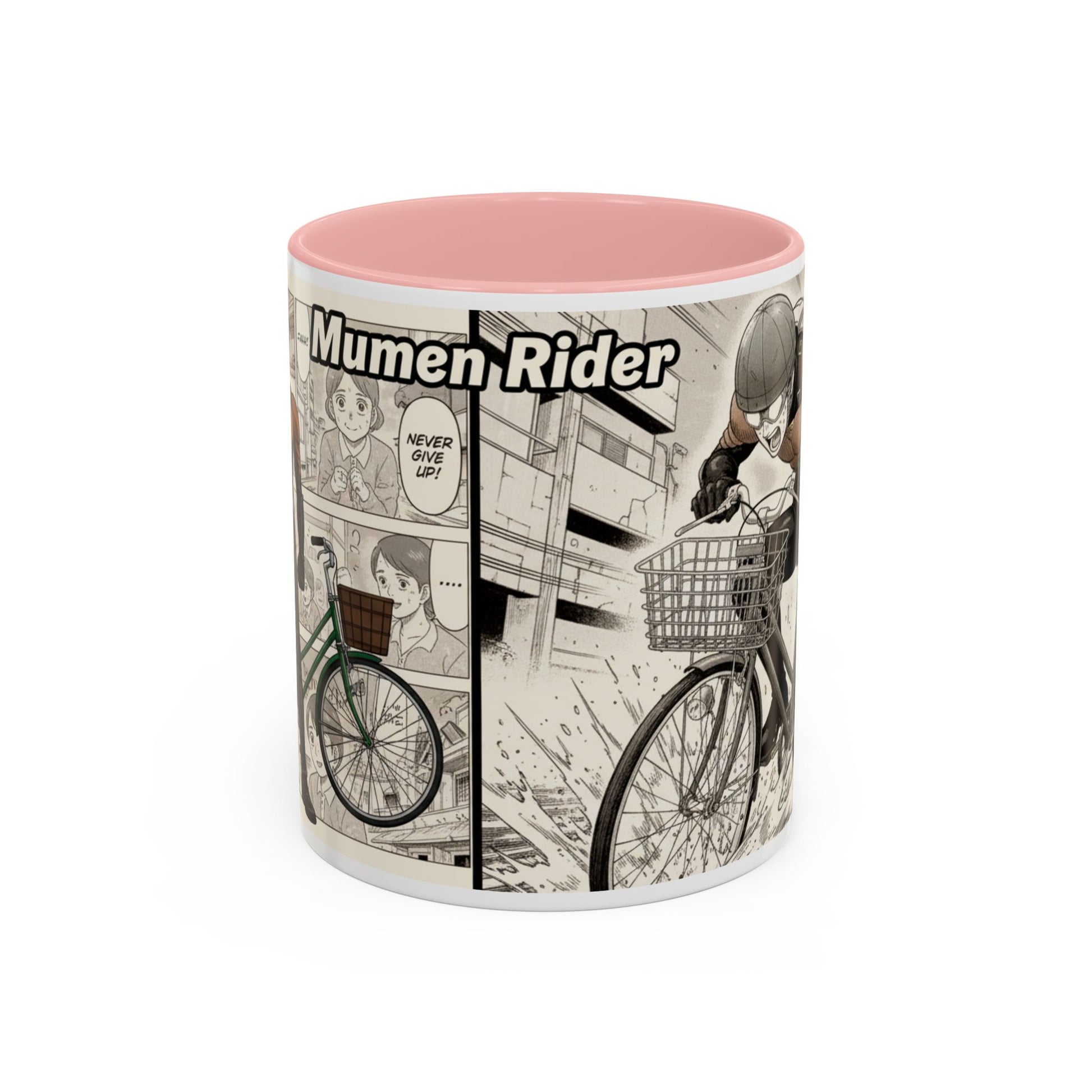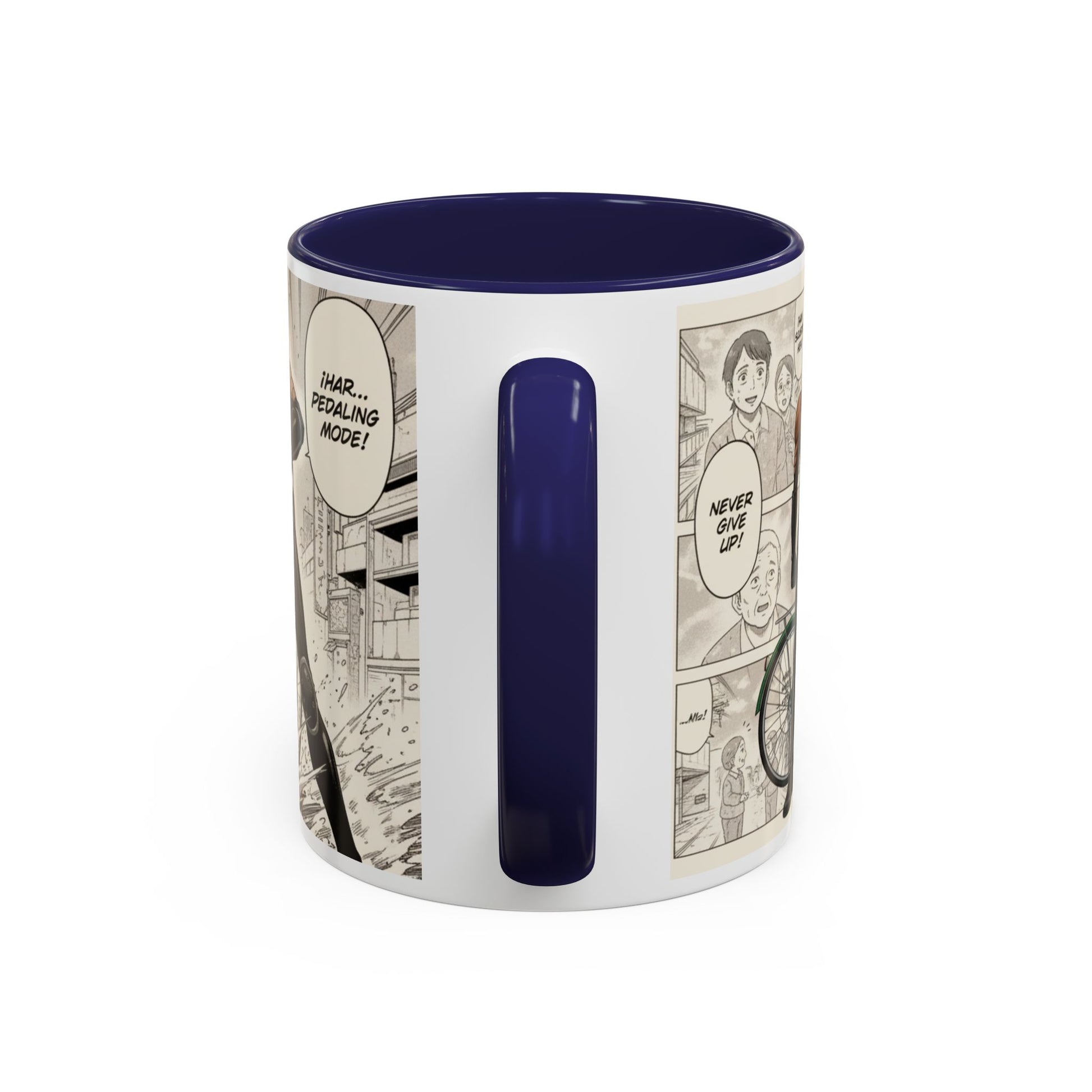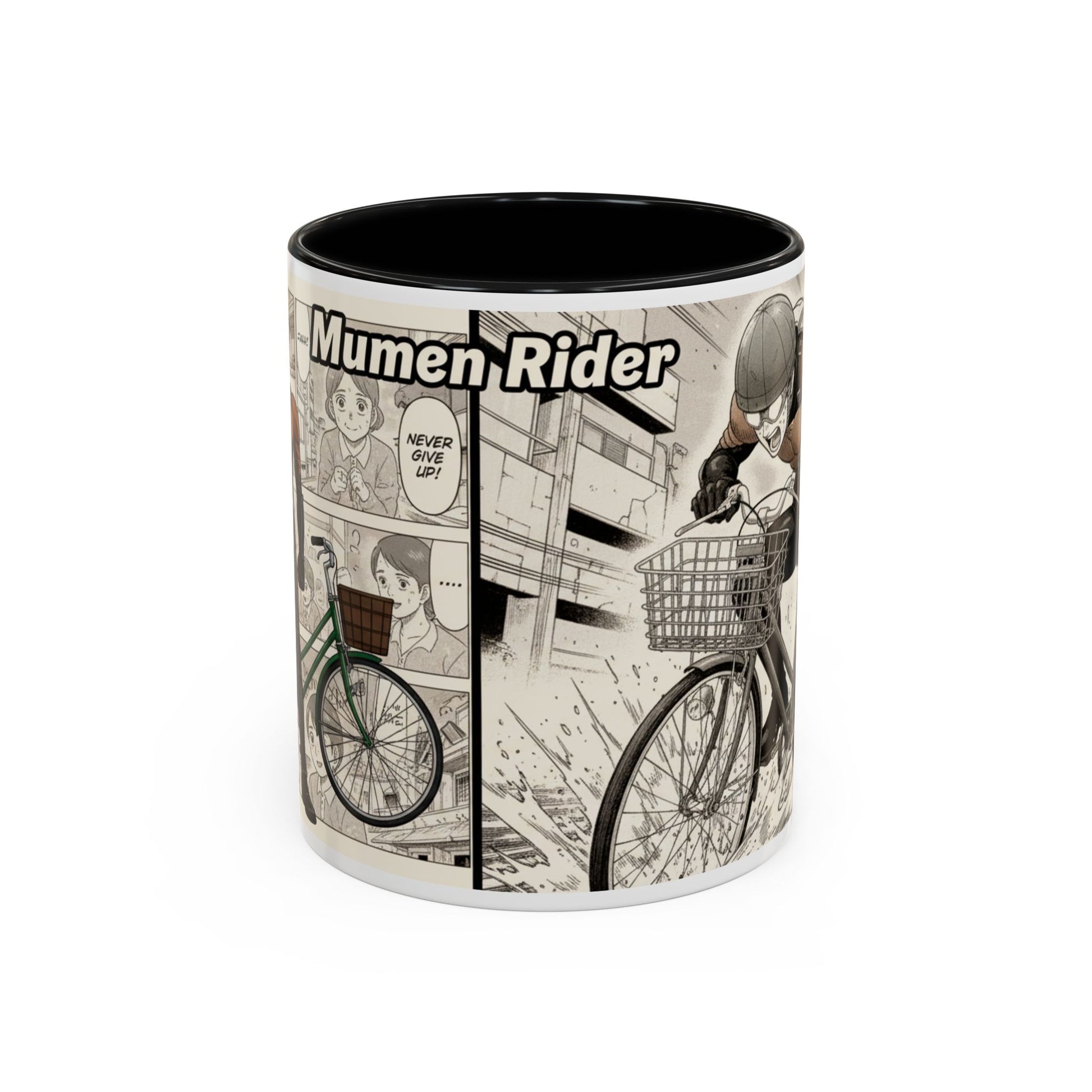 This ceramic accent mug brings a lively, illustrated energy to every sip. The high-contrast interior and handle color frames a dynamic black-and-white comic panel of a determined cyclist — motion lines, gritty shading, and a bold headline create a cinematic feel. It fits into busy mornings, late-night sketch sessions, and desk setups where personality matters. Hold it by the comfortable C-shaped handle and let the glossy surface catch the light as the scene unfolds around your drink. Tough enough for everyday use, it keeps bright printed details wash-resistant and drink-safe while adding a little narrative to routine coffee breaks or study sessions.