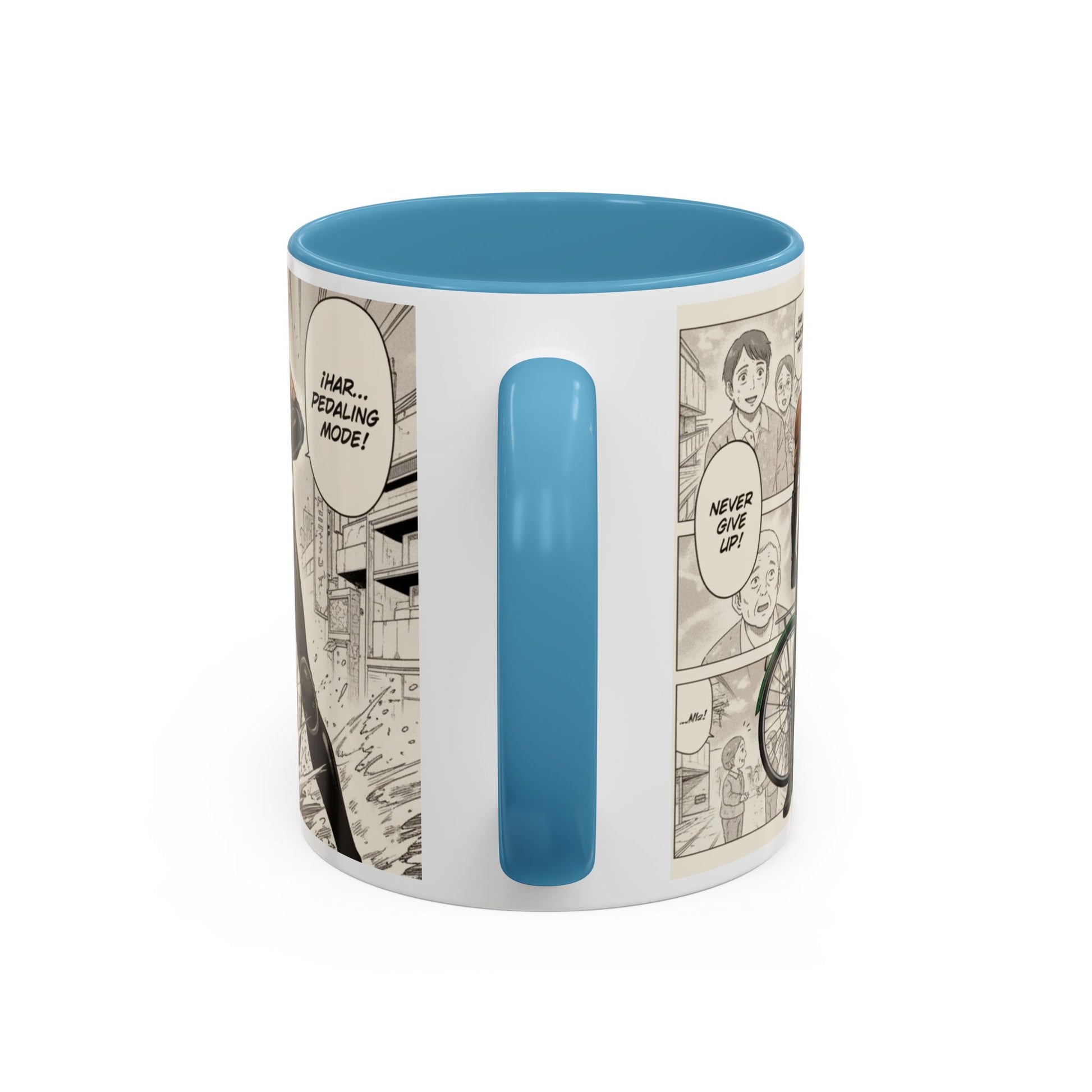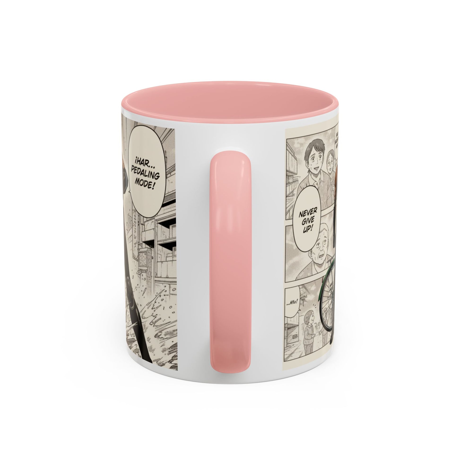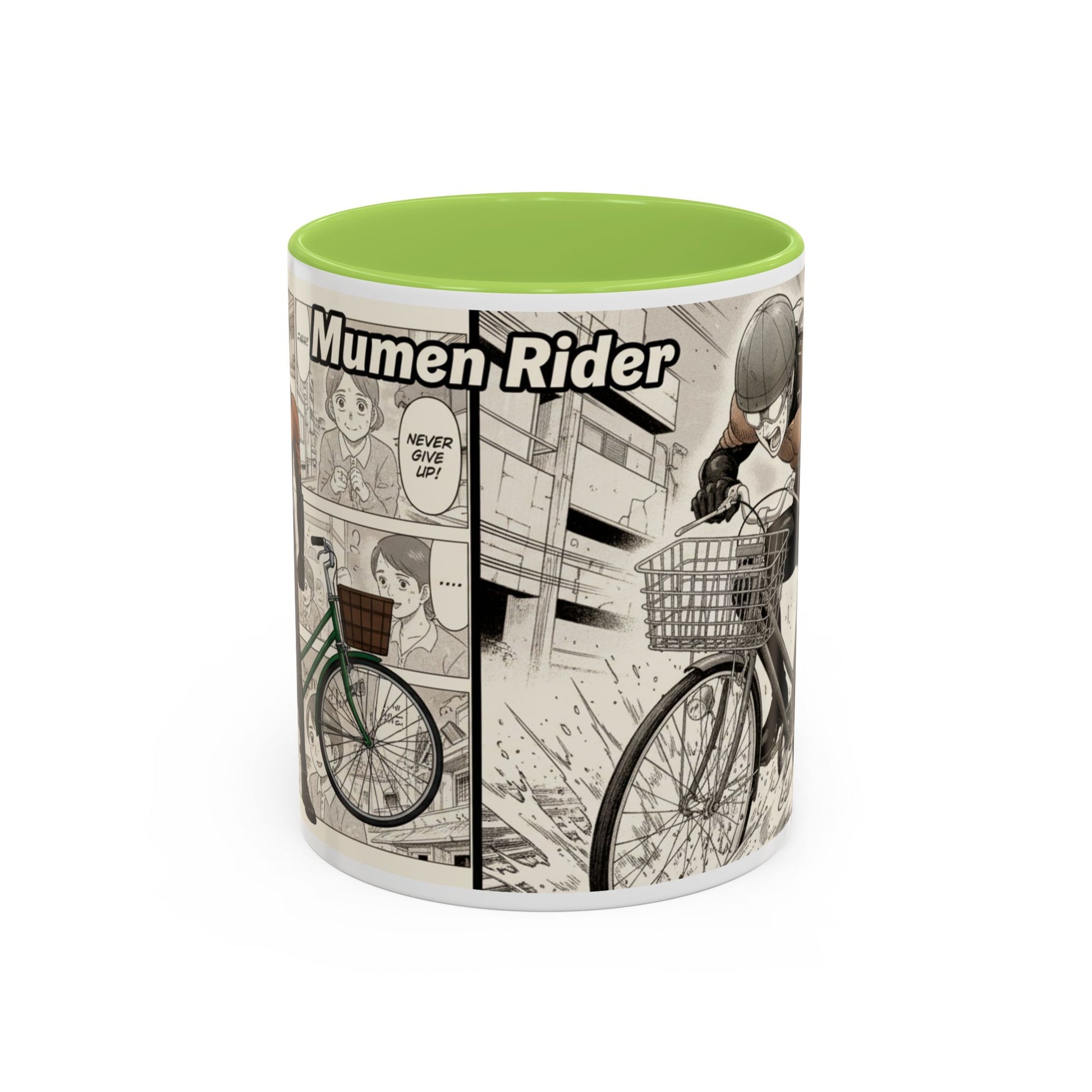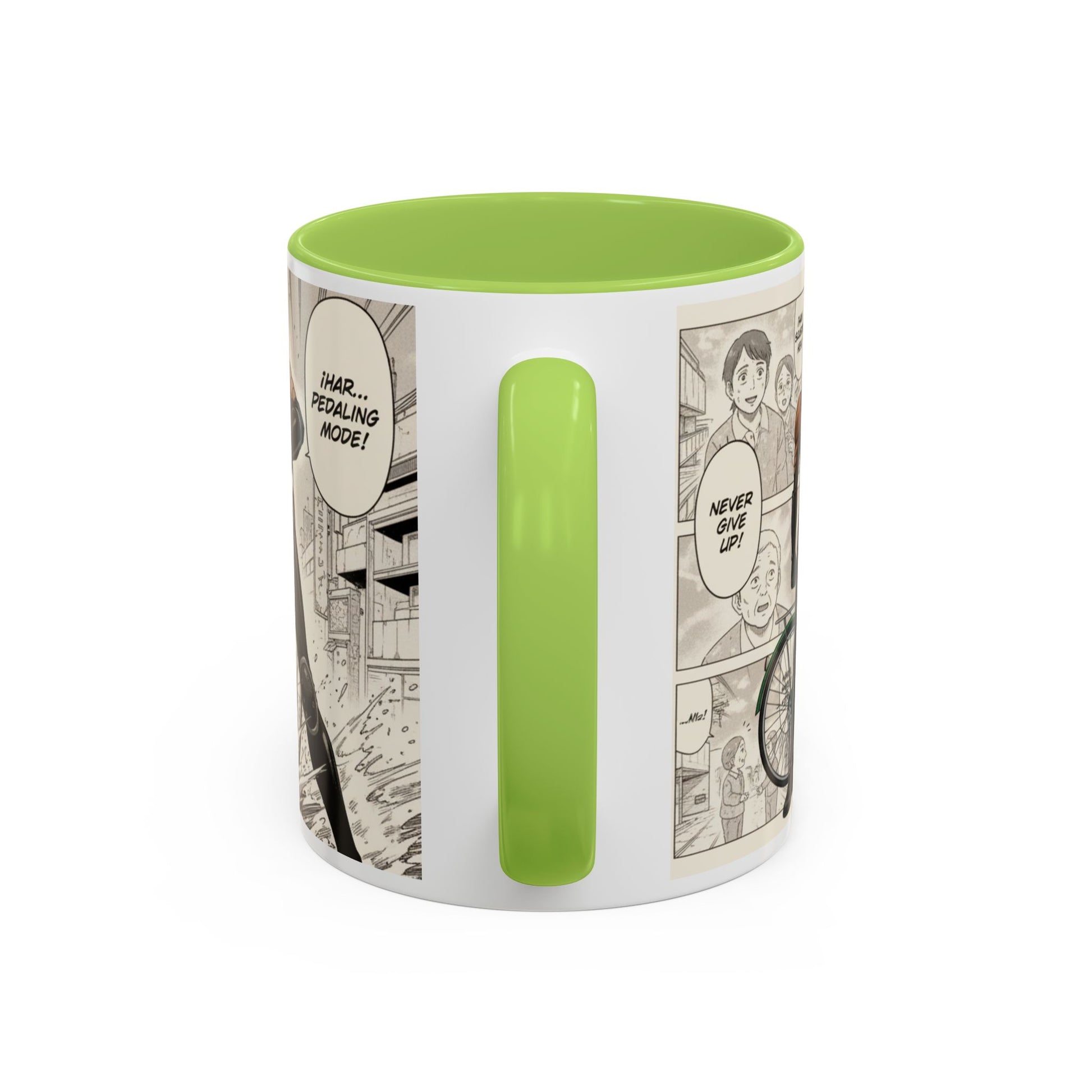 This ceramic accent mug brings a lively, illustrated energy to every sip. The high-contrast interior and handle color frames a dynamic black-and-white comic panel of a determined cyclist — motion lines, gritty shading, and a bold headline create a cinematic feel. It fits into busy mornings, late-night sketch sessions, and desk setups where personality matters. Hold it by the comfortable C-shaped handle and let the glossy surface catch the light as the scene unfolds around your drink. Tough enough for everyday use, it keeps bright printed details wash-resistant and drink-safe while adding a little narrative to routine coffee breaks or study sessions.