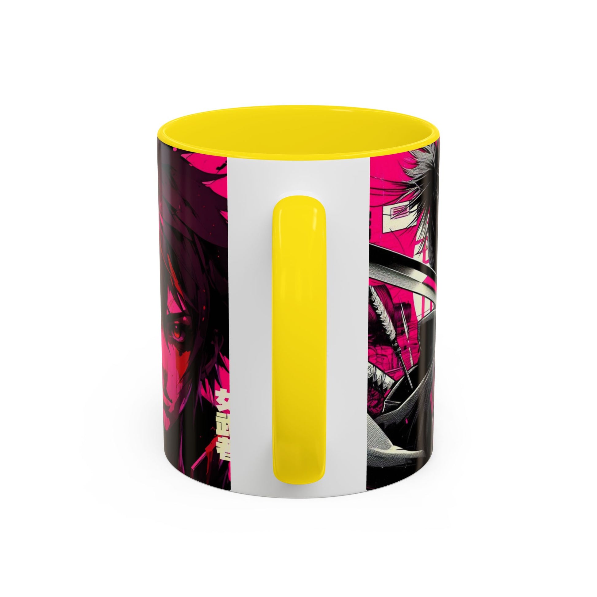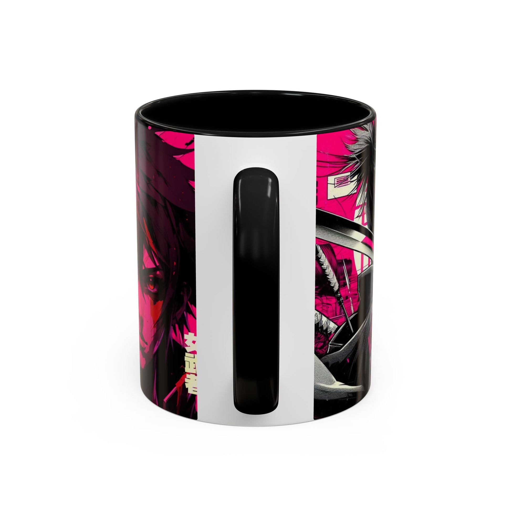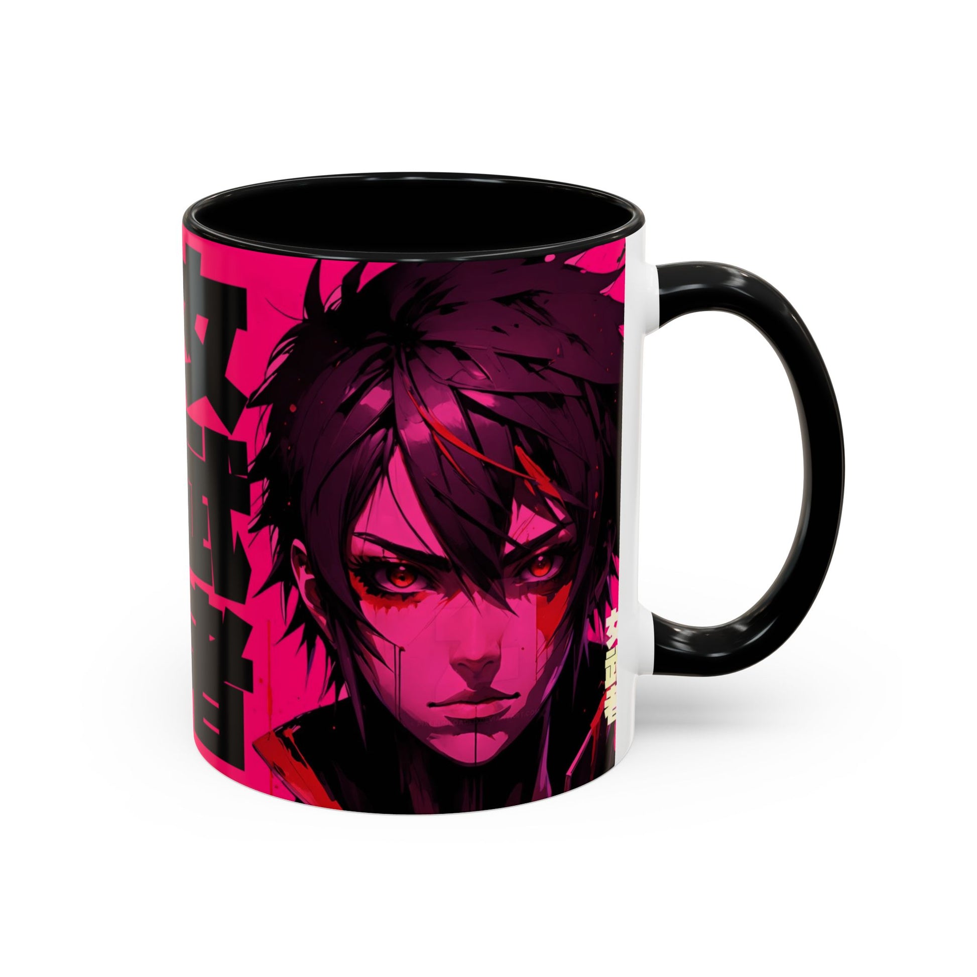 This glossy ceramic mug brings bold, electric anime energy to your everyday ritual. Deep black interior and handle frame a neon-pink wraparound illustration of fierce, stylized characters and Japanese typography — a statement piece that turns coffee, tea, or cocoa into a moment of attitude. It feels like a soundtrack of synth and city lights: intense, focused, and a little rebellious. Slip it into your morning routine or keep it on your desk as a vivid reminder of the worlds you love. The sturdy C-shaped handle and smooth finish make it easy to hold and display between sips.
