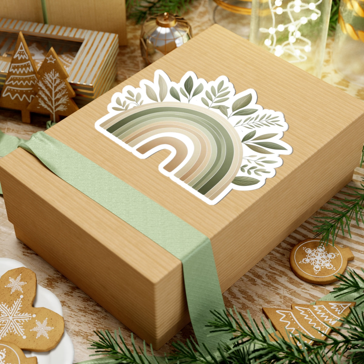 Neutral Boho Rainbow Kiss-Cut Sticker — Green Earthy Leaves Decal