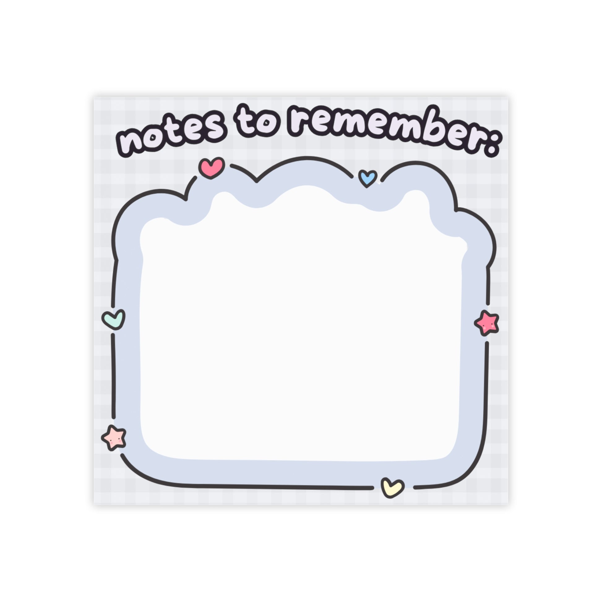 A cheerful square note pad designed to brighten everyday reminders. Soft pastel hearts and stars frame a cloud-like writing area beneath the playful heading “notes to remember,” inviting quick lists, study prompts, or loving reminders. The subtle gingham background adds a cozy, homey touch while leaving the center clear for crisp, legible notes. Lightweight and stackable, these pads slide into planners, bags, or desks and bring a little warmth to routines and workspaces.