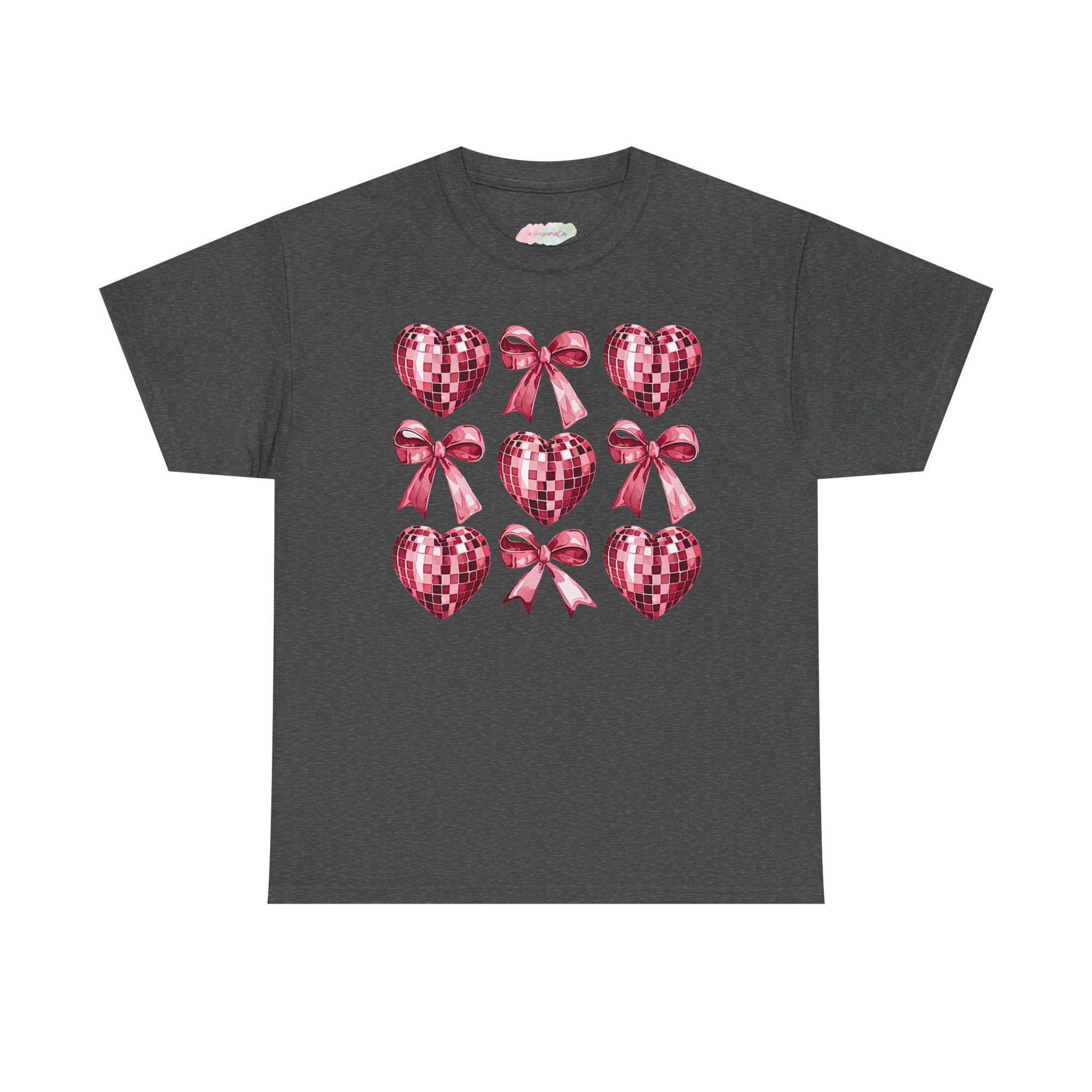 Soft, breathable cotton and a playful, retro-inspired print come together in this relaxed crew tee. Nine pink sequin hearts and bows form a nostalgic grid across the chest — glossy, girly, and a little cheeky. The medium-weight fabric drapes casually while the ribbed collar and shoulder tape keep the shape wash after wash. Wear it with high-waisted jeans, layered under a cardigan, or tied at the waist for an easy everyday look that feels cheerful and a touch flirtatious.