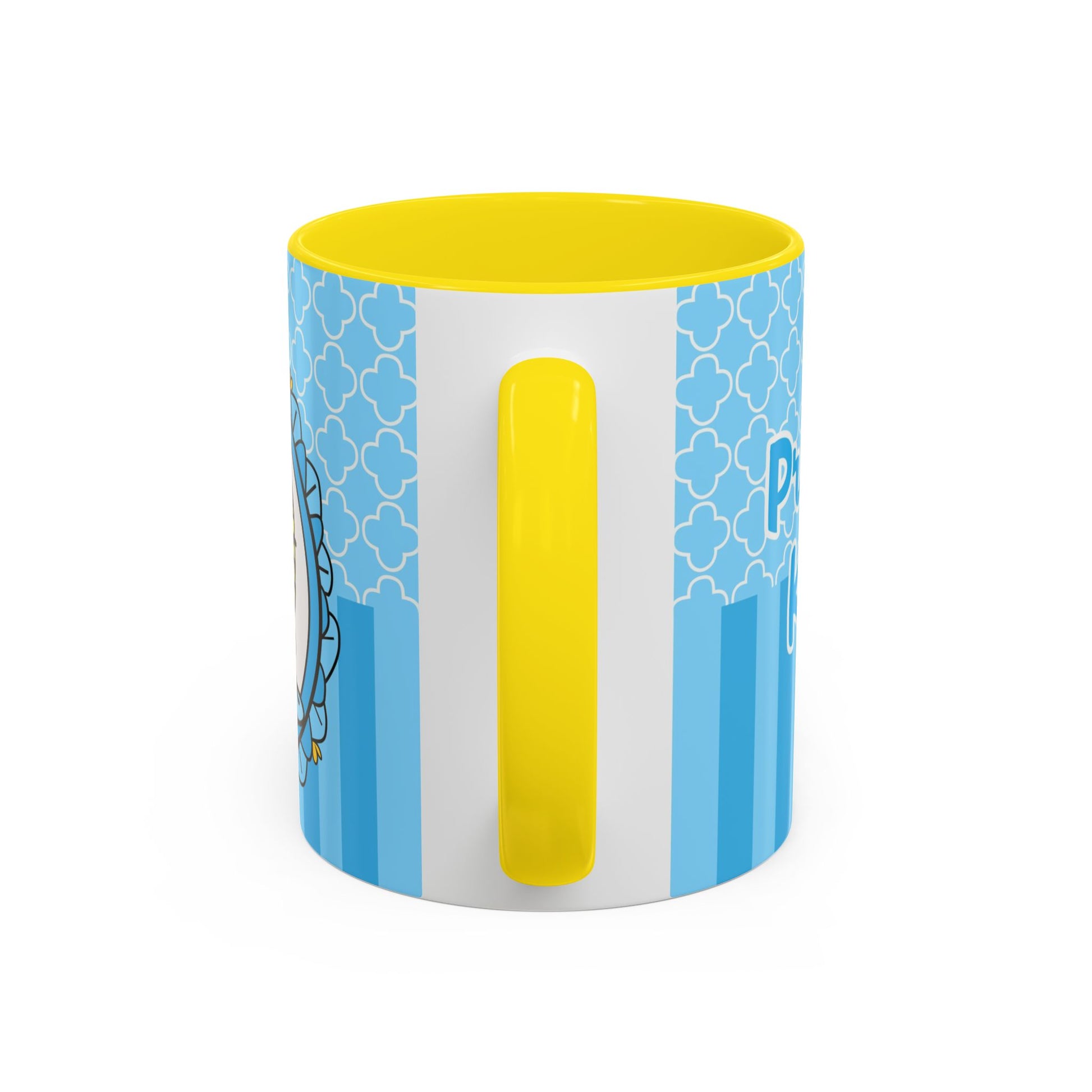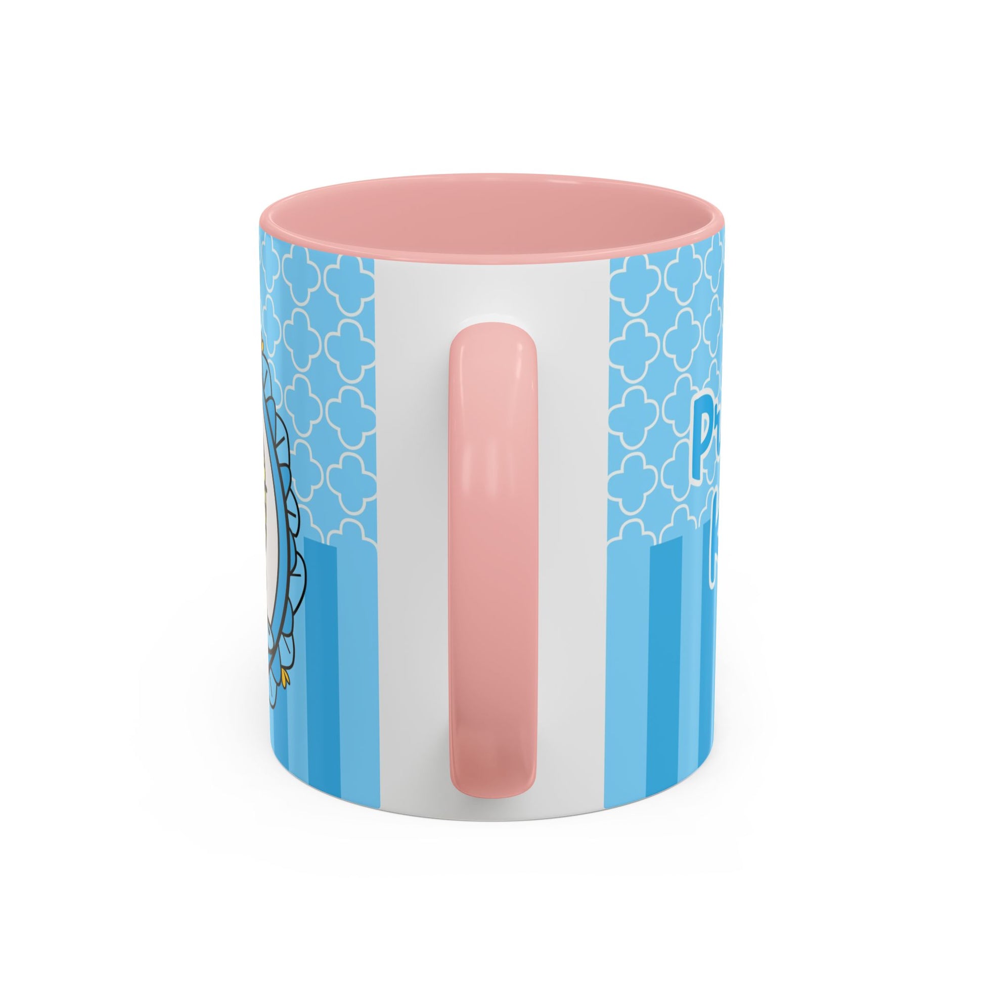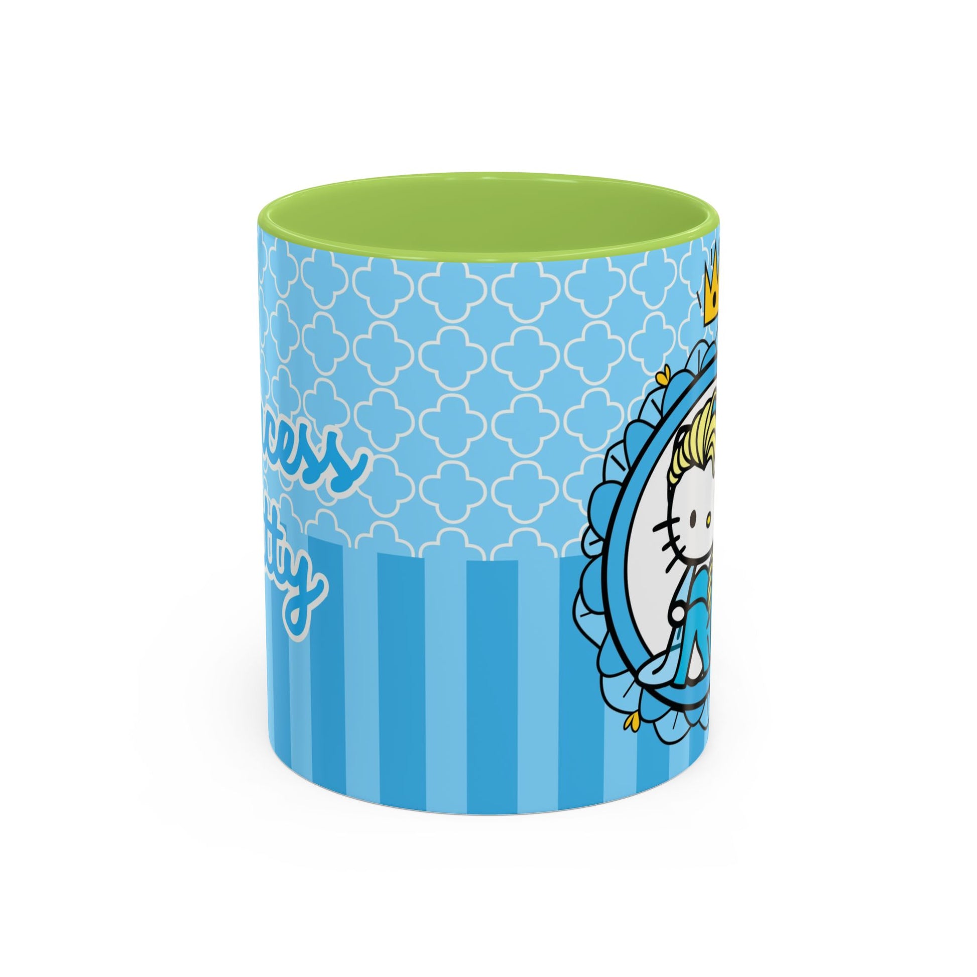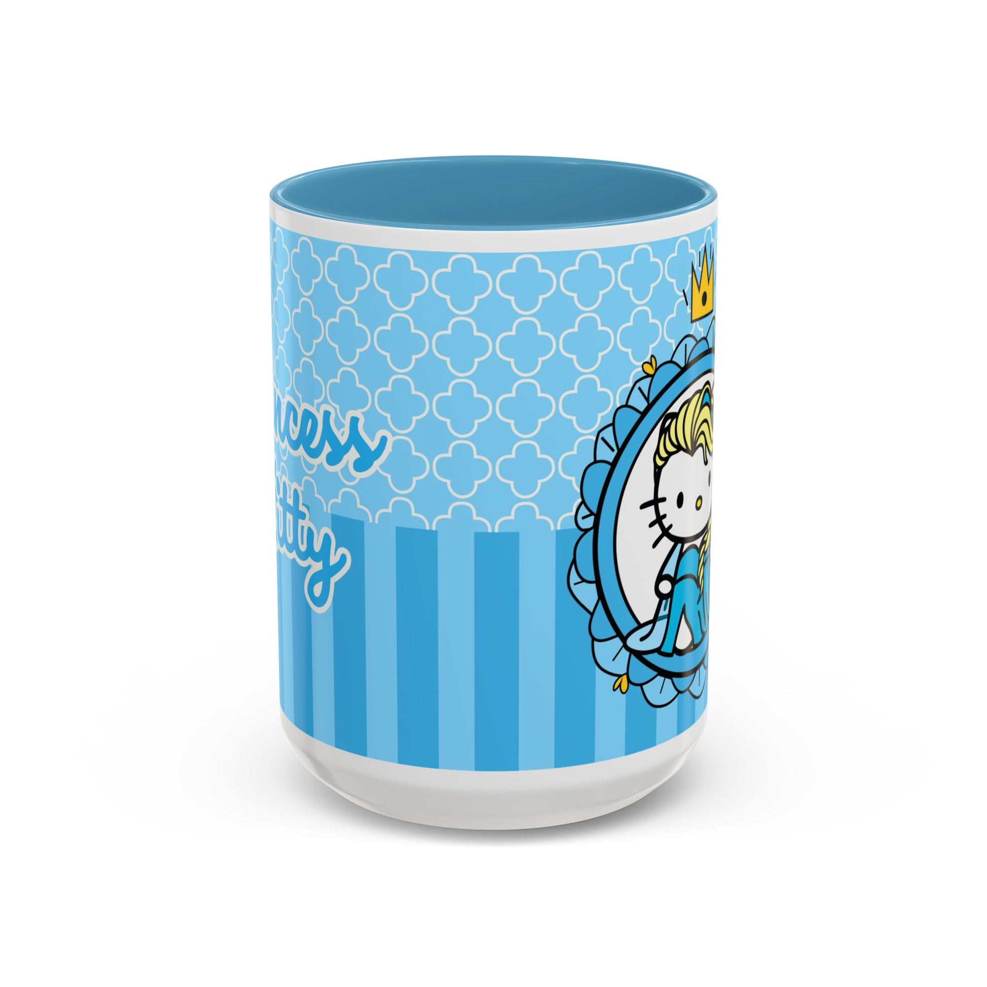 A cheerful ceramic mug that brings a playful, storybook moment to morning coffee or afternoon cocoa. This accent coffee mug pairs a glossy black interior and handle with a bright, sky-blue exterior patterned in delicate quatrefoils and stripes. The illustrated character—blonde braid, tiny crown, and sweet, wide-eyed expression—feels like a tiny royal companion peeking out from an ornate frame. It’s the kind of mug that lightens the kitchen counter, sparks a smile during slow mornings, and slips easily into a cozy at-home ritual or a thoughtful birthday morning. The contrast between the colored interior and crisp white ceramic body makes the artwork pop, while practical features like microwave and dishwasher safety keep it usable every day.
