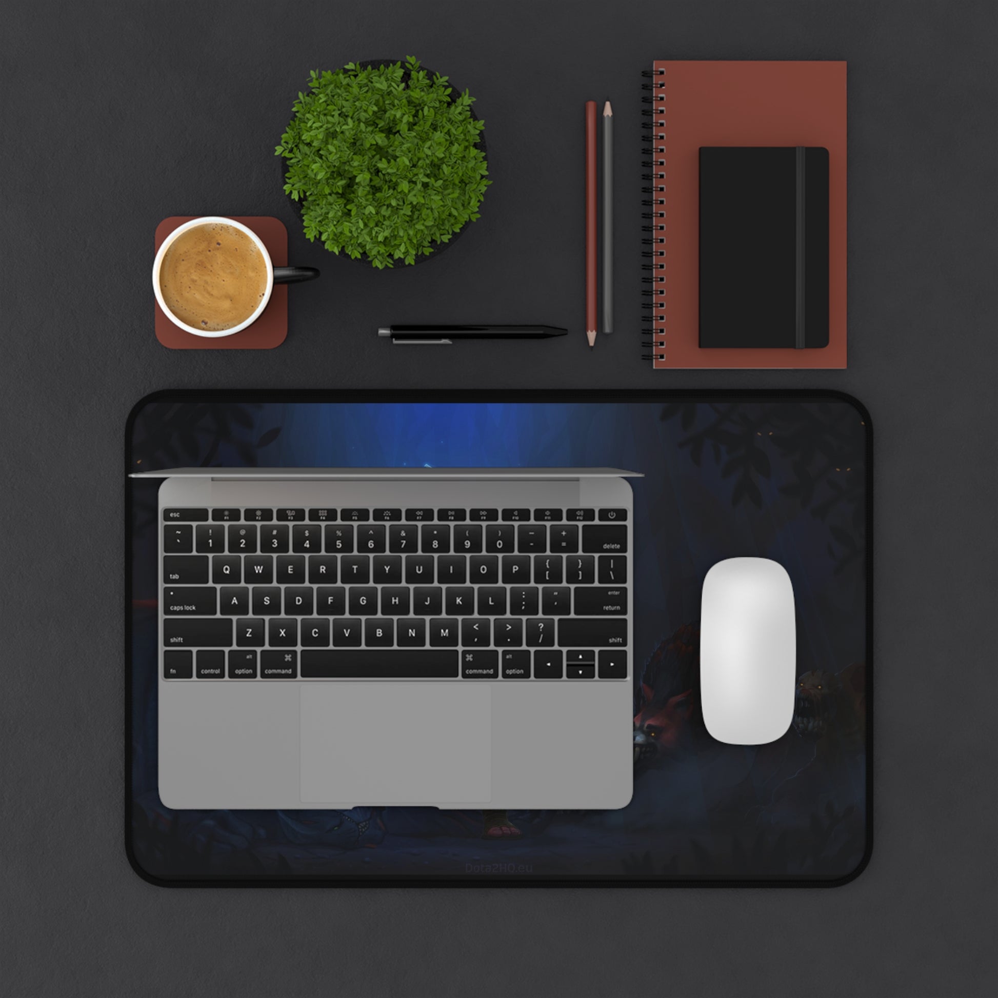 A richly detailed neoprene desk mat that brings a moody, forest-night scene to your workspace. Deep midnight blues and shadowed silhouettes create a cinematic backdrop for late-night work sessions or focused gaming. The surface is smooth for precise mouse control, while the stitched hem and anti-slip backing keep the mat grounded through every move. It’s the kind of piece that turns a plain desk into a small, immersive world — a quiet companion for concentration, storytelling, and creative flow.