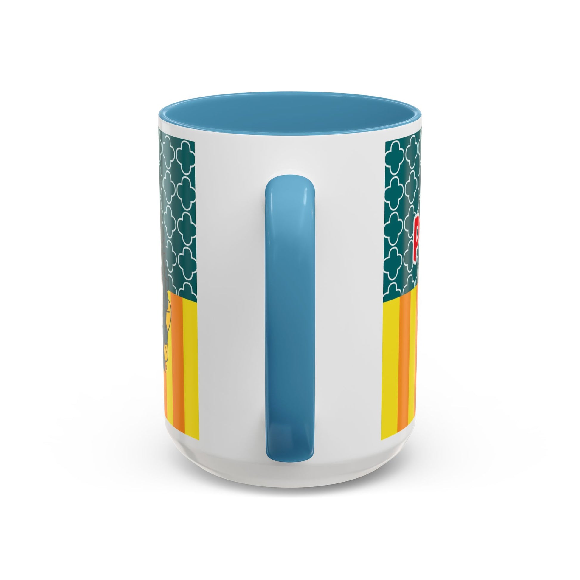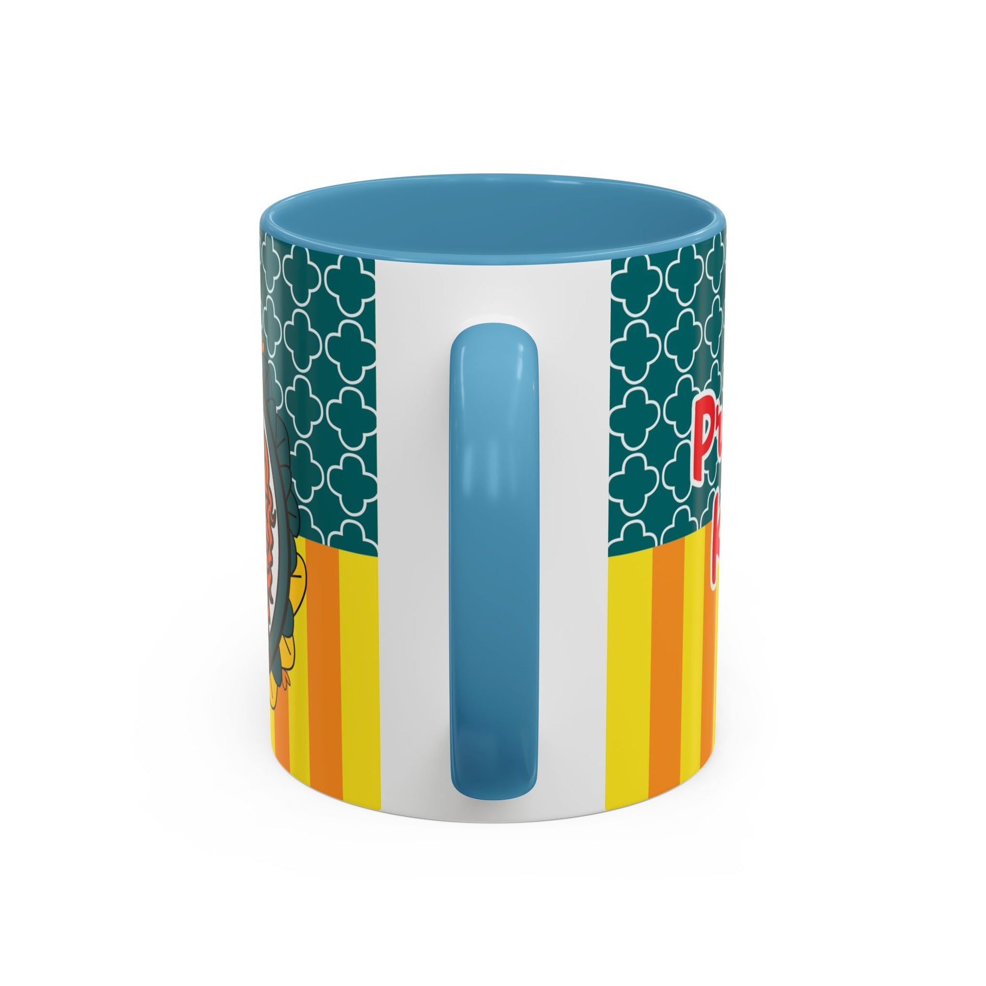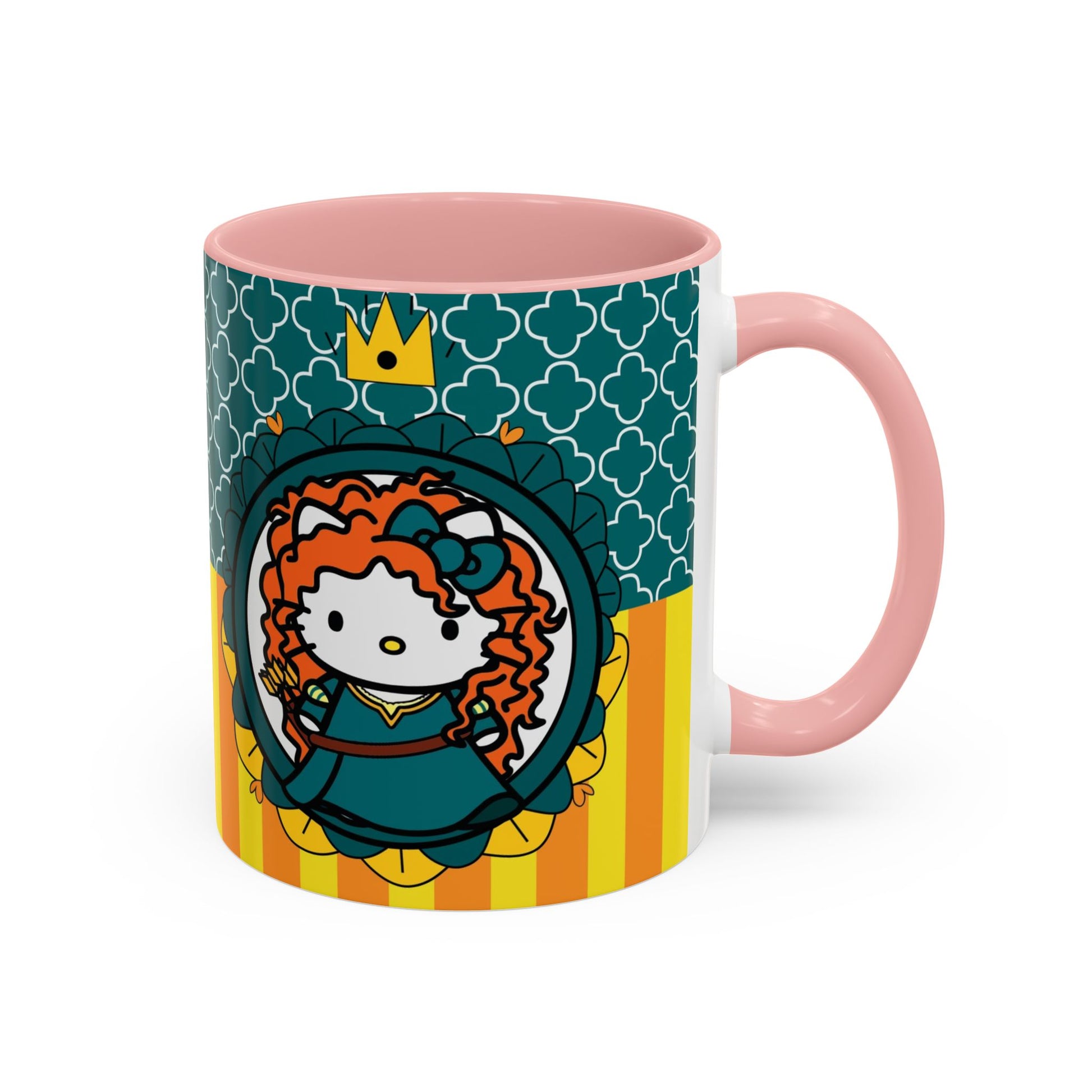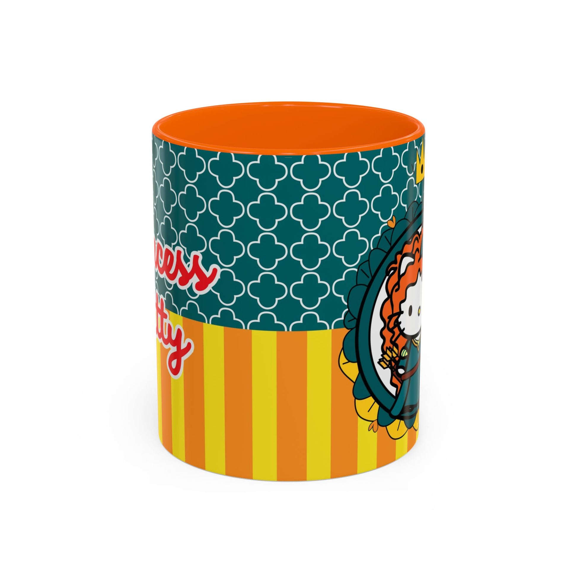 Bright, playful ceramic mug that brings a touch of storybook charm to morning coffee. The glossy white body contrasts with a colored interior and handle, while vivid, high-quality printing wraps around the mug in crisp, saturated tones. The design features a whimsical, red-haired princess illustration set against patterned teal and warm yellow-orange stripes — a cheerful blend of nostalgia and modern pop color. Comfortable C-shaped handle and two size options let you choose the right sip for your routine. Durable and safe for everyday use at home or the office.