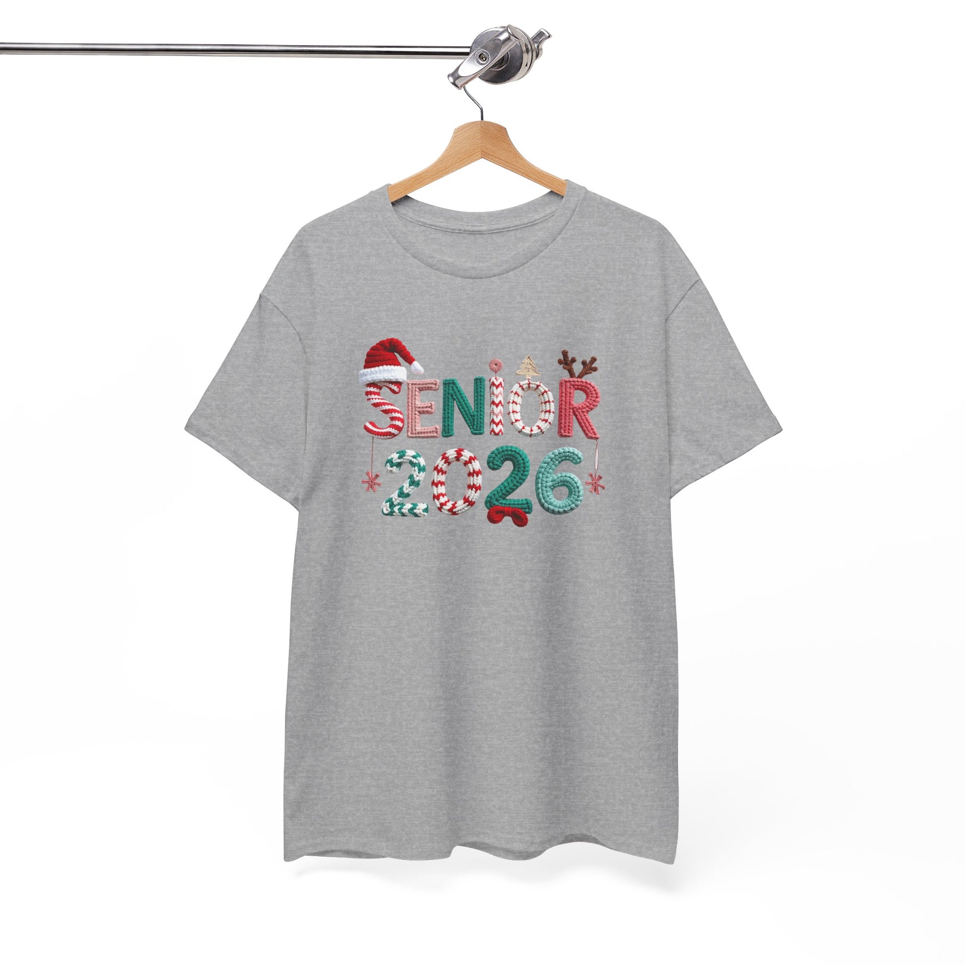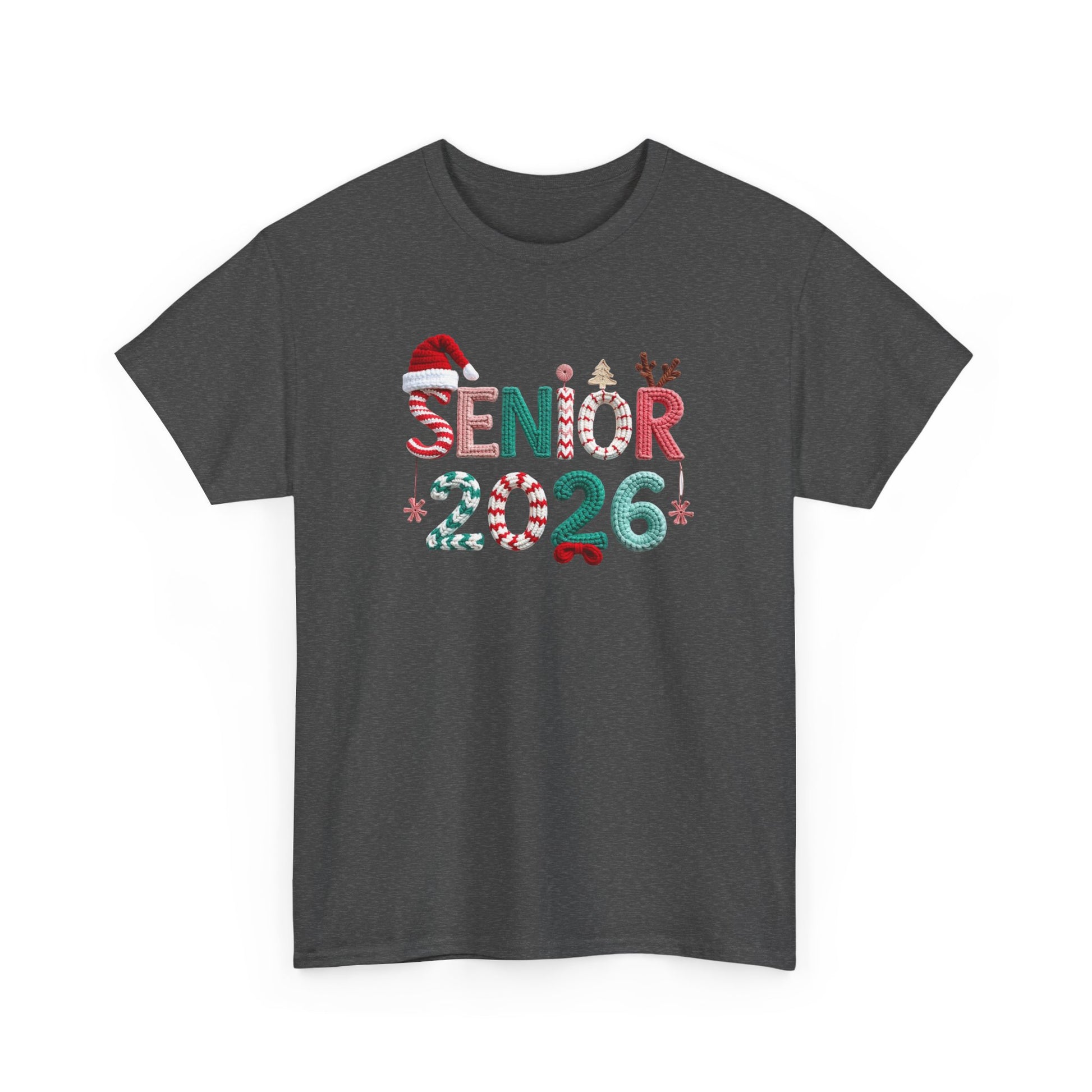 Celebrate final-year pride with a cozy, festive tee that speaks to late-night study sessions and holiday-season memories. This classic crew shirt carries a playful holiday-themed “Senior 2026” design—complete with candy-cane stripes, holly, a Santa hat, and seasonal accents—so it looks spirited at school events, family gatherings, and end-of-year parties. Lightweight but durable, the cotton fabric holds print detail nicely and wears comfortably during layering or on its own. Wear it to graduation fundraisers, winter pep rallies, or while wrapping gifts with friends—this shirt brings a warm, nostalgic vibe to the moments that matter most in a senior year.