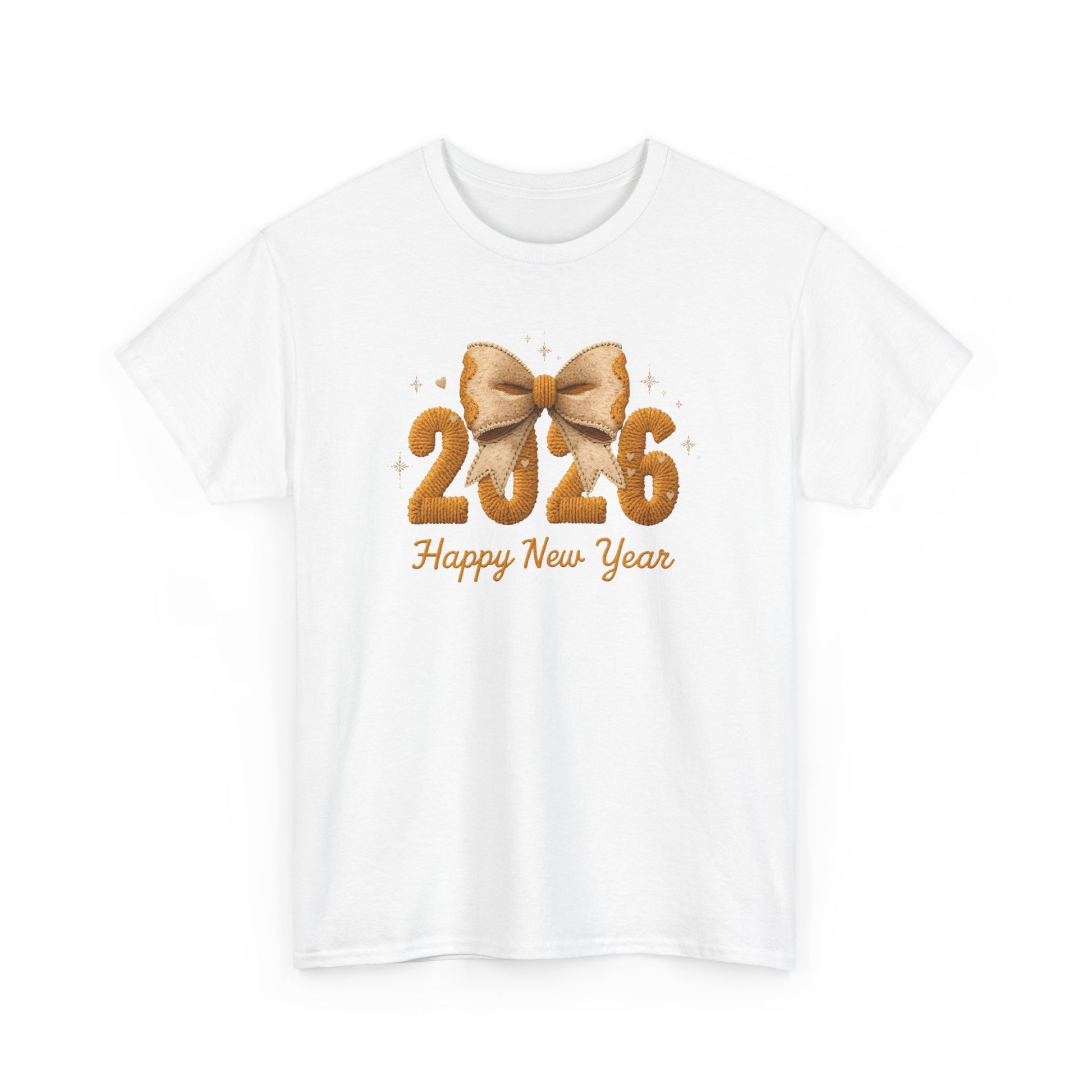Celebrate the turn of the year with a soft, wearable keepsake that carries a quiet shimmer. This lightweight cotton tee features a warm, golden 2026 design crowned by a satin-style bow and a subtle “Happy New Year” script beneath. It sits like a friendly companion at casual gatherings, low-key countdowns, and morning-after brunches — the kind of shirt you reach for when you want festive, not flashy. The clean white background makes the gold artwork pop, while the classic crew cut and relaxed fit keep the mood comfortable and familiar. Wear it to welcome new beginnings, to remind a loved one of a shared midnight toast, or to tuck into a relaxed holiday outfit that still feels celebratory.