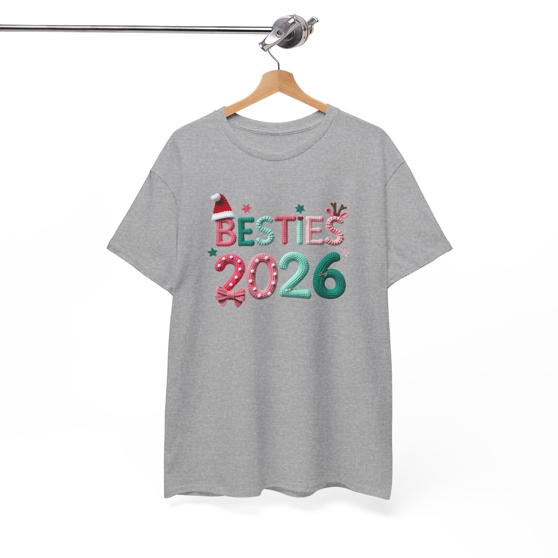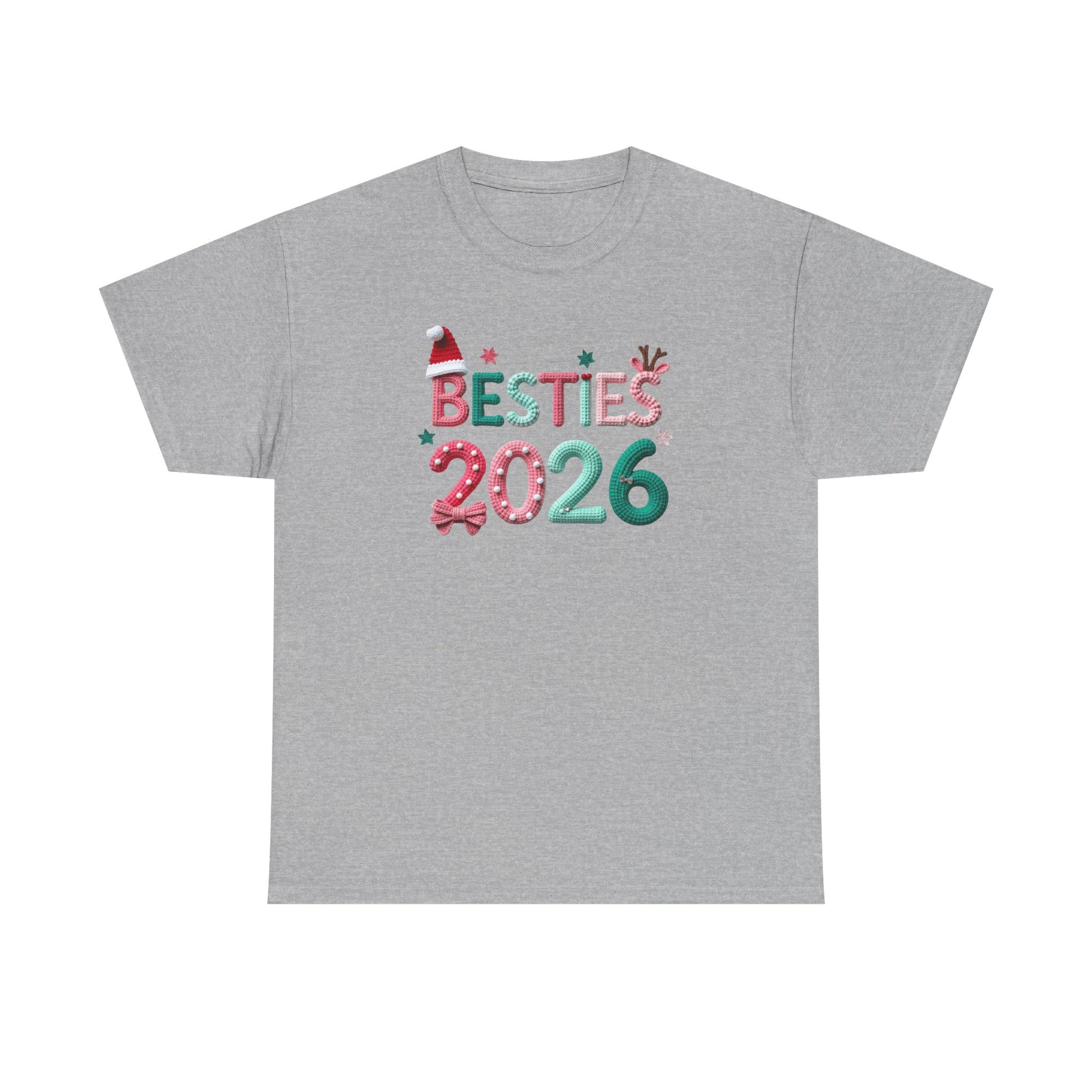 Celebrate friendship with a playful, seasonal tee that reads “BESTIES 2026” in festive candy-cane and holly-accented lettering. The design sits cleanly on a classic white shirt, giving it a bright, cheerful look that’s easy to wear to holiday parties, December outings, or cozy photoshoots with your closest friends. Lightweight but durable cotton holds vibrant DTG and DTF prints so the colors stay crisp through washes. Soft, tear-away label and a relaxed crew neckline make it comfortable for long days of gift exchanges, cookie baking, or strolling through twinkling streets. This shirt slips into friend-group traditions — matching for a night out, twin looks for holiday cards, or a casual keepsake from a year you want to remember together.