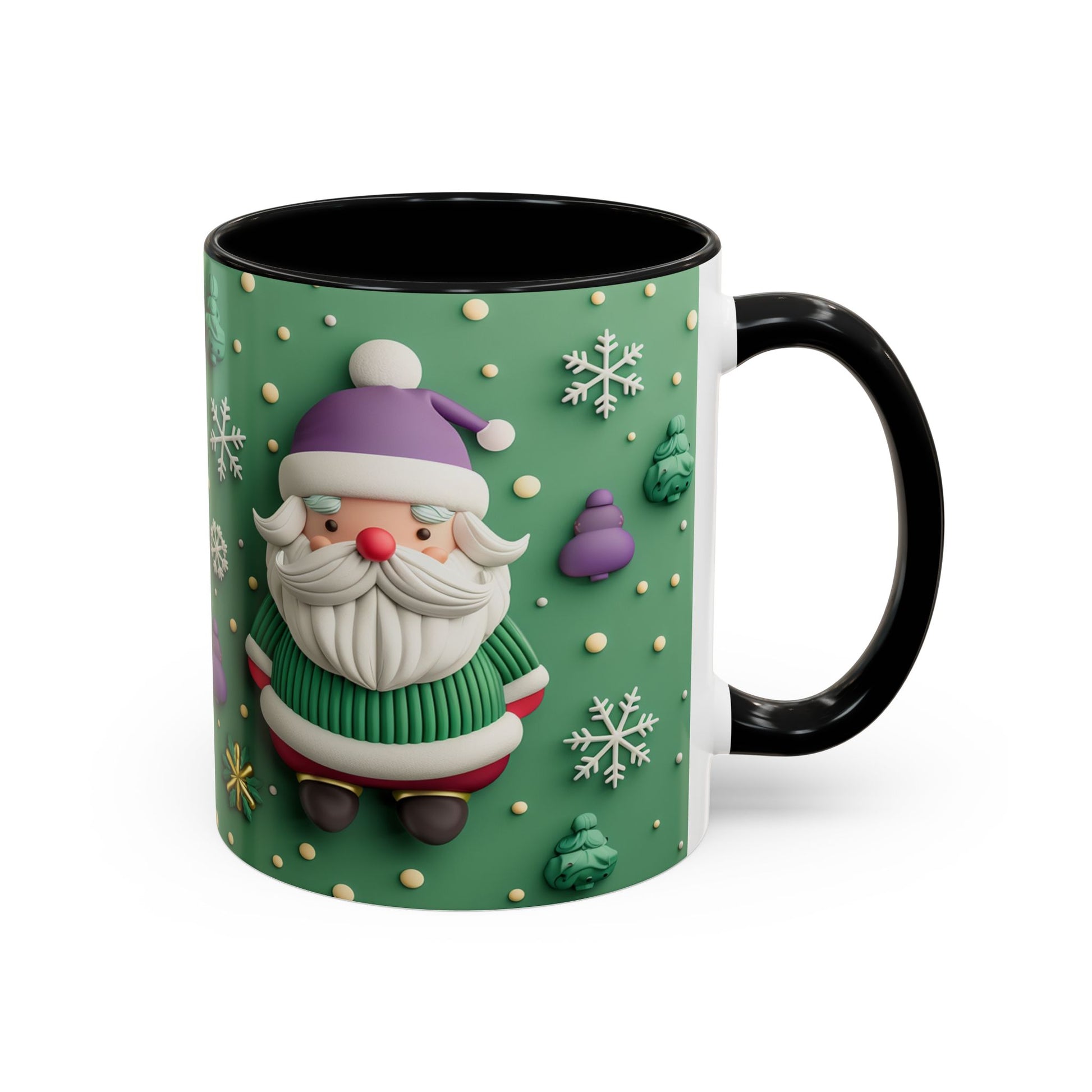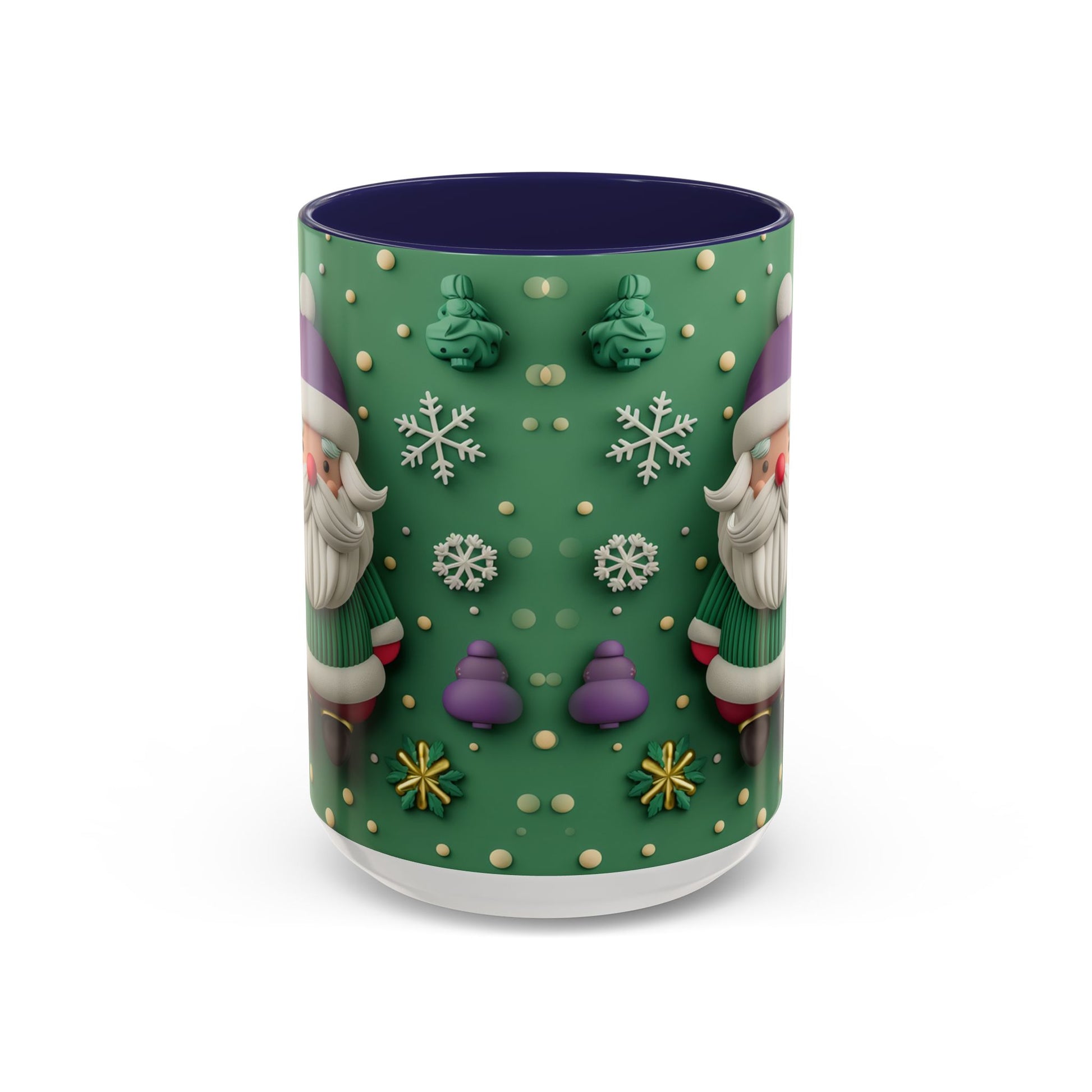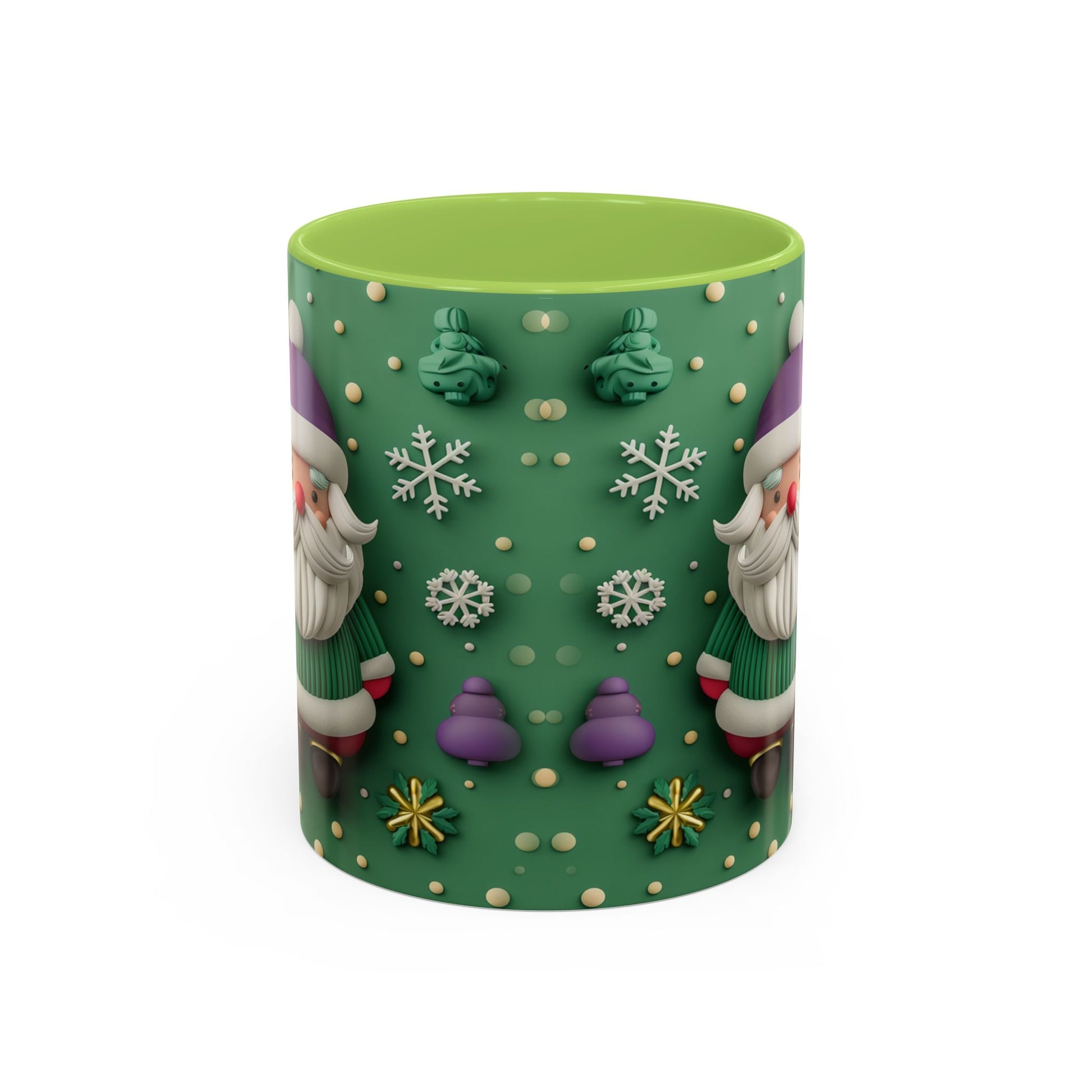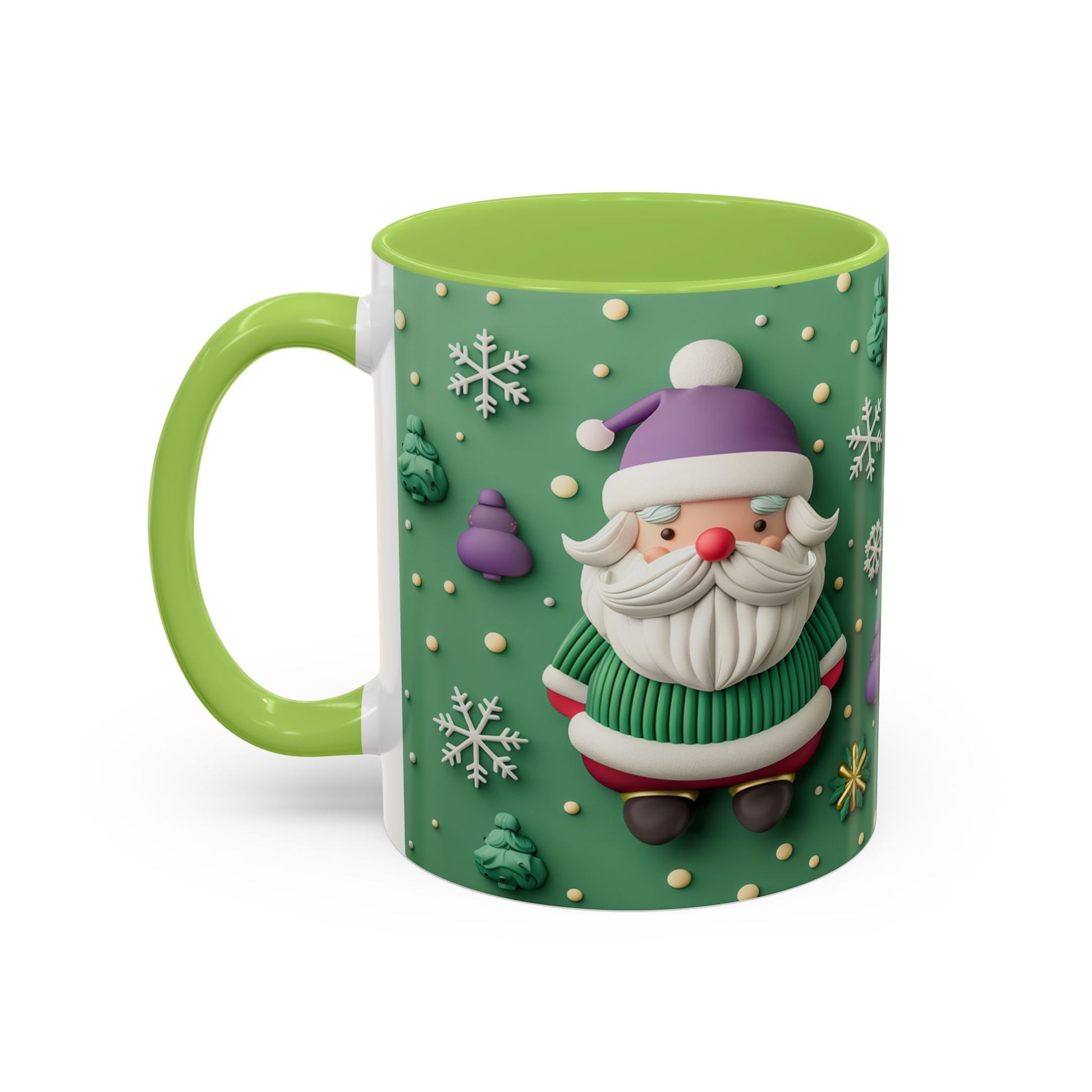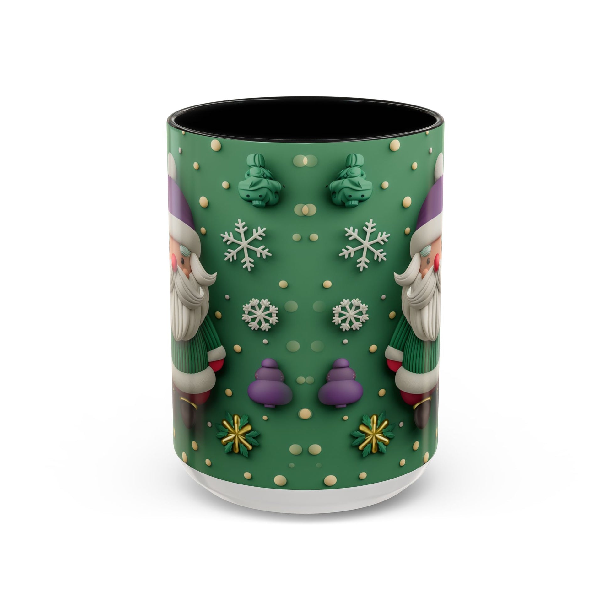 Warm, whimsical, and a little nostalgic — this ceramic mug brings a playful holiday pause to slow mornings and cozy evenings. A cheerful Santa figure in a purple hat and green sweater smiles against a deep, jewel-green background dotted with snowflakes, tiny trees, and ornaments. The glossy contrast between the colored interior/handle and the bright exterior print makes each sip feel festive. It sits on the kitchen counter, warming cold hands between gift wrapping or late-night movie marathons, and adds a bit of handcrafted charm to seasonal routines.