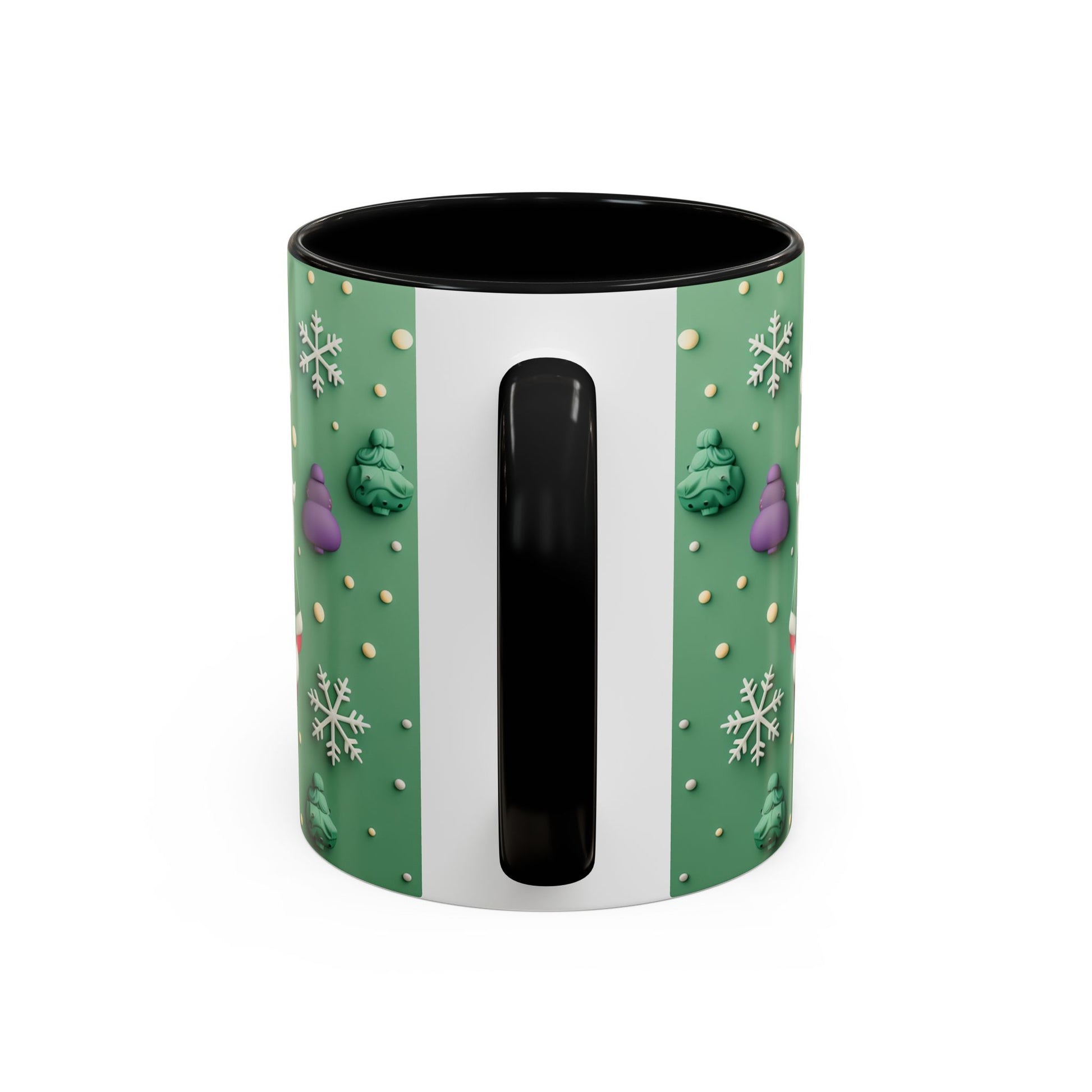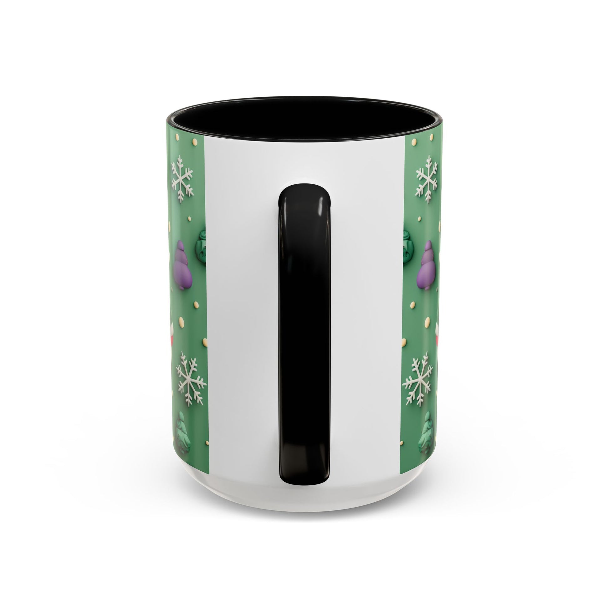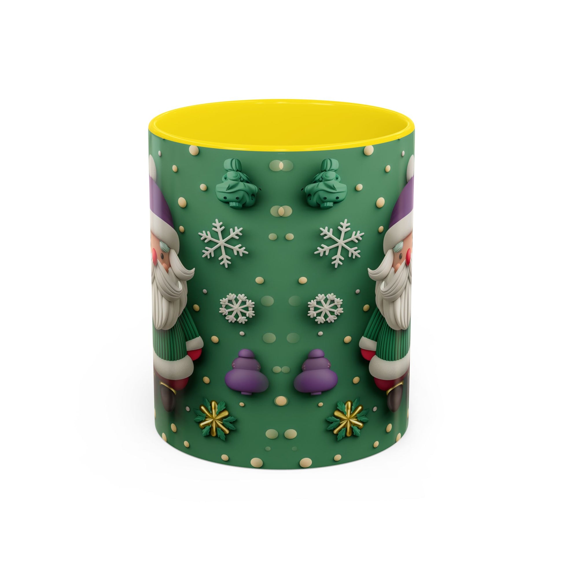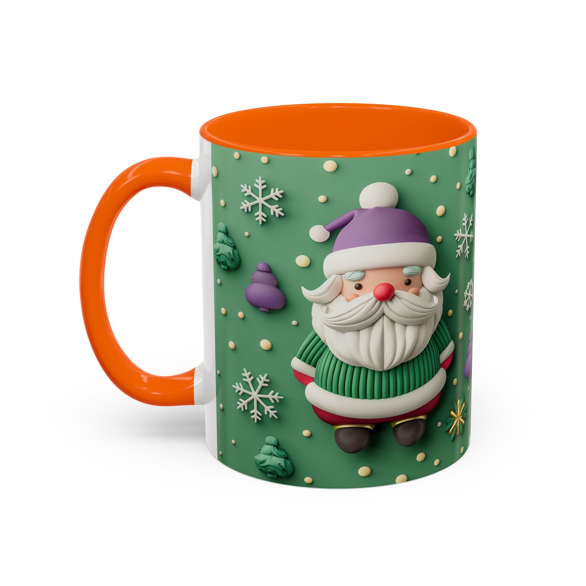 Warm, whimsical, and a little nostalgic — this ceramic mug brings a playful holiday pause to slow mornings and cozy evenings. A cheerful Santa figure in a purple hat and green sweater smiles against a deep, jewel-green background dotted with snowflakes, tiny trees, and ornaments. The glossy contrast between the colored interior/handle and the bright exterior print makes each sip feel festive. It sits on the kitchen counter, warming cold hands between gift wrapping or late-night movie marathons, and adds a bit of handcrafted charm to seasonal routines.