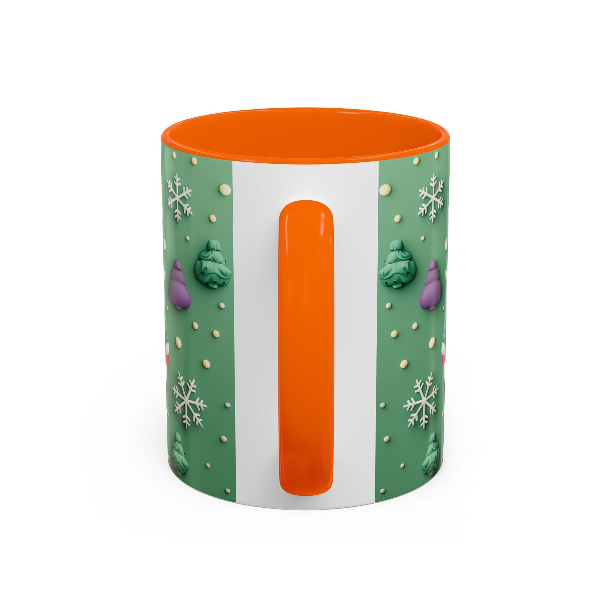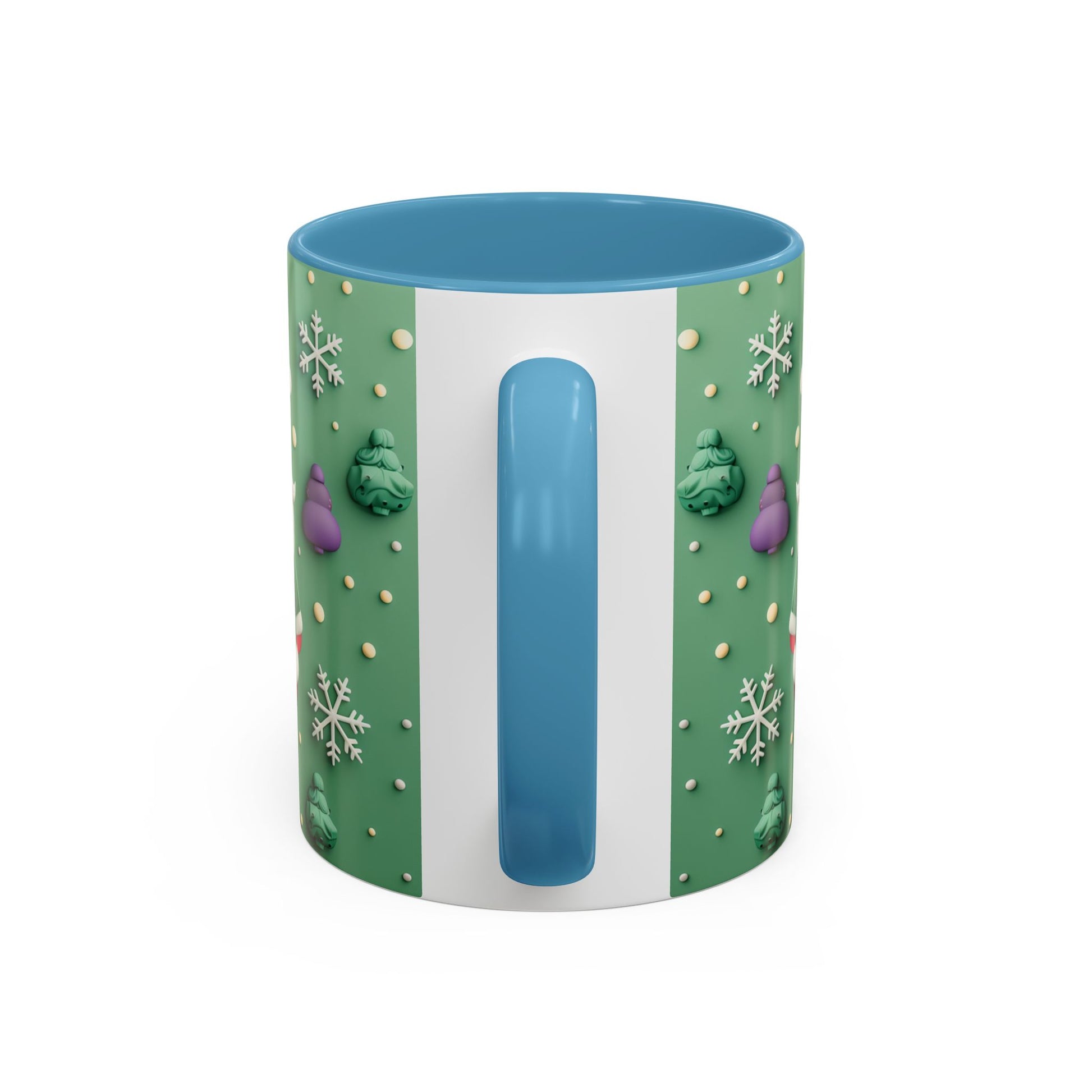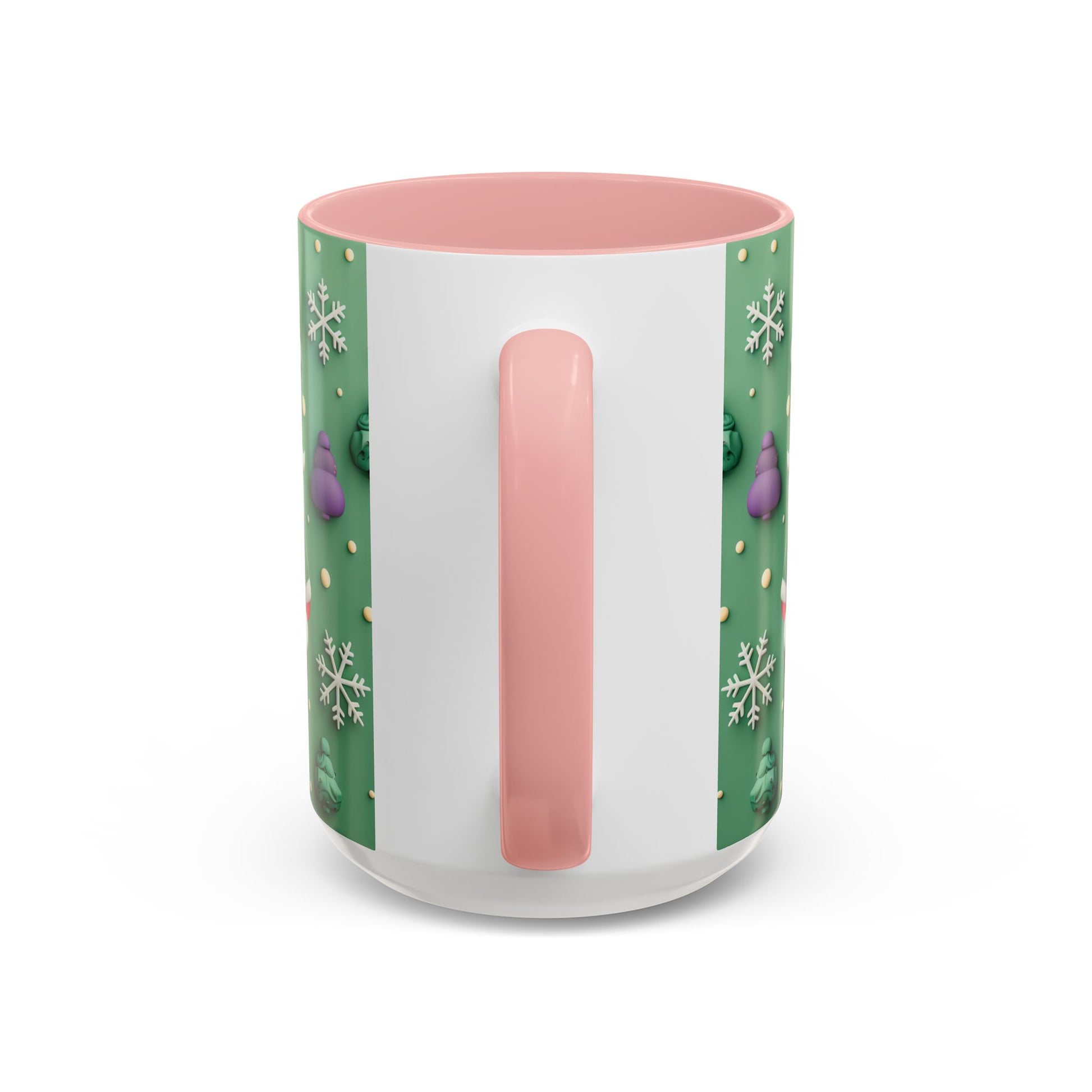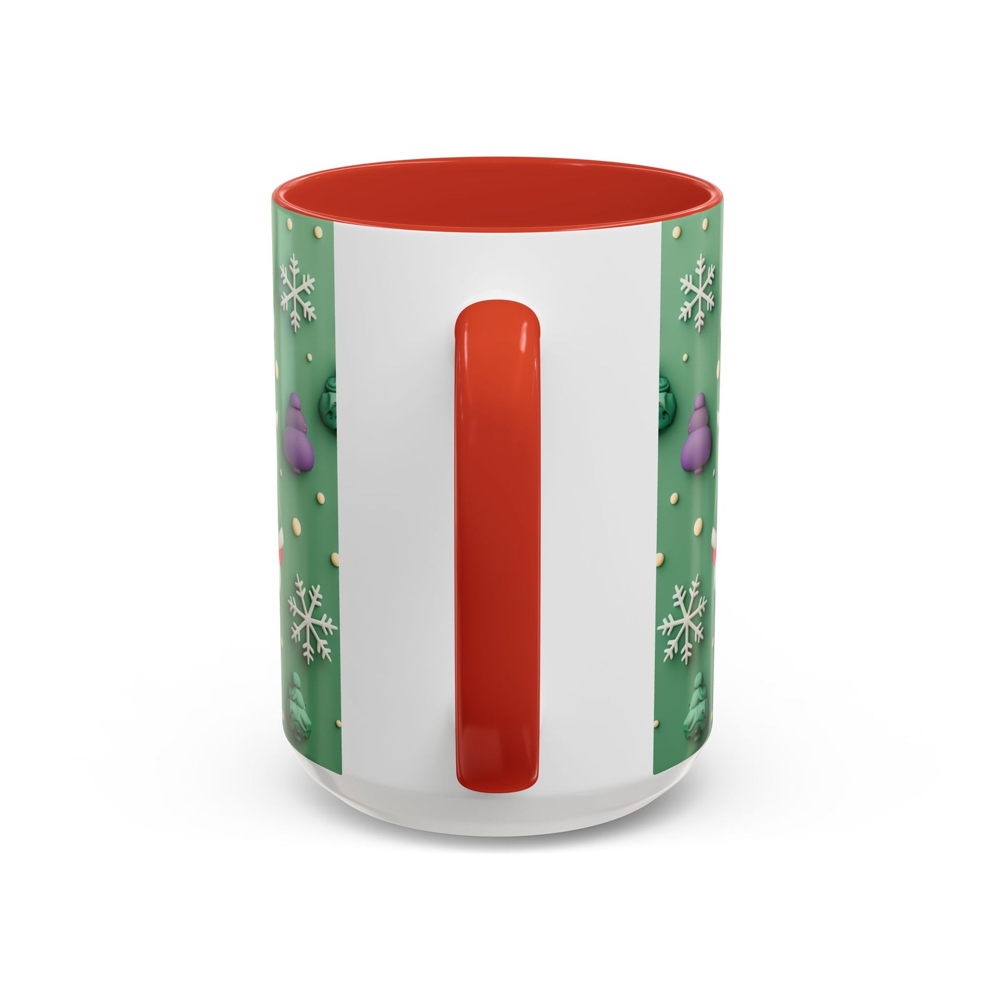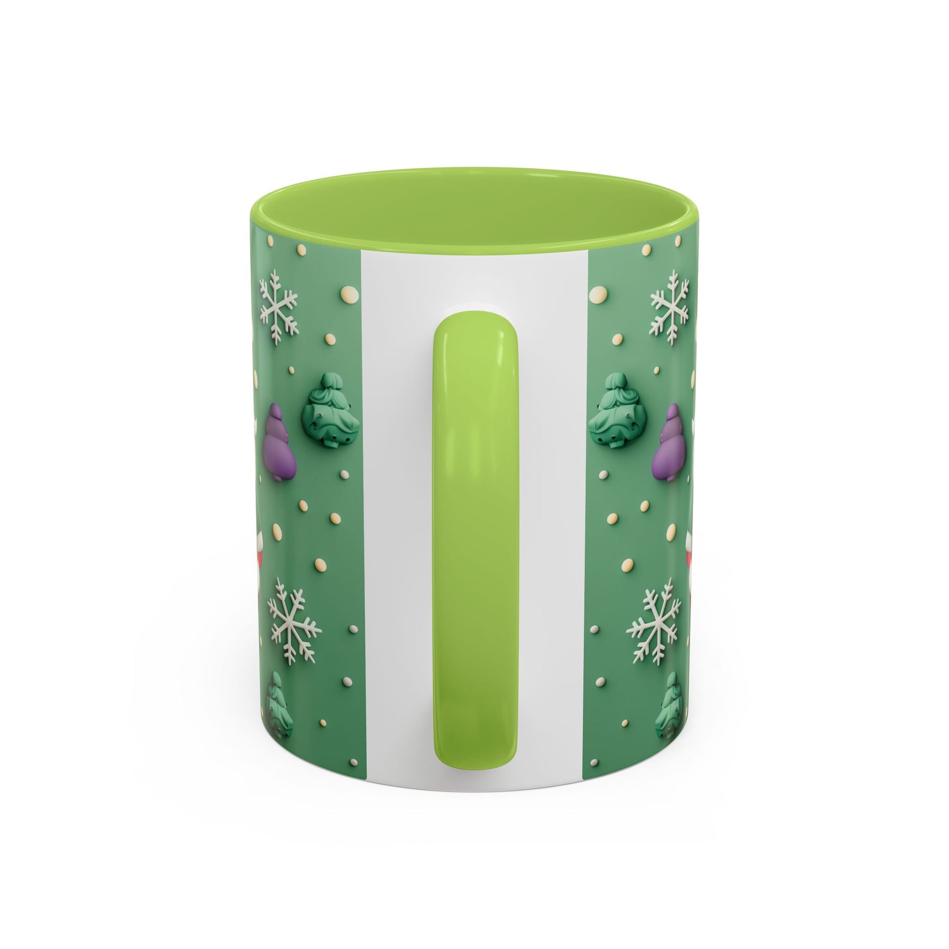 Warm, whimsical, and a little nostalgic — this ceramic mug brings a playful holiday pause to slow mornings and cozy evenings. A cheerful Santa figure in a purple hat and green sweater smiles against a deep, jewel-green background dotted with snowflakes, tiny trees, and ornaments. The glossy contrast between the colored interior/handle and the bright exterior print makes each sip feel festive. It sits on the kitchen counter, warming cold hands between gift wrapping or late-night movie marathons, and adds a bit of handcrafted charm to seasonal routines.