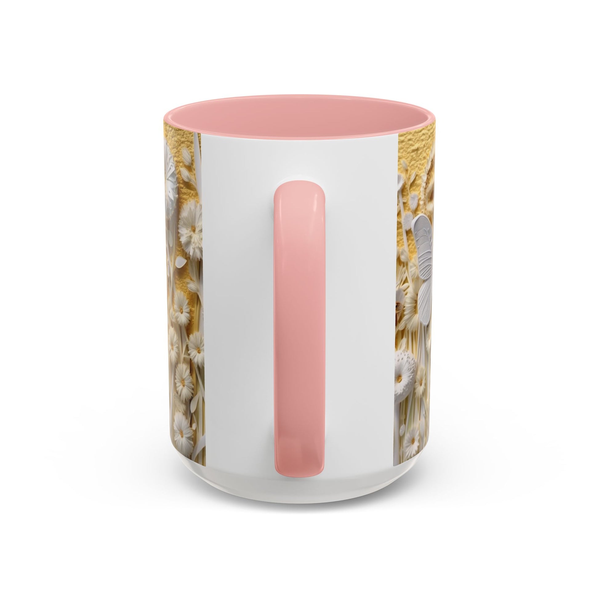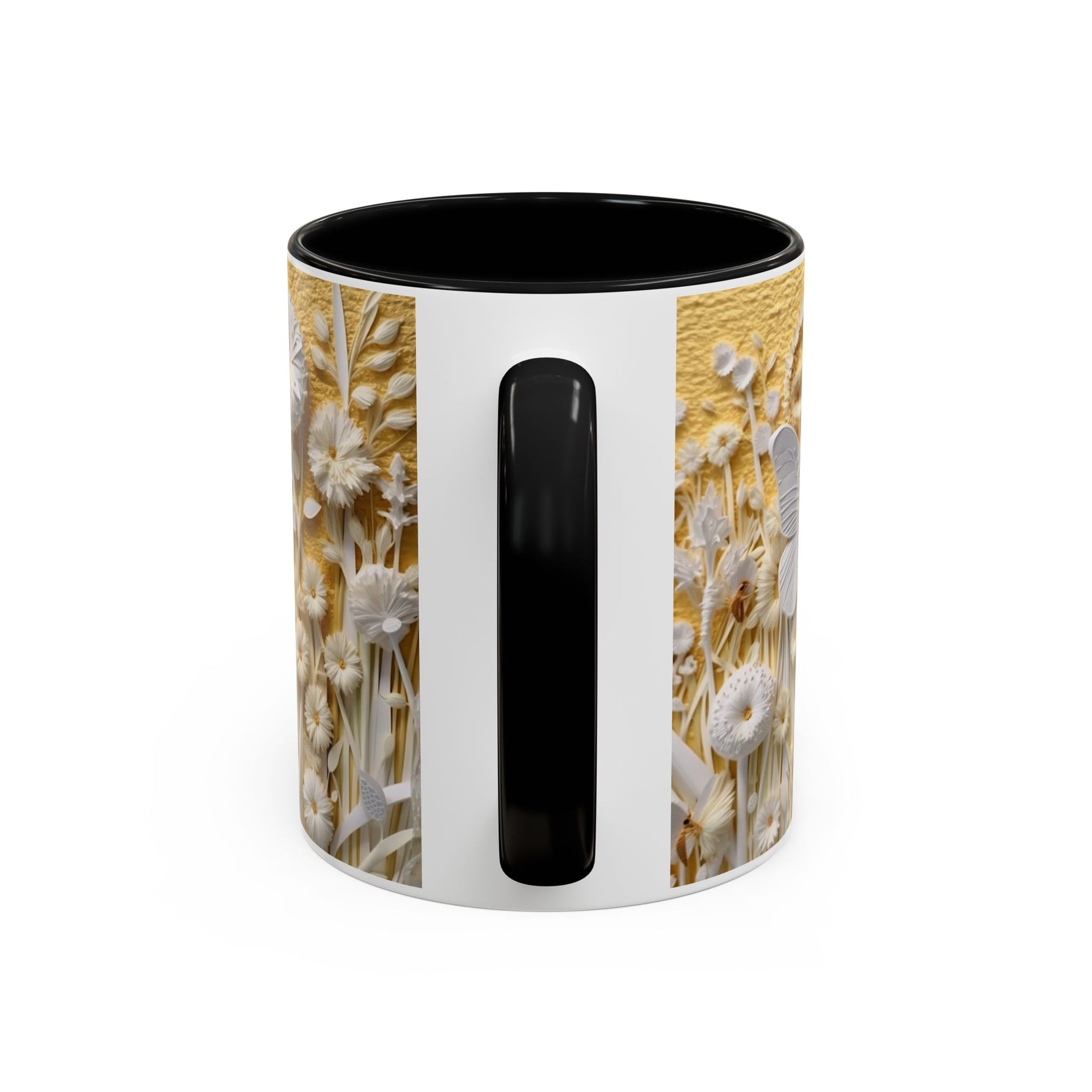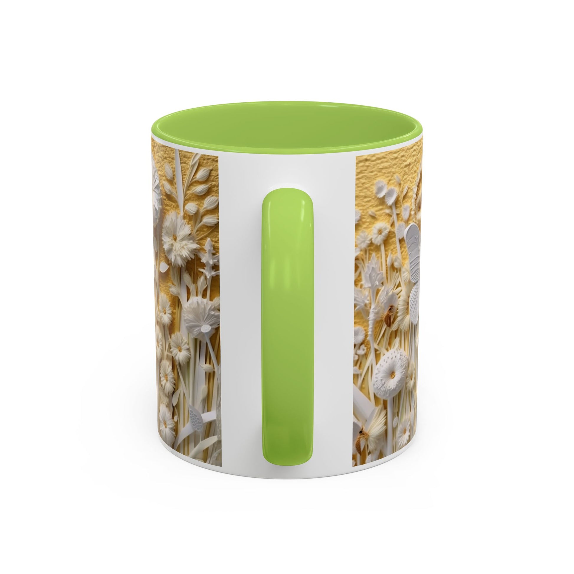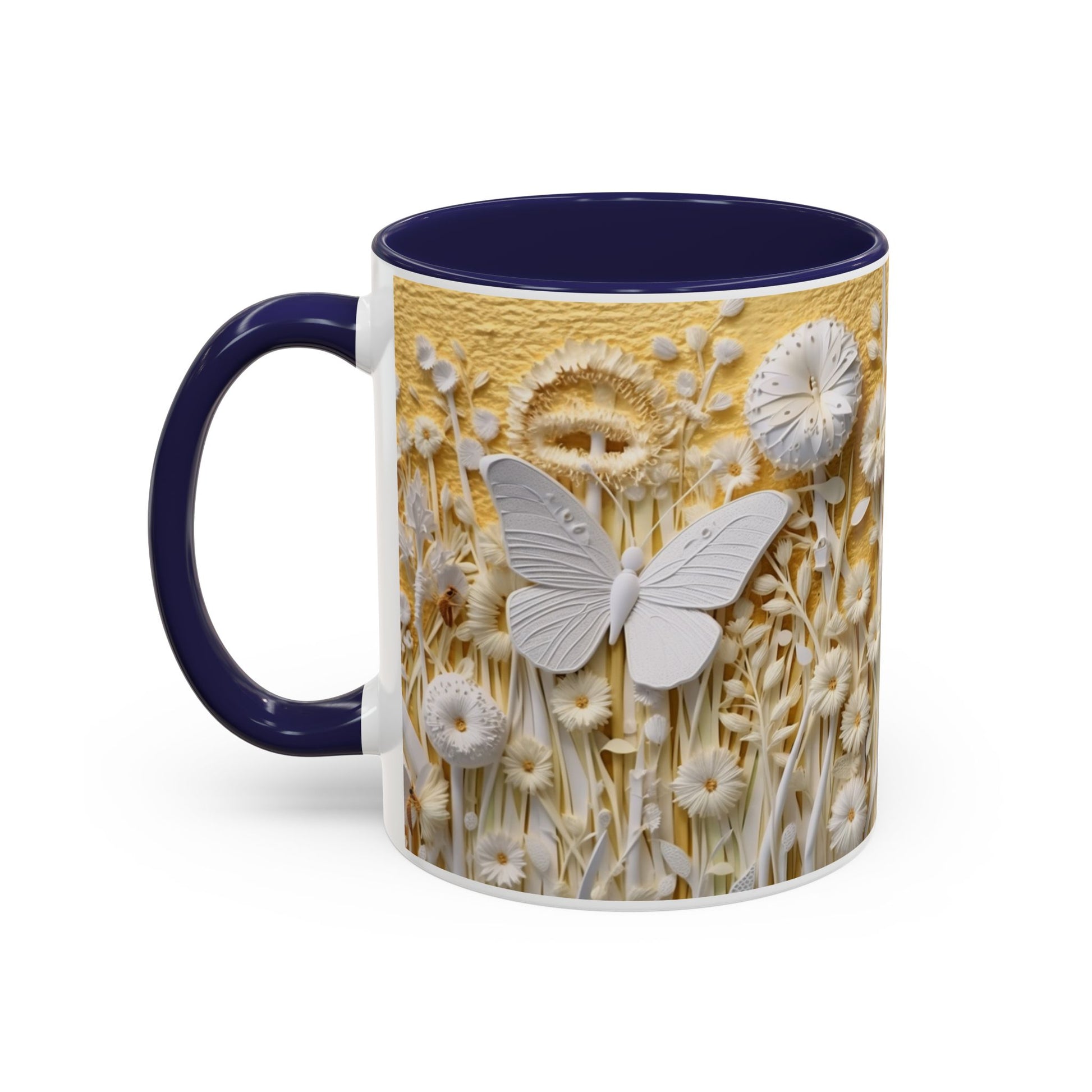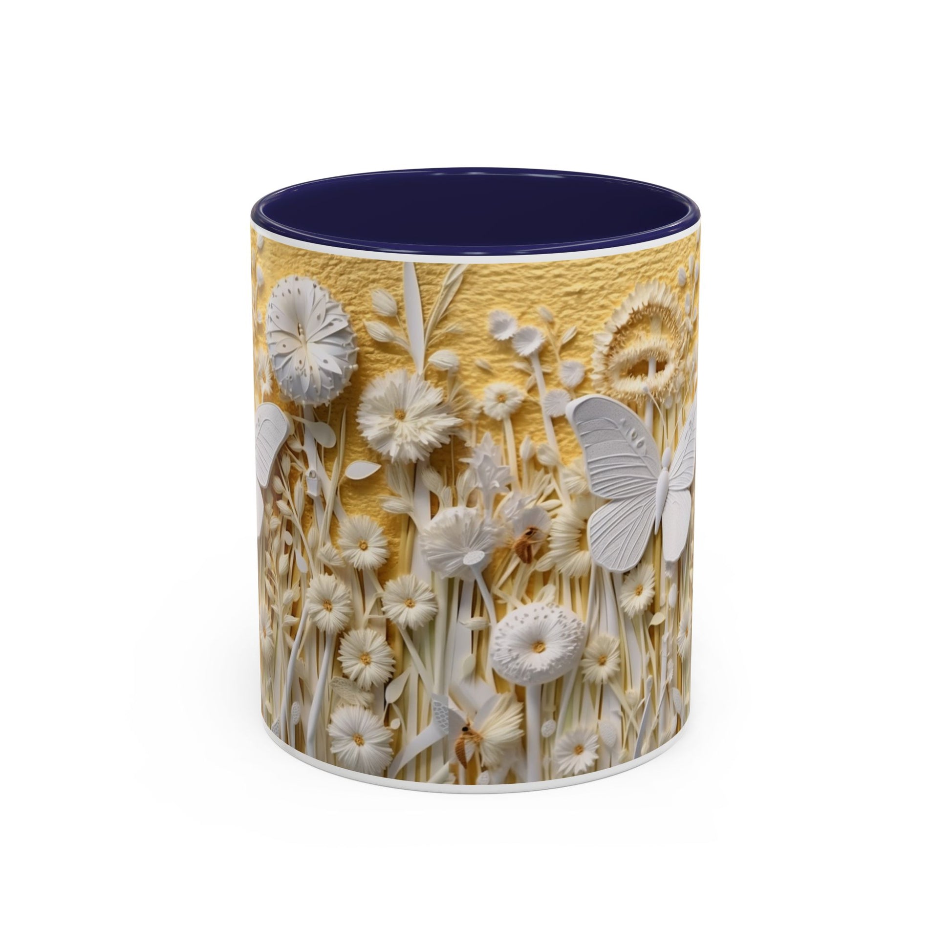 Warm sunlight poured over a wildflower meadow — that’s the moment this ceramic mug captures. Delicate sculpted blooms and a soft butterfly motif rise in creamy relief against a honeyed yellow backdrop, while the colored interior and handle add a bold, modern pop. It feels calm and thoughtful in your hands, an invitation to slow down with a morning coffee or an evening tea. The glossy finish catches light like dew on petals; the design is both artful and comforting, suited for someone who loves nature’s little details and gentle, tactile beauty.