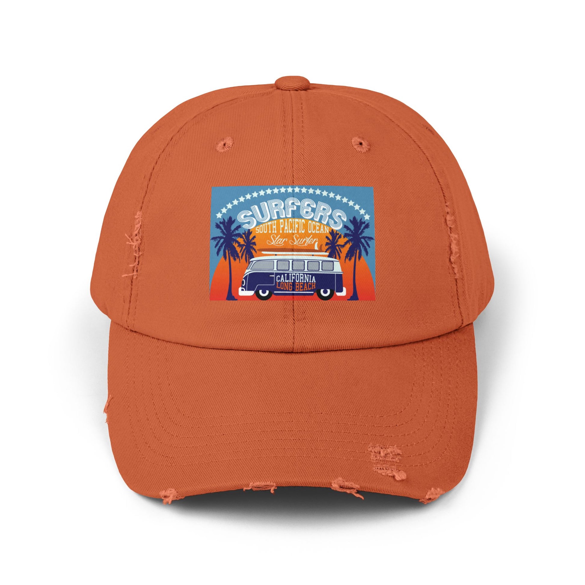 This distressed cotton twill cap brings laid-back beach days to everyday wear. Sun-faded tones and intentional wear marks give it a well-traveled look, while a vibrant surf-themed print—classic van, palm silhouettes and a warm sunset palette—adds a nostalgic coastal vibe. The low-profile, unstructured shape and D-ring hideaway strap let it sit comfortably for long walks on the boardwalk or slow mornings at a seaside café. Small variations in distress and color make each hat feel like it’s already part of your favorite summer memory.